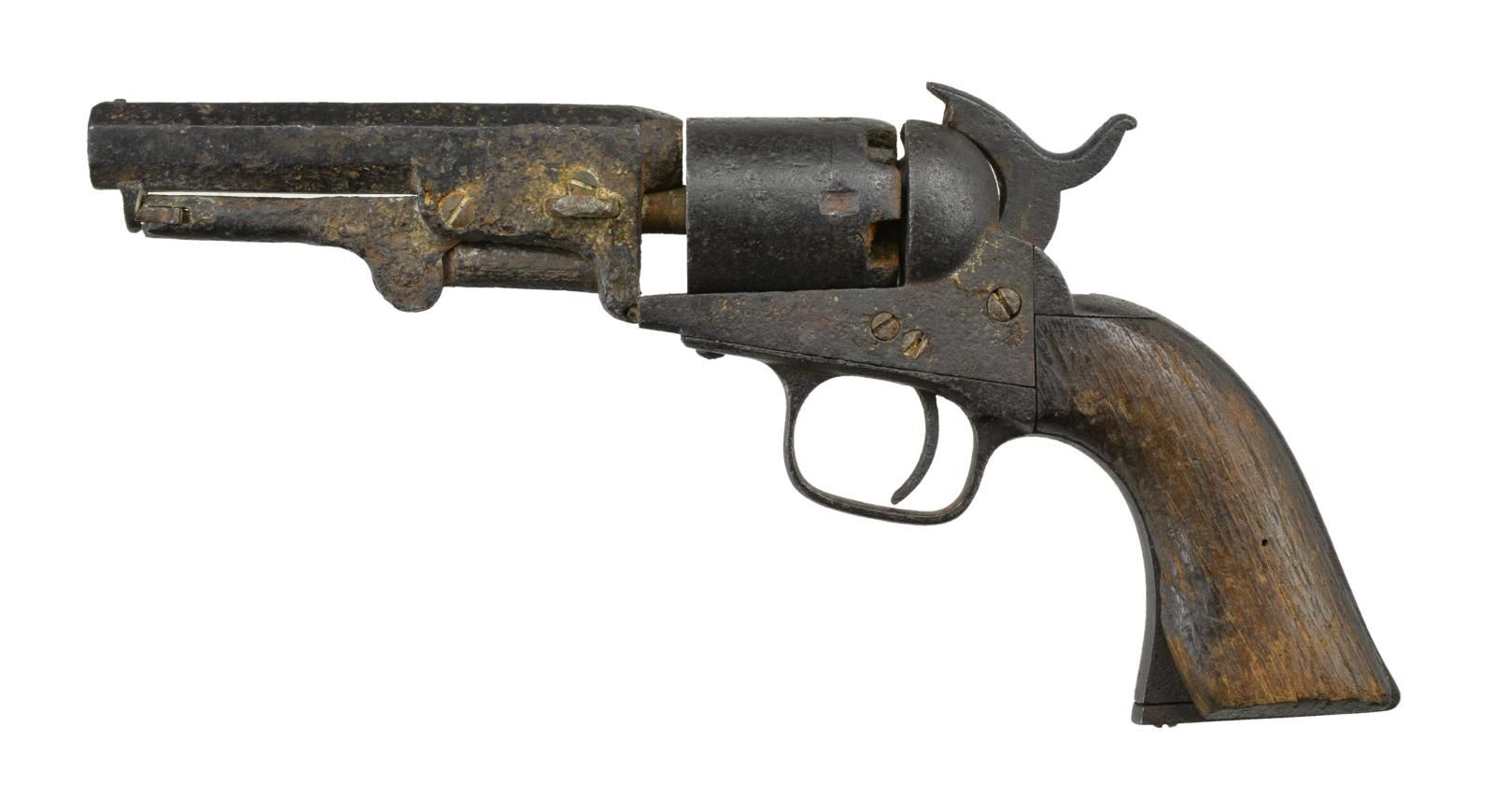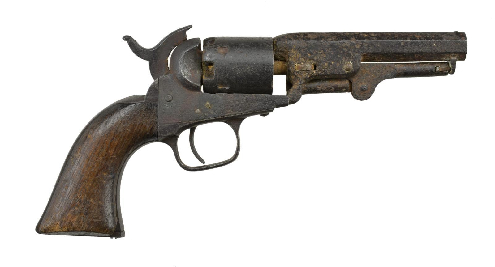 Cal. 31. S# 5207. Bbl. 4" octagon. This Colt Pocket is in excavated condition but the location where it was found has been lost. It has a 5 shot cyl. & the bbl. markings cannot be seen. The S# can be discerned on a few parts but not on all. The 2 pc. wooden grips are intact. CONDITION: revolver has an overall heavily oxidized finish. The grips have minor losses & show the effects of being underground. The cyl. does move but the hammer is frozen in place. Poor bore. (01-21133/BF). ANTIQUE. $200-400.