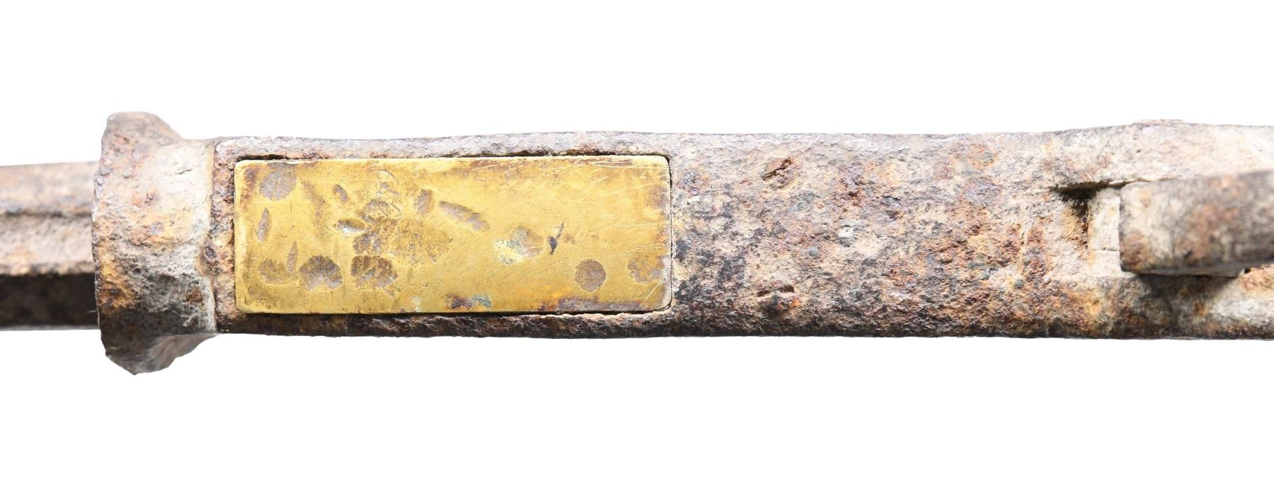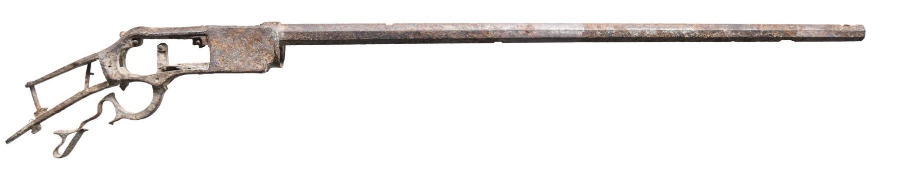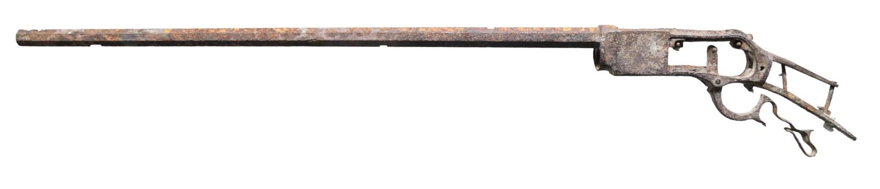 RIFLE. Cal. 45-60. NSN. Bbl. 28". Excavated relic condition Model 1876 lever action rifle mfg. by Winchester. Original factory markings are illegible, save for on the brass elevator, which exhibits a partially legible "45-60". Frame is bent inward on both sides of the bolt/elevator slot. Lever exhibits warping and a loss on the underside towards the front of the loop, with the bottom half of the trigger no longer being present. Sights, mag. tube, sideplates, internals, hammer, and wood furniture are absent. CONDITION: metal components retain a dark gray patina, exhibiting heavy pitting overall, with scattered spots of oxidation, and some areas of dirt overall. Elevator exhibits scattered impressions on the underside and retains areas of pleasing brown patina overall. Action is frozen and is non-functional. (01-27005/MLW). ANTIQUE. $200-400.
