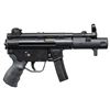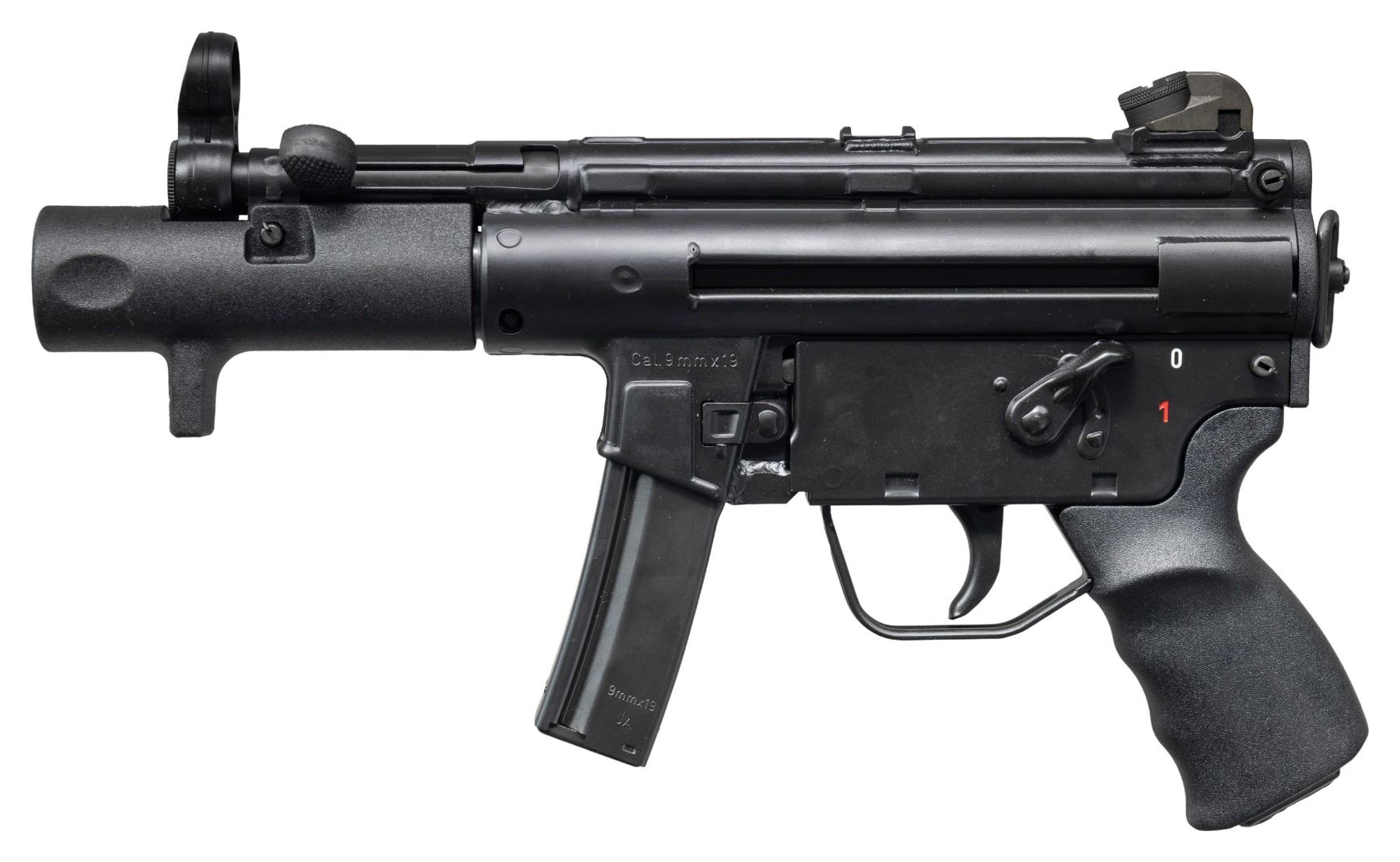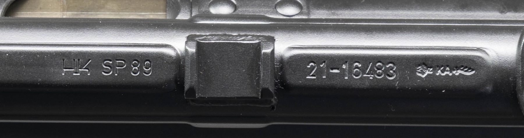 AUTOMATIC PISTOL WITH FACTORY SHIPPING BOX. Cal. 9x19mm. S# 21-16483. Bbl. 4 3/4". SP89 semi-automatic pistol mfg. in West Germany by Heckler & Koch and imported by HK Inc. in Sterling, VA in 1990. The SP89, introduced circa. 1989, was produced by Heckler & Koch in response to the ATF restricting the importation of the HK94 after it was deemed to not serve a "sporting purpose". The SP89 was short lived, with less than 16,000 pistols believed to have been imported prior to the implementation of the 1994 Crime Bill, which banned its importation. The left side of the mag. well is marked with the cal. designation, with HK's mfg. and importer information marked on the right. Top of the receiver is marked "HK SP89", followed by the S#, as well as a triad of proofs consisting of an Eagle/N commercial nitro proof (repeating on bbl. and bolt), a "KA" (90) date code, as well as an Ulm Proof House antler. Steel 2-position trigger pack housing is marked "0" and "1". Metal components exhibit a black enamel finish overall, save for on the bolt carrier, rear sight assembly, and trigger pack, which exhibit a phosphate finish. 1-piece single pin black synthetic handguard (extending approx. 1 3/8" past the unthreaded muzzle) with integral hand stop, thumbrest pistol grip, and receiver end cap with sling swivel and loop. Standard SP89 pattern post front sight and 4-position drum rear sight. Handguard, receiver end cap, and bolt exhibit a "JA" (90) date code ("J" used in place of a "K" on parts excluding the receiver). MAGS: 1 HK 20-rd. mag., marked with a "JA" (90) date code. UNATTACHED ACCESSORIES: factory shipping box (shipping label showing shipment from Heckler & Koch) containing styrofoam insert, factory manual, as well as a printed piece of material briefly detailing the importation history of the SP89. CONDITION: near new, with metal components retaining virtually all of their original factory finishes overall. Trigger pack housing exhibits a light dragline. Brilliant mirror chrome lined bore, retaining sharp and well defined rifling throughout. Proper manual mechanics. Polymer furniture is excellent overall. Box shows some light exterior wear, but otherwise remains sound. An exceedingly fine example of a Heckler & Koch SP89 pistol that would be find virtually impossible in terms of condition to upgrade from. (25-2863/MLW). MODERN. $3,000-5,000.