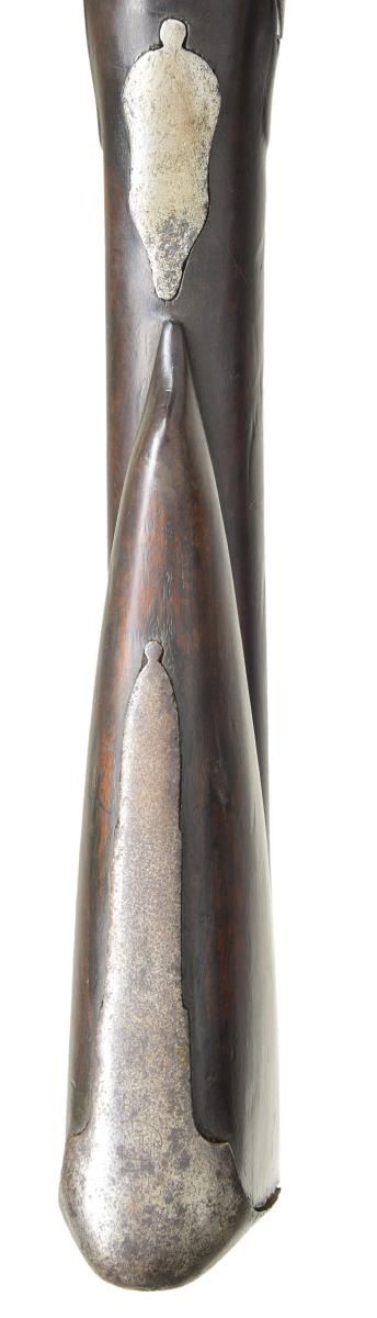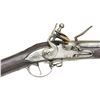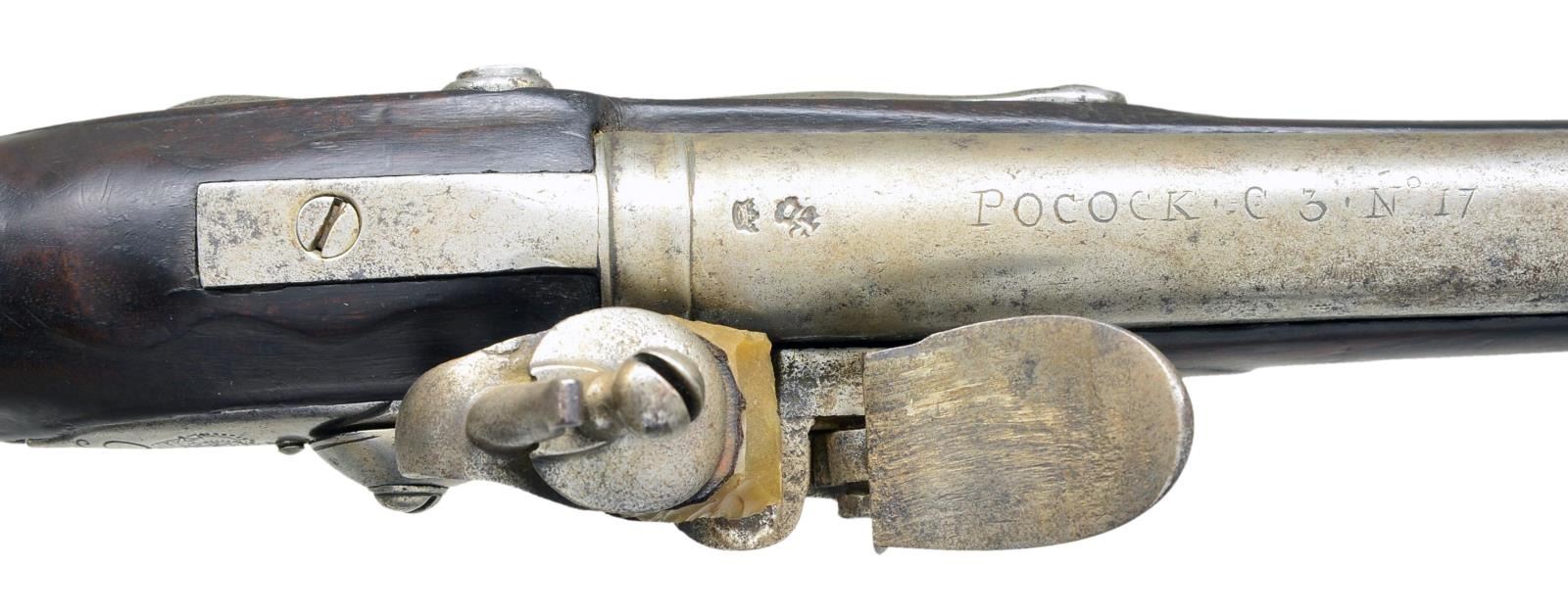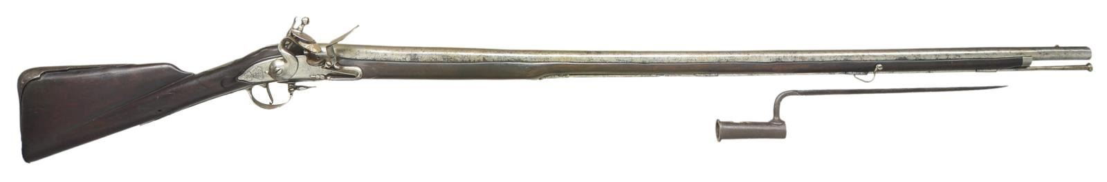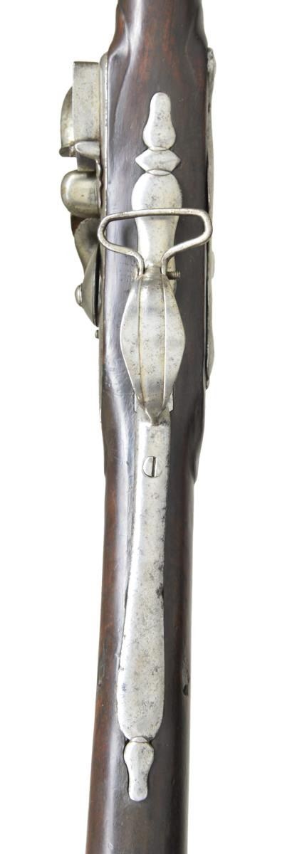 BRITISH PATTERN 1718 IRON MOUNTED MUSKET (PRE FIRST MODEL BROWN BESS) REGIMENTALLY MARKED FOR POCOCK COMPANY 3 (KING'S REGIMENT OF FOOT) W/ BAYONET. Cal. 78. NSN. Two other examples of this very rare early 18th century musket are known, one being at Colonial Williamsburg while the other is in the West Point Museum. This musket has 45 1/2" rnd. bbl. pinned to stock. Rear portion is stamped with British proofs and engraved "Pocock, C3 No 17". Lock with arched rounded plate has inset rounded pan, unbridled frizzen and feather spring with long flame finial. Exterior of lock is not maker marked, interior is stamped "BO" in rectangular cartouche. Rear portion of lock is engraved with royal crown over the initals, "G. R." in script. Lock is fitted with lg. rnd. bodied serpentine cock with top jaw that has short notch to align it with spur. Very early style walnut "handrail" stock has deeply fluted comb with Ogee transition to grip. Raised carved fields with tear drop terminals at rear are around front and back of lock and sideplates. Bbl. tang is also outlined. There is a pronounced palmswell at thimble. Stock extends to within 4" of muzzle and has steel cap. Pin of sling loop also helps secure stock to bbl. All furniture is of iron. Trigger guard with very distinct 1st model "Brown Bess" type finial, has fluted trigger guard bow unique to this model. Iron buttplate with pronounced rounded heel has long spear type top strap which is engraved "MAJrs Comp y". There is an iron escutcheon at top of grip which is unmarked. Sideplate is of early 1st model serpentine type. Steel ramrod with button head is held by 3 small-beaded iron pipes and thimble. UNATTACHED ACCESSORIES: early style unmarked socket bayonet with 13 1/2" triangular blade fits musket fairly well. CONDITION: good, original flint. All metal parts cleaned to an attractive silver and gray with considerable dark scattered pitting, mostly on bbl. Stock with old refinish, sharp details lost, some dents and losses with filler. Butt shows considerable shrinkage with metal of plate considerably above wood. Otherwise stock appears sound. Lock fits well and is operable. Bayonet is good, nearly all dark brown heavy patina. John Pocock became a colonel in the British army in 1707. At the time this musket was made (ca. 1721), the King's regiment was posted to Ireland and served there until 1727. At this time Pocock was promoted to Brigadier-General. He died in 1732. In the 1740s, the regiment was posted to Flanders and then to Scotland, where it fought in the battle of Falkirk, as well as Culloden. In 1751, the King's became the 8th Regiment of Foot and saw service in the 7 years war. During the American Revolution, the 8th regiment of foot was active and stationed in Canada and other posts on the Great Lakes, including Niagra, Detroit, Oswego, and Michilimackinac. They took part in the action in the battle of Vincennes, Newtown, as well as various skirmishes in the Mohawk Valley. PROVENANCE: The Estate Collection of Gary Parietti. (01-19062/MGM). ANTIQUE. $10,000-20,000.