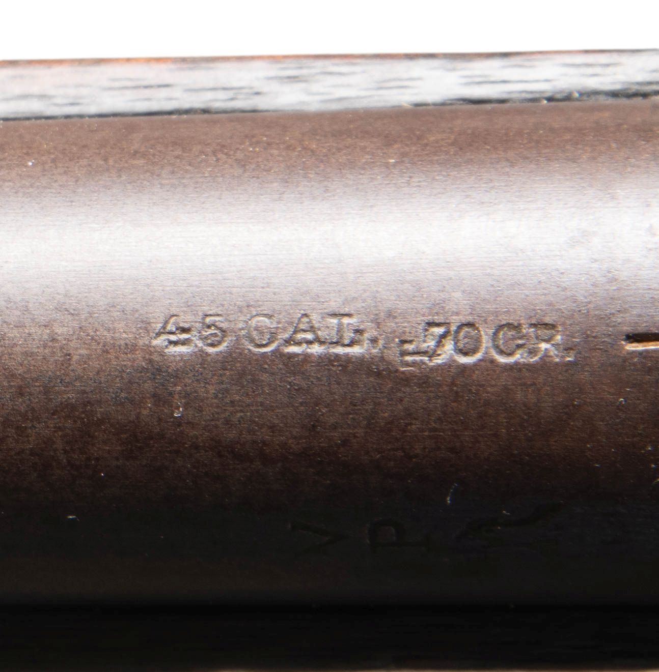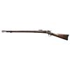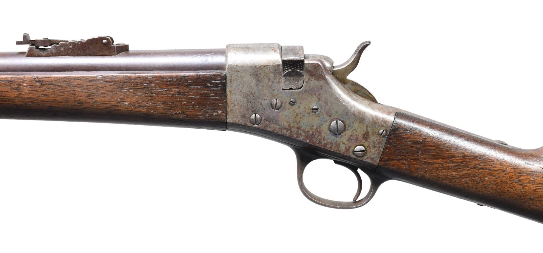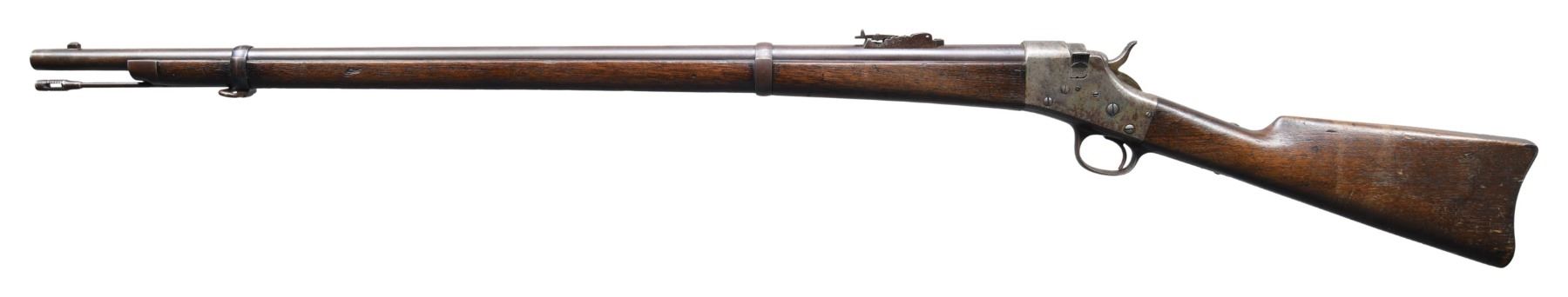 SINGLE SHOT MILITARY RIFLE. Cal. 45 CAL. 70 GR. (45-70). S# 5535. Bbl. 32 3/8" rnd. Page 631 of Flayderman's 9th edition states that while estimated production of 15,000 military rifles of total production of 25,000 in all styles, a "Great majority made under contract for Central and South American Countries; small quantities sold to State Militias." Additionally, "An American martially marked specimen with markings on barrel VP over eagle .45 caliber-70 Gr. would be considered quite rare and command a substantial premium. Rarely encountered in any variation". Bbl. marked on top "45 CAL -70 GR." and on left "V / P" over eagle proof. Fixed front sight with 500 yard graduated leaf rear sight. Breechloading action, narrow breechblock is hinged on the right side and lifts upward to load. Blue finished bbl. with case colored action. 2-band walnut forearm and straight grip stock with steel musket buttplate. Equipped with a front stacking swivel and slotted tip wiping rod. CONDITION: bbl. blue has faded to a mottled brown. Action retains traces of case colors in protected areas with the balance having a mottled gray/brown appearance showing light marks. Wood shows heavy wear with scratches, marks, and dents, having chipping around the buttplate toe. Sound action. Lightly pitted bore retains intact rifling. (01-27183/DS). ANTIQUE. $3,000-5,000.
