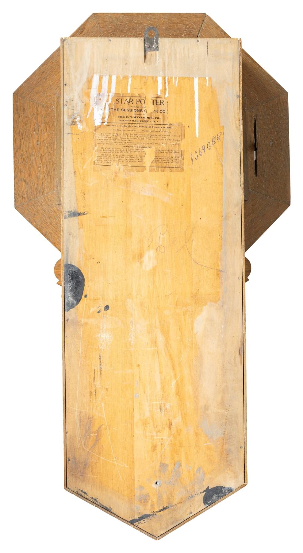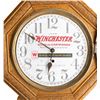 ADVERTISING CLOCK. From one of the finest private clock collections in the United States we offer this Winchester advertising clock. According to the sessions catalog this model was called Star Pointer and was manufactured during the 1920's. It is the rarest of all the Winchester advertising clocks produced by the Sessions Clock Co. as only a few are known to exist! The flawless golden oak case measures 33 inches tall, 18 inches wide, with a brilliant 12 inch original Winchester advertising dial.The clock is 100% original. The eight day movement is stamped sessions and has recently been serviced assuring decades of accurate use. Both glasses are old and wavy. The hands are original as is the pendulum that portrays the "W" logo. All the hardware, hooks and hinges are original. When hanging in your gun room it will attract fellow gun collectors to admire and gravitate to it upon entering the room. (02-25749/KAT). $3,000-5,000.