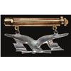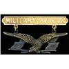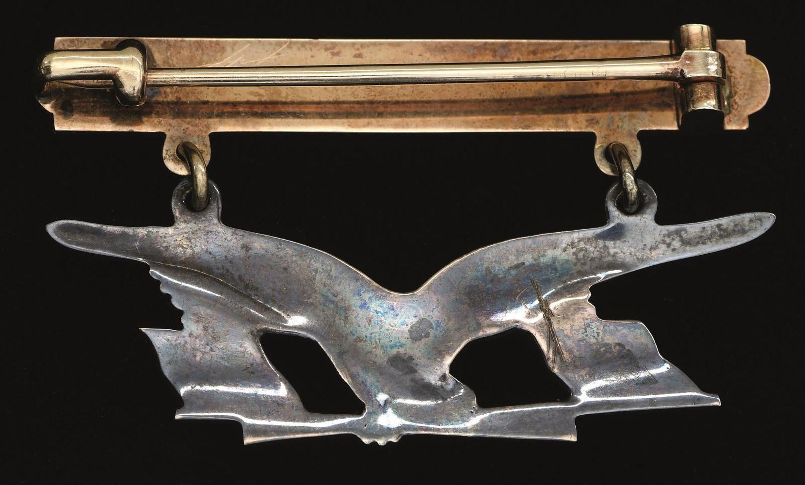 AVIATOR BADGE. This Military Aviator Badge of the WWI era is of a pattern made by the Rock Island Arsenal in 1915 and has a 14-karat gold bar at the top that reads “MILITARY AVIATOR”. Suspended from the bar is a silver in-flight eagle grasping two Signal Corps flags. The left flag has a gold-plated center surrounded by silver, and the right flag has a silver center surrounded by gold plating. The reverse has a T-bar pin with an interesting wire cage-type clasp designed by Rock Island Arsenal. The Military Aviator Badge of the WWI era was originally issued to 24 officers of the fledgling Army Air Corps. According to world-renowned expert, the late J. Duncan Campbell, author of the book “Aviation Badges and Insignia of the United States Army 1913-1946”, this badge is a 1915 variation produced by Rock Island Arsenal with revisions made to the original design, likely for ease of manufacturing. The original 1913 variation is made with inlaid silver sections on the Signal Corps flags. The 1915 variation utilizes gold plating on a silver eagle. The badge was produced as a pattern, making it difficult to establish the exact number originally made. However, it must be considered rare, if not rarer, than the 1913 variation. Early “MILITARY AVIATOR” badges seldom come to market, and the 1915 variation should be considered the rarest of the rare. This may be a once-in-a lifetime opportunity to add an unparalleled piece of aviation history to your collection. UNATTACHED ACCESSORIES: included with this badge is a copy of the original work order from Rock Island Arsenal, dated Nov. 16, 1915, authorizing the production of this badge with revisions. There is even a sketch at the top of the unique clasp design for this badge by Rock Island Arsenal. Email communications between the consignor and the Command Historian of the Rock Island Arsenal concerning this exact badge. CONDITION: badge shows light wear with tarnish to the silver parts of the eagle, and flags are not covered with gold plating. (02-20191/BF). $18,000-25,000.