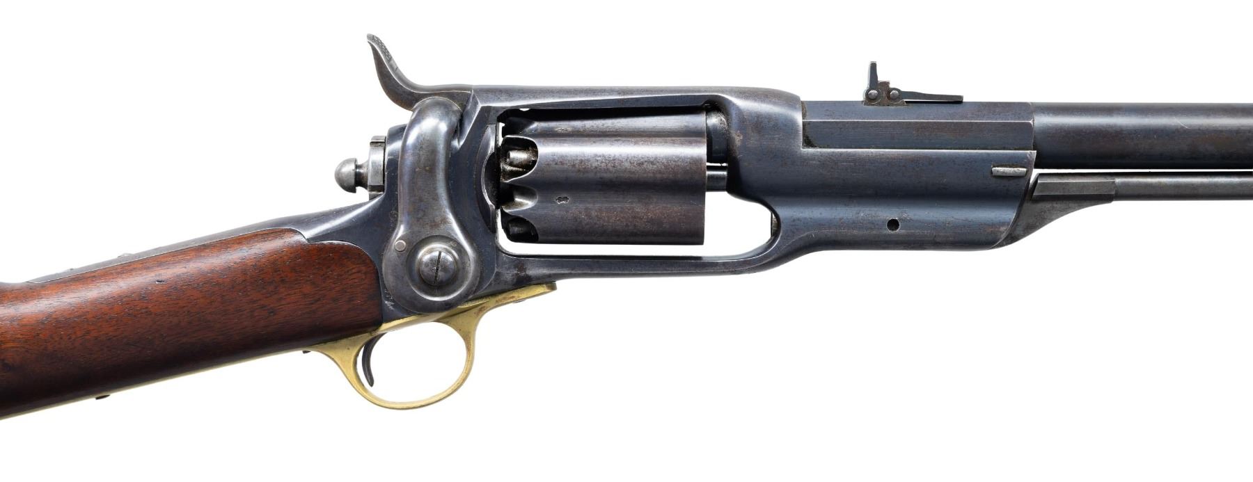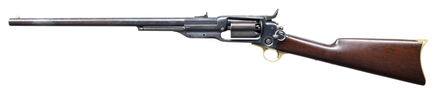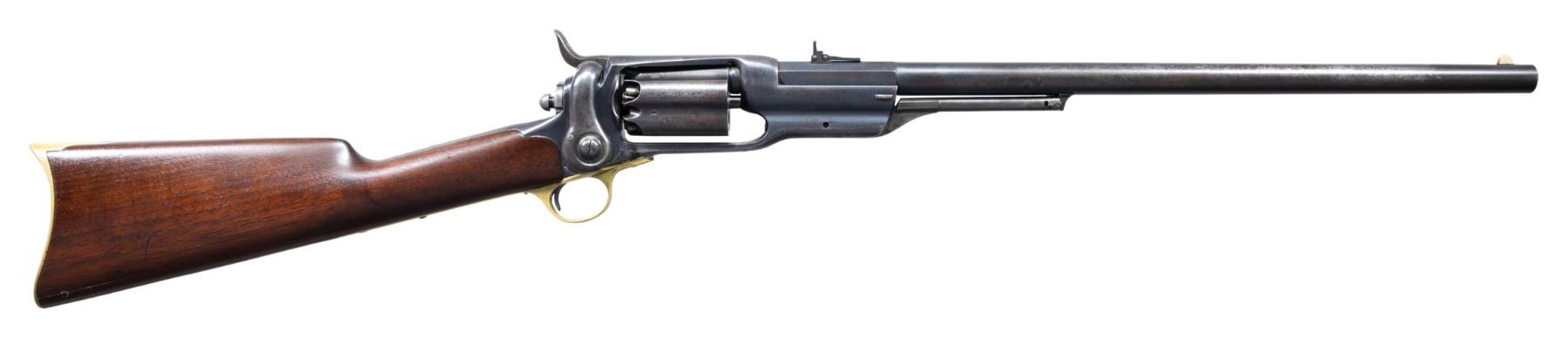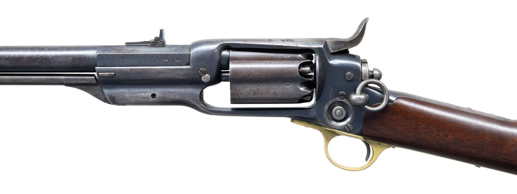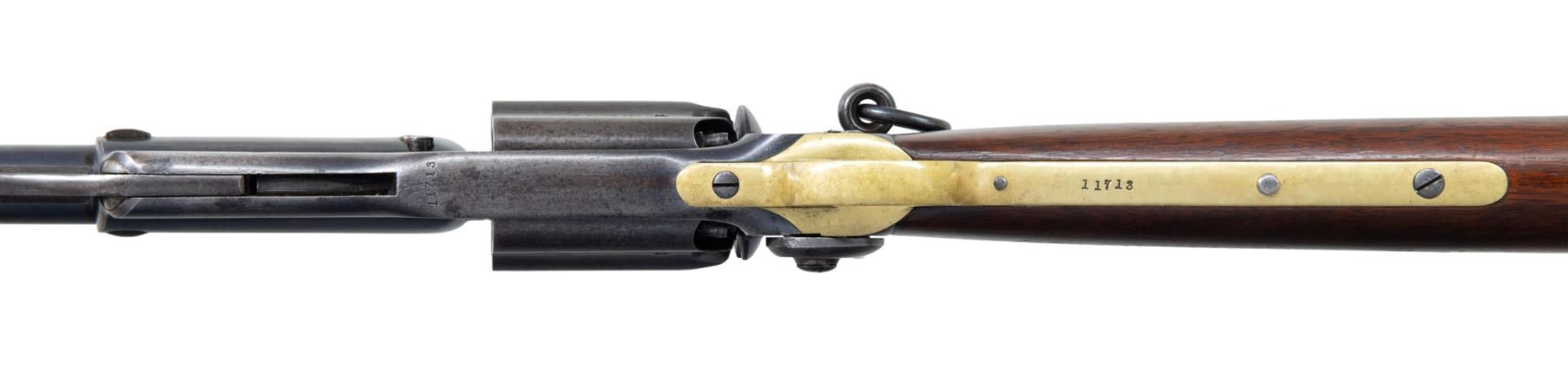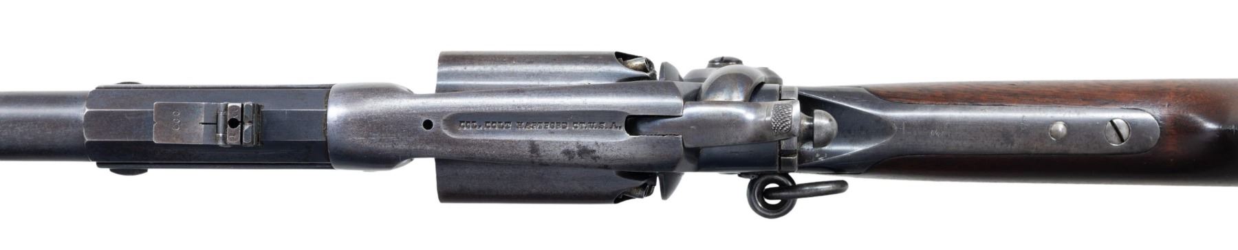 RING CARBINE. Cal. 56. S# 11713. Standard configuration of the British contracted colt model 1855 revolving carbine, 21" octagonal to round barrel, 3-leaf adjustable rear sight, tall pinched brass blade front sight, Five shot fluted cylinder, root patent side hammer, unique to the British model is brass buttplate and trigger guard. British proofs stamped on each cylinder chamber and left side of barrel breech. These British military carbines are found in serial range 10,000 to 12,000, most seeing hard use and wear, but a handful have surfaced over the years which show little use such as this one. Some speculation though not confirmed was that a group of these late 1850s manufactured carbines were shipped back to the United States for the Civil War. Regardless, there are a cluster of high condition British proof carbines that have sold in the collector market over the years and this is the only saddle ring variety available. CONDITION: fine to excellent overall, barrel retains about 30% bright factory blue, frame retains 50%, cylinder has about 20% thinning blue with balance plum/gray patina. Hammer & loading assembly have muted case colors blending into silver/gray patina. "COL. COLT HARTFORD CT.U.S.A." stamped in sighting groove in crisp, "PATENTED SEPT. 10TH 1850" is well struck on one cylinder flute. "COLT'S PATENT/NOV. 24th 1857" in arc is only partially struck on the left side of the frame above saddle ring which is typical on this model. Stock is fine with few scattered small dents and scratches. Mechanics are crisp, bright shiny mirror-like rifled bore. (01-27216/JS). ANTIQUE. $14,000-18,000.