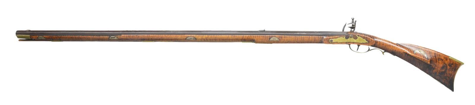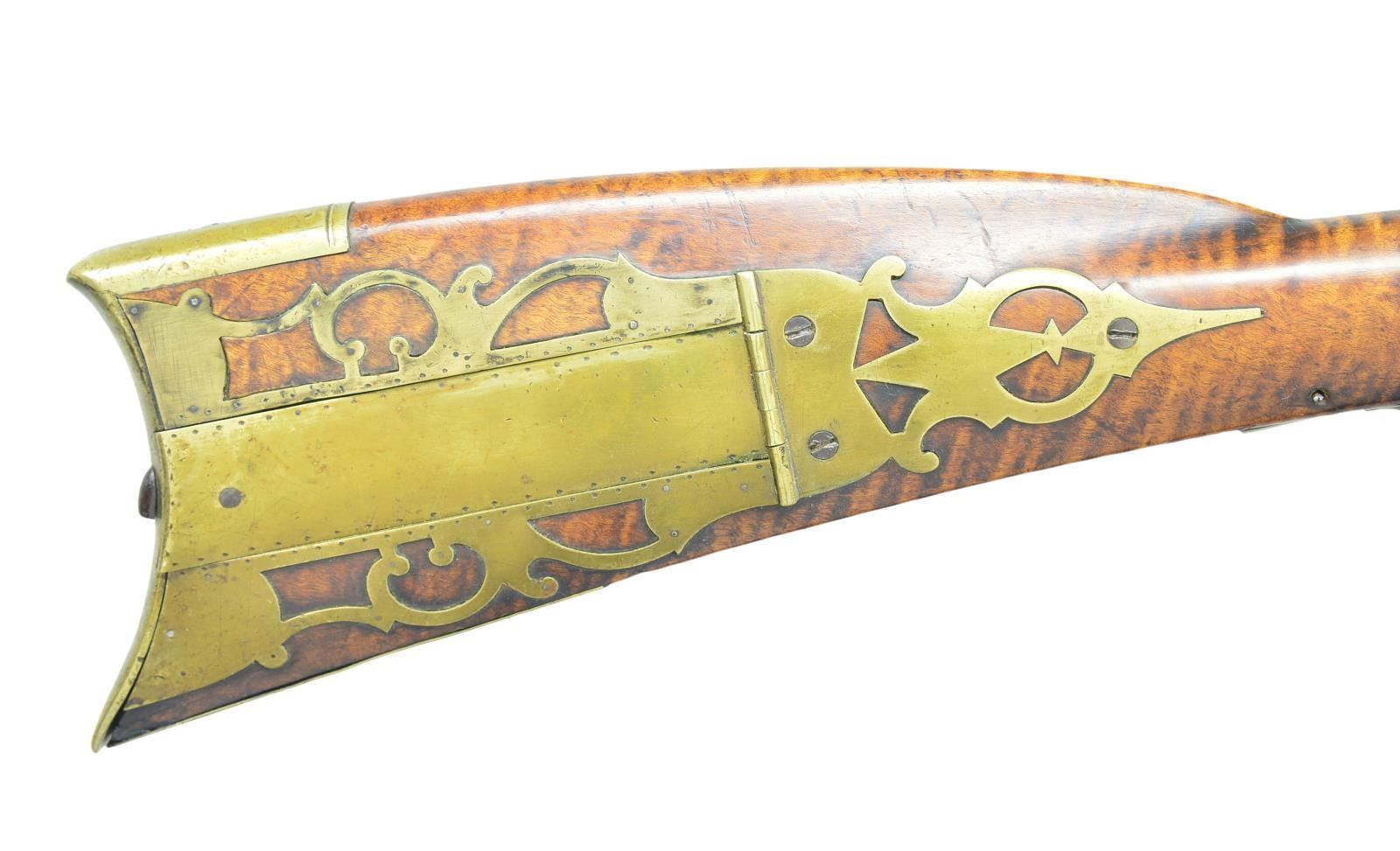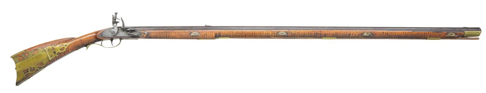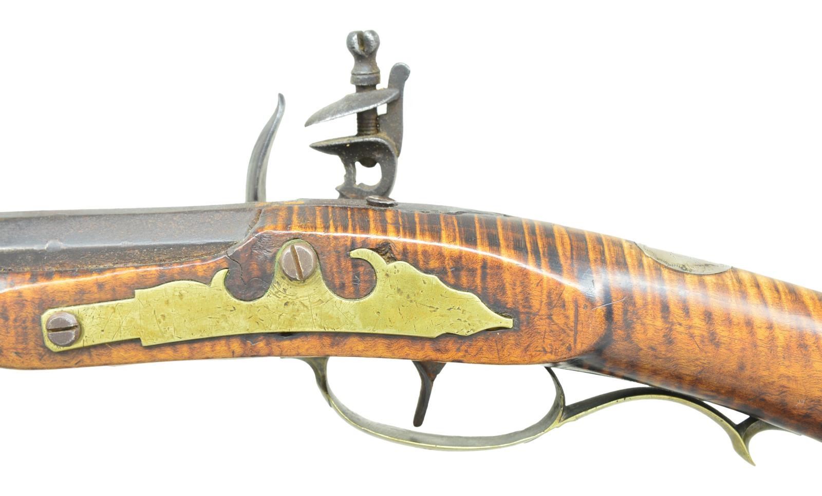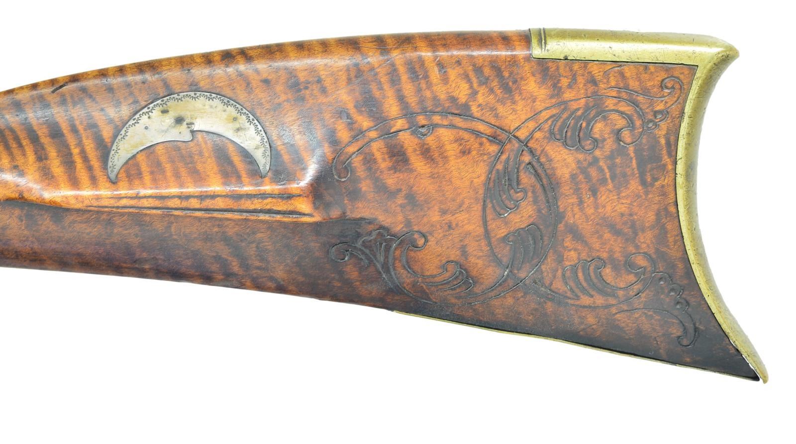 RIFLE. 58 Cal. smooth 43" octagon bbl. signed "J.D.". Flintlock is marked "Courtney Tennent & Co.". A nicely curled maple stock w/ a 4 piece brass patchbox w/ 10 piercings. 5 1/4" brass toe plate w/ 3 piercings & a silver half moon cheek piece inlay. The stock is very nicely incise carved behind the cheek piece. 8 Silver wedge inlays. John Dreisbach Sr. is one of the earliest gunsmiths in the Synder County school. He is listed from 1789 to 1829 in Mifflinburg. He is noted for his fine craftsmanship. CONDITION: clean & solid throughout..