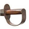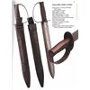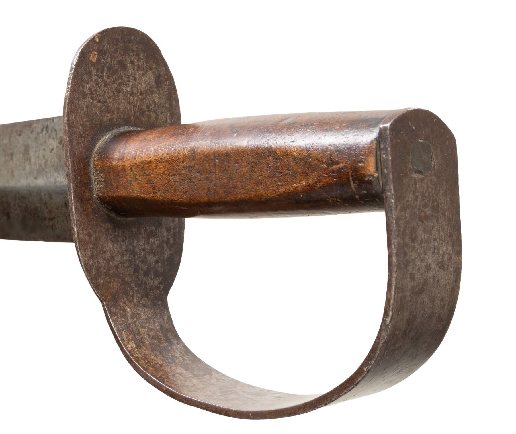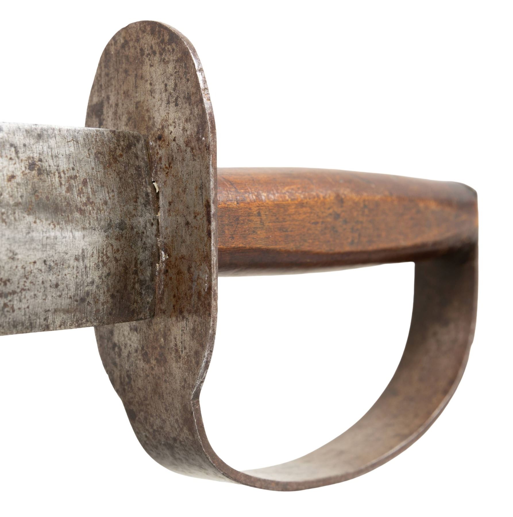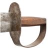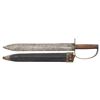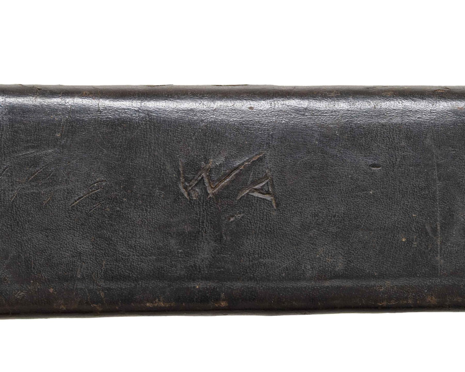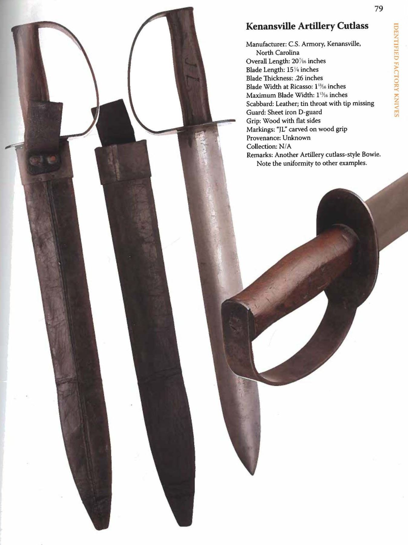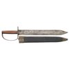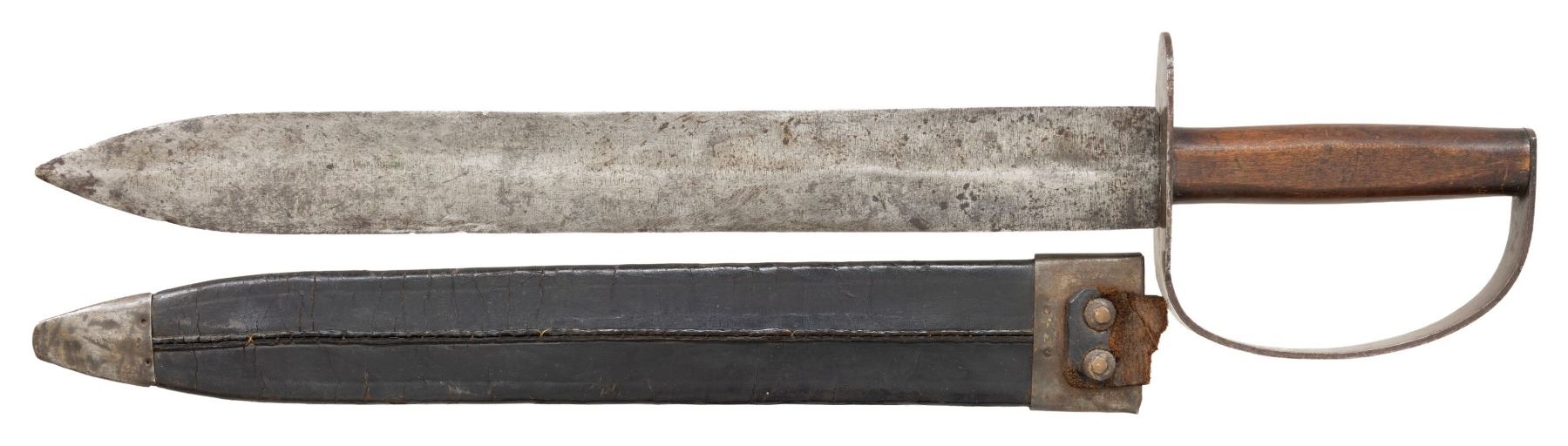 ARTILLERY CUTLASS & ORIGINAL TIN MOUNTED SHEATH. All the characteristics of fine bowie made at Louis Froelich's Confederate States Armory in Kenansville, NC. 21" overall, 15 7/8" double edged blade, 1.75" wide, .25" thick. Heavy sheet iron D-guard, 3.5" oval crossguard, 7/8" wide knuckle bow, flattened round walnut handle, leather sheath retains tin throat and tip. This is about as good as these knives come, few retain the original scabbard tip. UNATTACHED ACCESSORIES: copies of pertinent pages from "CONFEDERATE BOWIE KNIVES" showing this pattern and details of manufacture. CONDITION: very good overall, iron patina, hand worn wood patina, sheath is sound with 2 initials carved "WA", belt loop attached to throat is torn off, scabbard shrunk and doesn't fit all the way leaving .5" gap. PROVENANCE: Bob Allispones estate collection. (02-26036/JS). NON-GUN. $6,000-9000.