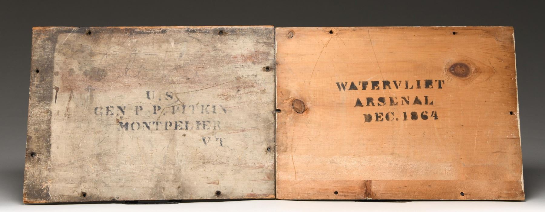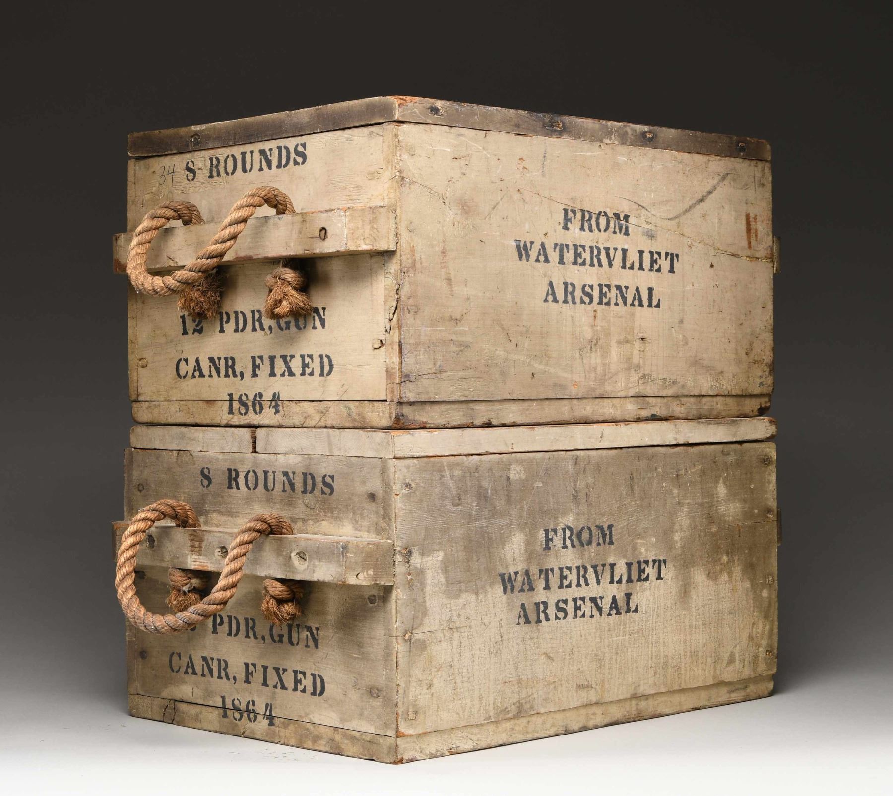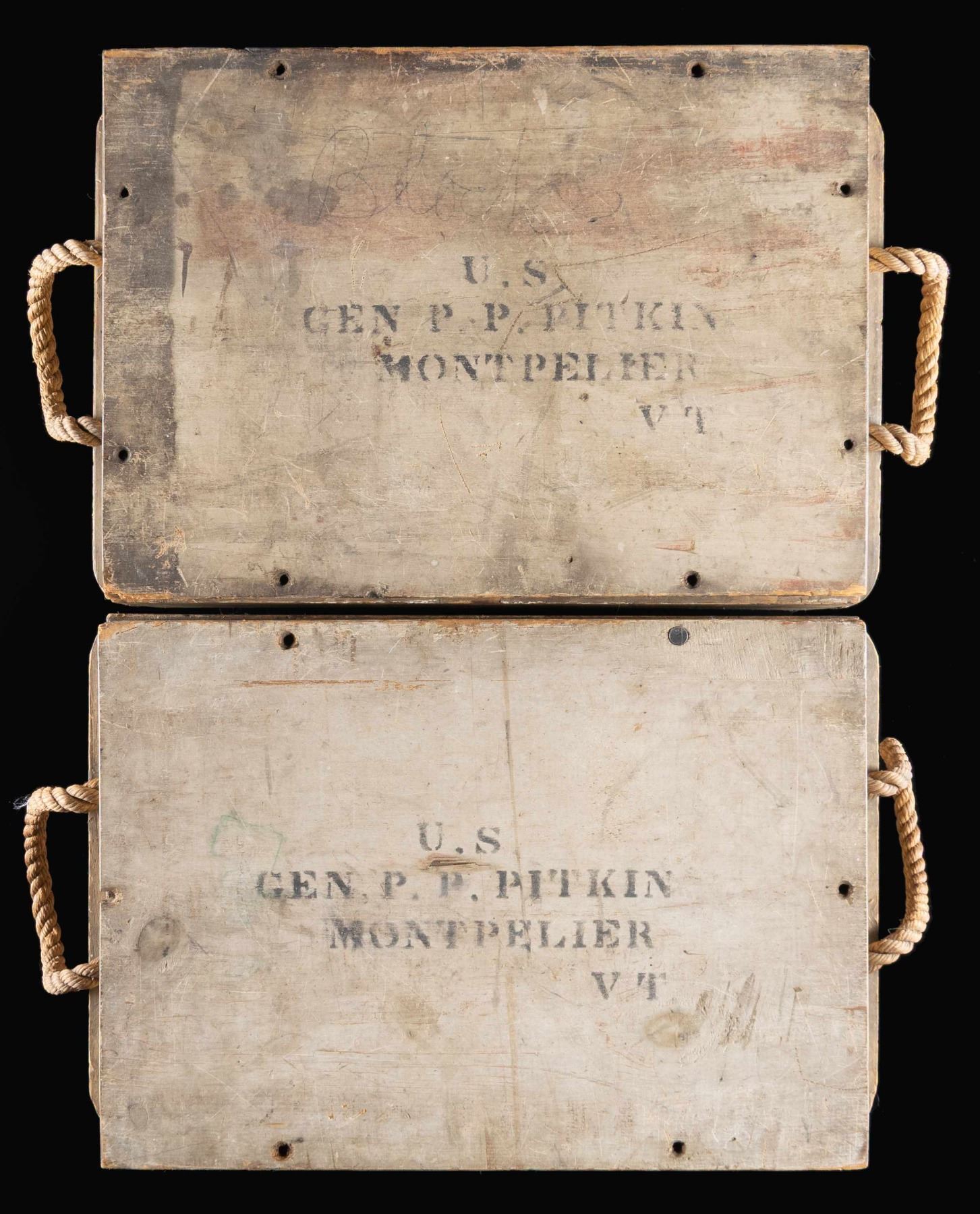 Ammunition crates were made by the tens of thousands during the Civil War but few have survived as complete with near perfect painted & stenciled surfaces, and original lids. The rope handles are quite fine and complete. Both boxes are painted with arsenal gray and stenciled on 3 sides, and inside and outside of each lid. Stenciling on each edge "8 ROUNDS / 12 PDR GUN / CANR. FIXED / 1864", "FROM / WATERVLIET / ARSENAL", inside lids "WATERVILIET / ARSENAL / DEC. 1864". Top of lids: "U.S. / GEN. P. P. PITKIN / MONTPELIER VT". Heart pine dovetailed, nailed & screwed boxes measure approximately 20" x 15" x 11". Regulations for ammo crates had different painted colors to distinguish shell (red) from shot (black) from canister (gray) so in heat of battle, mistakes would not be made. Canister was for anti-personnel of attacking infantry or cavalry and used to great effect especially in the big 12-pound Napoleon guns these were made for. The survival of a single 12 LB canister round that would fit in this crate is rare, these crates are extremely rare and are unique survivors. CONDITION: fine overall, complete and original, few if any crates survive in same condition. (02-24581/JS), NON-GUN. $3,000-6,000.