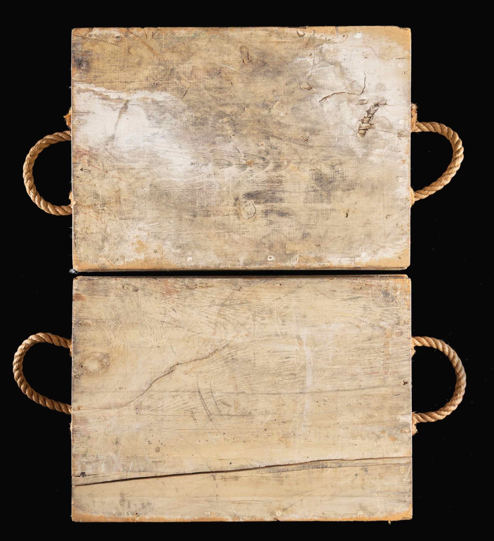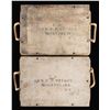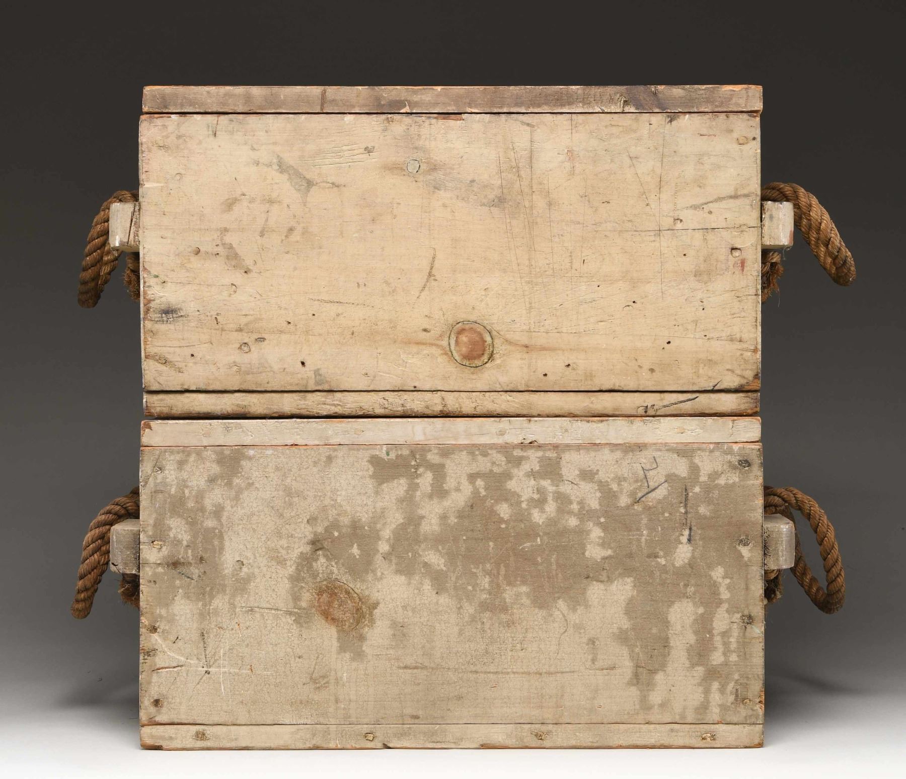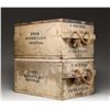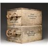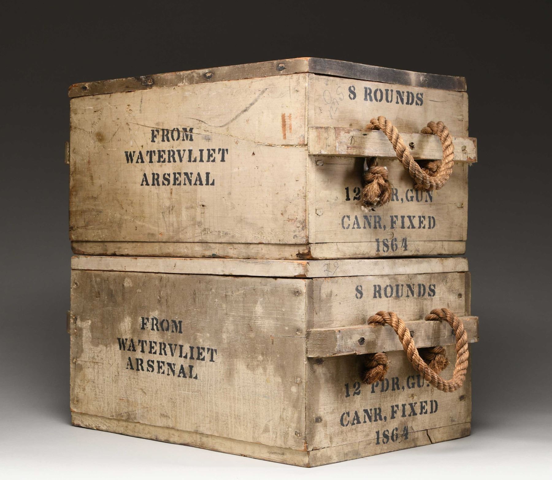 Ammunition crates were made by the tens of thousands during the Civil War but few have survived as complete with near perfect painted & stenciled surfaces, and original lids. The rope handles are quite fine and complete. Both boxes are painted with arsenal gray and stenciled on 3 sides, and inside and outside of each lid. Stenciling on each edge "8 ROUNDS / 12 PDR GUN / CANR. FIXED / 1864", "FROM / WATERVLIET / ARSENAL", inside lids "WATERVILIET / ARSENAL / DEC. 1864". Top of lids: "U.S. / GEN. P. P. PITKIN / MONTPELIER VT". Heart pine dovetailed, nailed & screwed boxes measure approximately 20" x 15" x 11". Regulations for ammo crates had different painted colors to distinguish shell (red) from shot (black) from canister (gray) so in heat of battle, mistakes would not be made. Canister was for anti-personnel of attacking infantry or cavalry and used to great effect especially in the big 12-pound Napoleon guns these were made for. The survival of a single 12 LB canister round that would fit in this crate is rare, these crates are extremely rare and are unique survivors. CONDITION: fine overall, complete and original, few if any crates survive in same condition. (02-24581/JS), NON-GUN. $3,000-6,000.