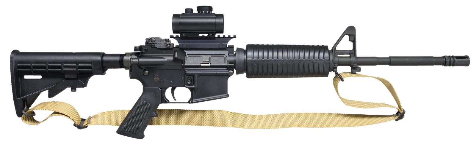 Cal. 5.56. S# 63350. Bbl. 16". Very nice Stag 15 w/ 16" M4 profile bbl. marked “DPMS 5.56 1-9” w/ A2 flash hider. Tall front sight/bayonet lug/gas block design. ARMS folding BUIS 40-L rear sight on flat top upper receiver w/ brass deflector & rnd. forward assist. Pine Ridge red dot sight on riser cowitnessed to iron sights. Rnd. carbine style handguards w/ beveled delta ring. 6 Position collapsible buttstock. SP1 cut bolt carrier. Sling swivels front & rear w/ tan canvas sling. MAGS: 6 TOTAL: 5-30 rd.; 4 are metal, 1 is“Orlite”. 1 Aluminum Colt 20 rd. UNATTACHED ACCESSORIES: Double Triple Canvas Assault Bag, 10 striper clips w/ adapter & TM 9-1005-249-10 technical manual. CONDITION: all outward appearances indicate very little use, finish is even & complete w/ no visible blemishing, mags. are in normal condition finish wise, for metal mags. of this era, all appear functional, red dot sight appears to function correctly, clean bore w/ visible rifling. Fire control mechanism appears to function correctly when cycled by hand. (21-574/JZ). MODERN. $600-1,000.