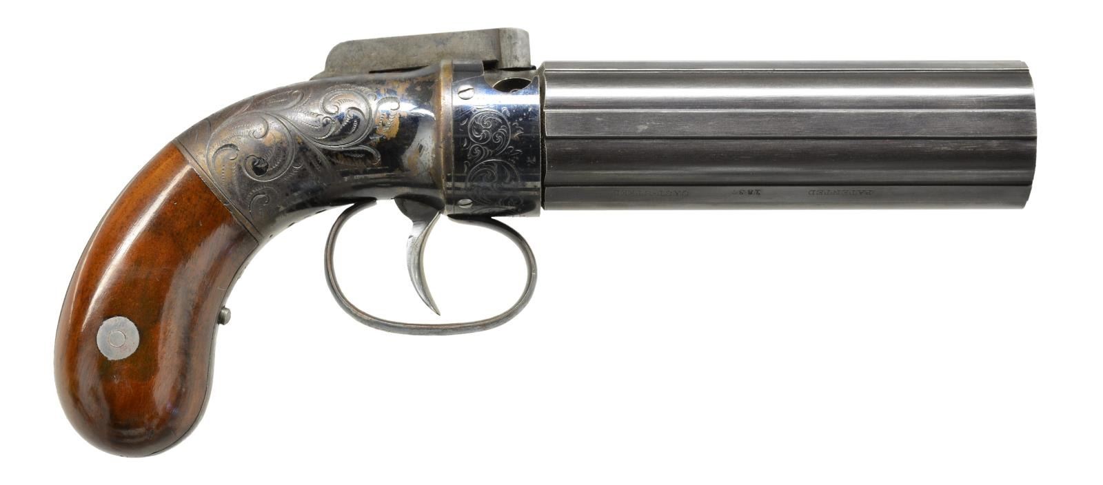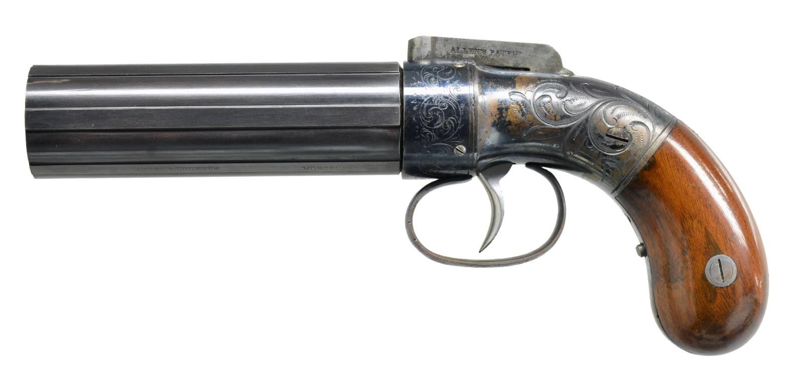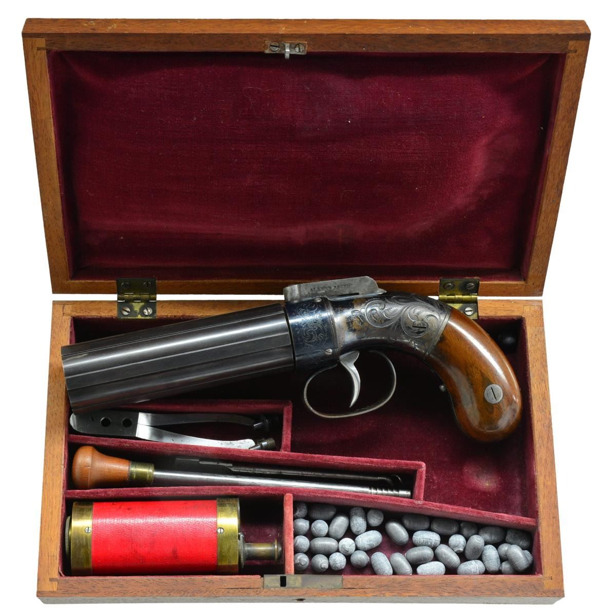 PEPPERBOX REVOLVER. Cal. 34. S# 220. 9” Overall, 4.5” six-bbl. cluster pepperbox w/ nipple shield marked on 2 bbl. ribs “ALLEN & THURBER WORCESTER MASS” & “PATENTED 1837 CAST STEEL”. Bar hammer is marked on left side “ALLEN’S PATENT”. Bbl., frame & mountings are all blued steel. Hammer is casehardened. 2 Piece grips are varnished walnut. Walnut beveled casing is red velvet lined & compartmentalized for pistol, 2-cavity mold, red Moroccan leather veneered 3 compartment ovoid flask, balls, wood handled cleaning rod, worm & 2 loose nipples. CONDITION: bbl. retains 80% thin blue w/ plum overall. 50%+ Blue on frame & mountings, virtually all varnish retained. Casing is fine, slight warpage. Lining fine. Mold is fine w/ polished steel. Flask is fine w/ good bright leather cover w/ patinaed brass. All-in-all a superior cased pepperbox rarely seen. (01-18844/JS). ANTIQUE. $2,000-4,000.