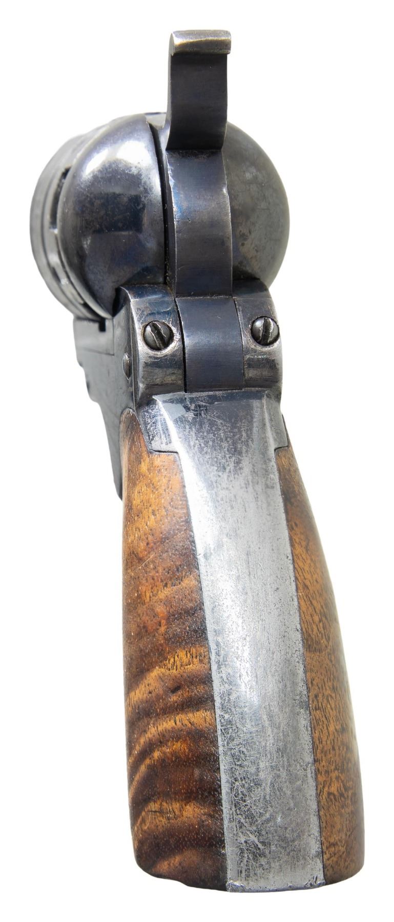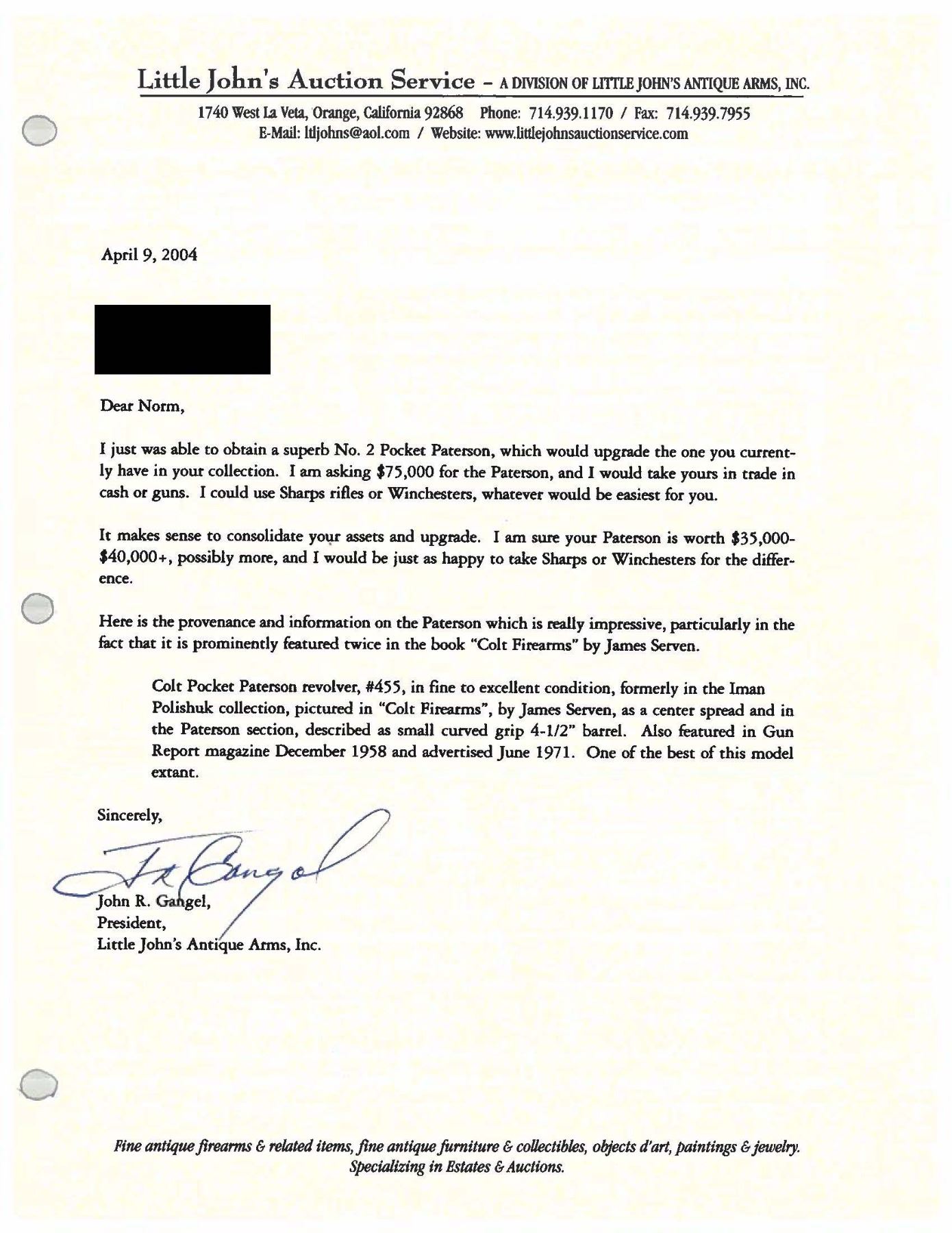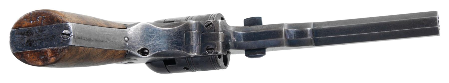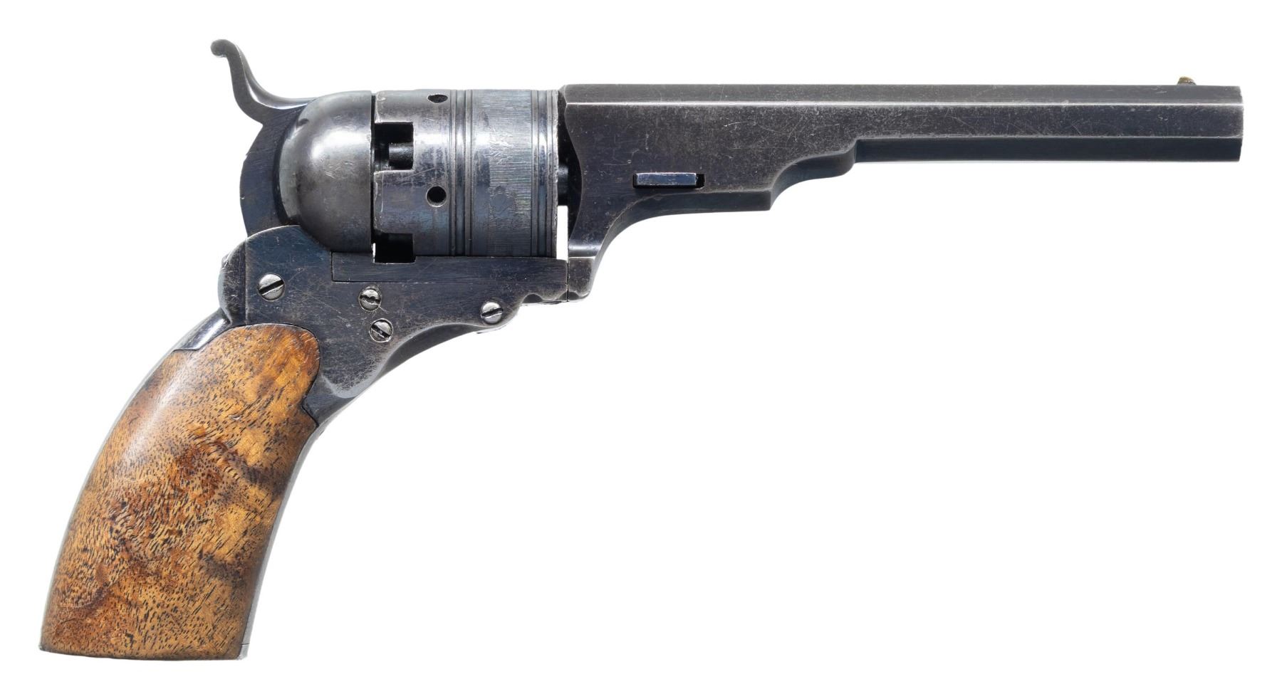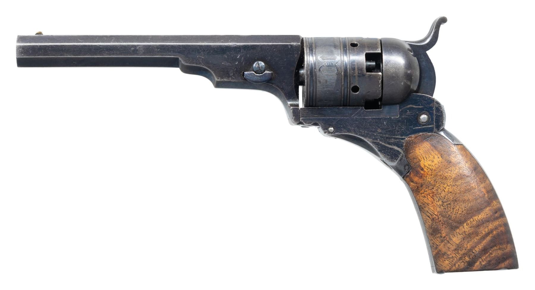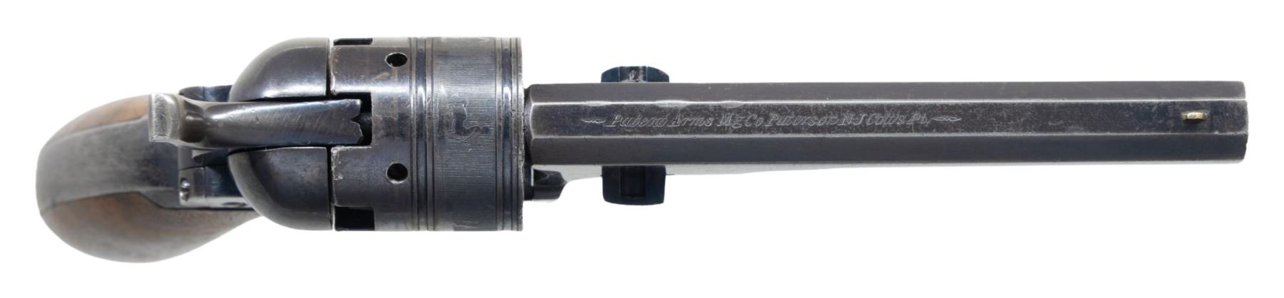 2 REVOLVER. Cal. 31. S# 455. Paterson 31 caliber belt model pistols were made in 2 patterns in same serial numbered range 1837-1840. The straight grip pattern is No. 2 revolver, the other pattern has flared grips and designated No. 3 revolvers. Total production estimated at 850. Standard configuration, 4.5" octagonal barrel, German silver blade front sight, slanted script address: "Patent Arms M'g Co Paterson N-J Colt's Pt.", folding spur trigger, 5 shot cylinder with unique Colt centaur rolled scene, mounted with very nicely figured walnut grip. UNATTACHED ACCESSORIES: copy of December 1958 Gun report photo of revolver held by Irman Polishuk, copy of back cover of June 1971 Gun Report where revolver is offered. 2004 letter offering revolver. CONDITION: extremely fine, all matching S#s including barrel, wedge, cylinder rotating plate, frame, backstrap, & grip. Not further disassembled to check for other numbers. About 90% original bright factory blue overall, grip frame has thin blue balance silver/gray patina. Cylinder scene with centaur and 4-horsehead Colt logo is crisp and all discerned. Grip shows fine figure and color, one dent in left bottom edge. Hammer retains muted dark case colors. Mechanics fine, crisp bright shiny multi-groove rifling. PROVENANCE: Iman Polishuk collection; Bob Elz offered for sale in June 1971 Gun Report; John Gangle sold to Norman Greenberg, 2004; The Esteemed Norm Greenberg Collection. (01-27658/JS). ANTIQUE. $50,000-80,000.