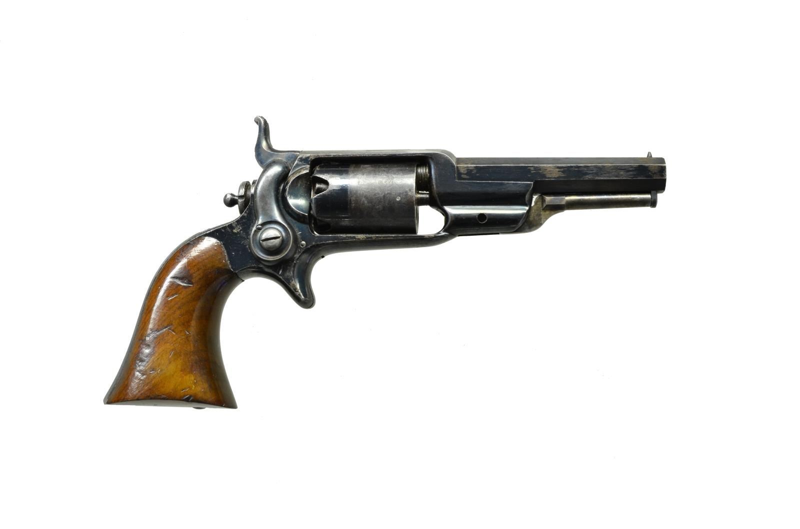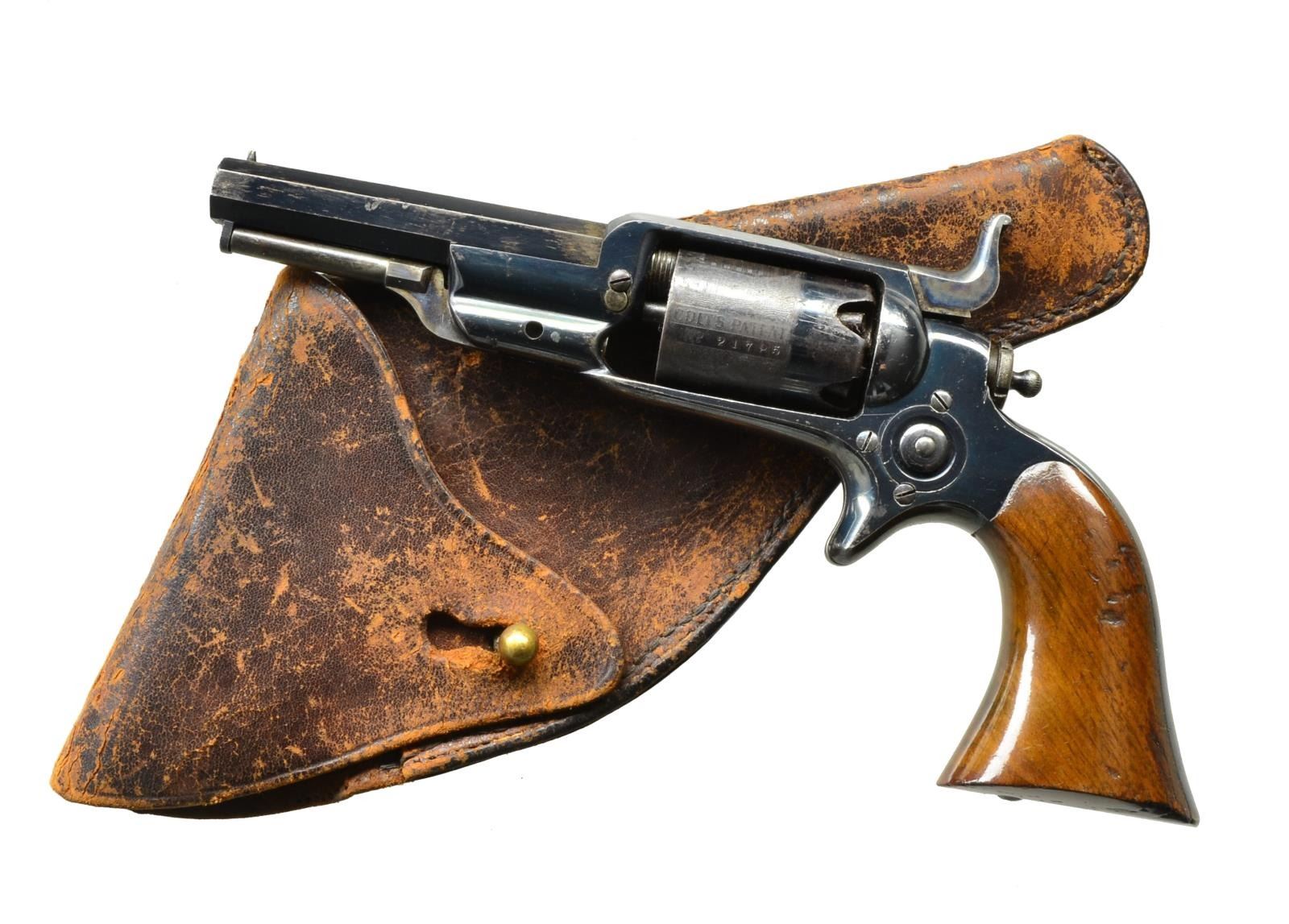 Cal. 28. S# 21785. This revolver is in truly outstanding condition, w/ well made flap holster that fits like a glove. Revolver does not appear to have been taken out much as it shows little wear or loss of finish. This is a standard Model 2 mfg. 1860, Indian cabin rolled cyl. scene, 3.5" bbl. w/ unique pointing hand terminations on Hartford bbl. address. This was one of Col. Colt’s favorite presentation pistols 1860-61, several of the sm. are known presented to Civil War generals. There are lots of well worn Colt Root side hammer revolvers out there, but it may not be possible to find a better condition example in original military style flap holster. CONDITION: excellent, retains over 95% original bright factory blue finish, mechanically fine w/ crisp shiny bore. Holster is equally fine complete condition. (01-20163). ANTIQUE. $3,500-5,500.