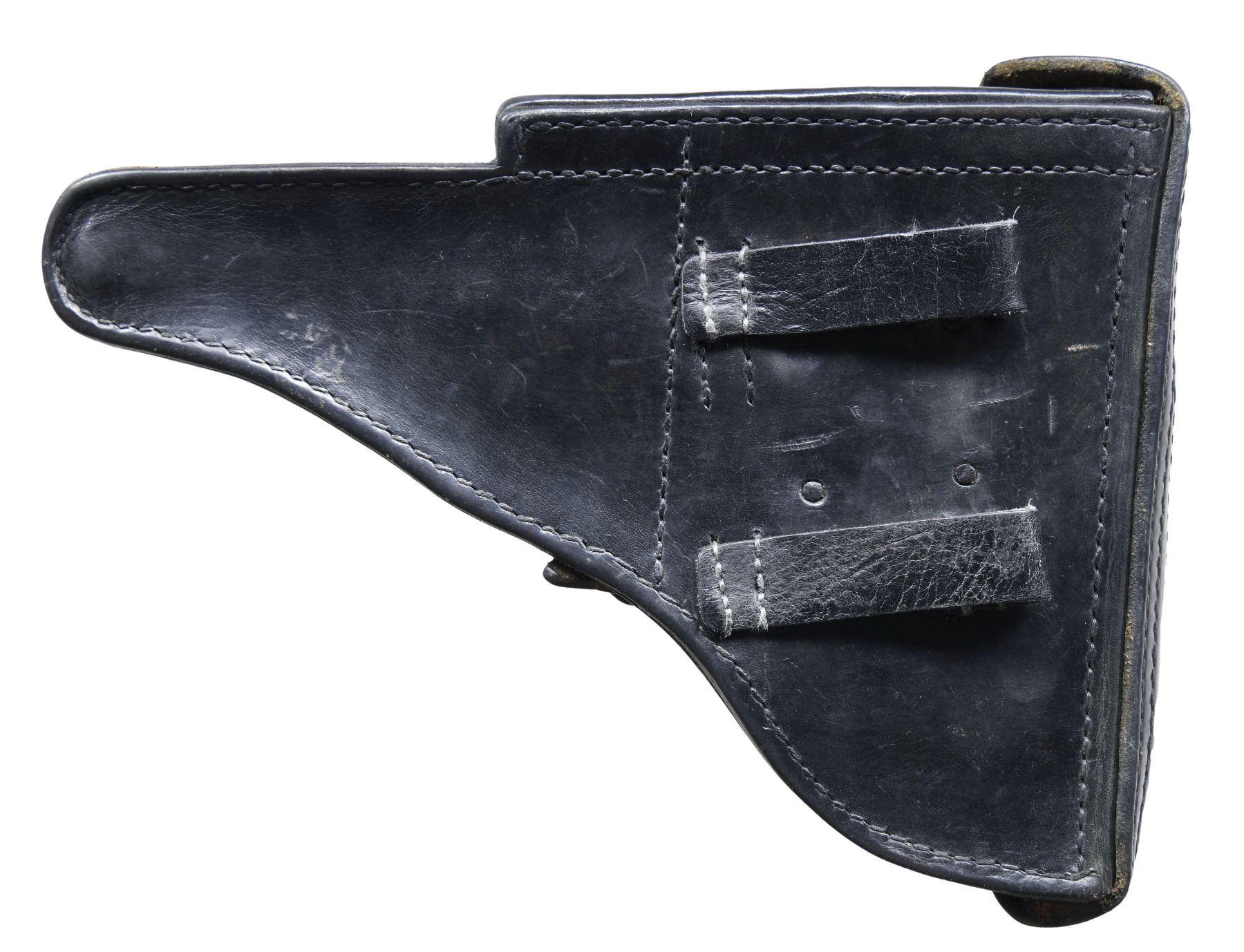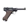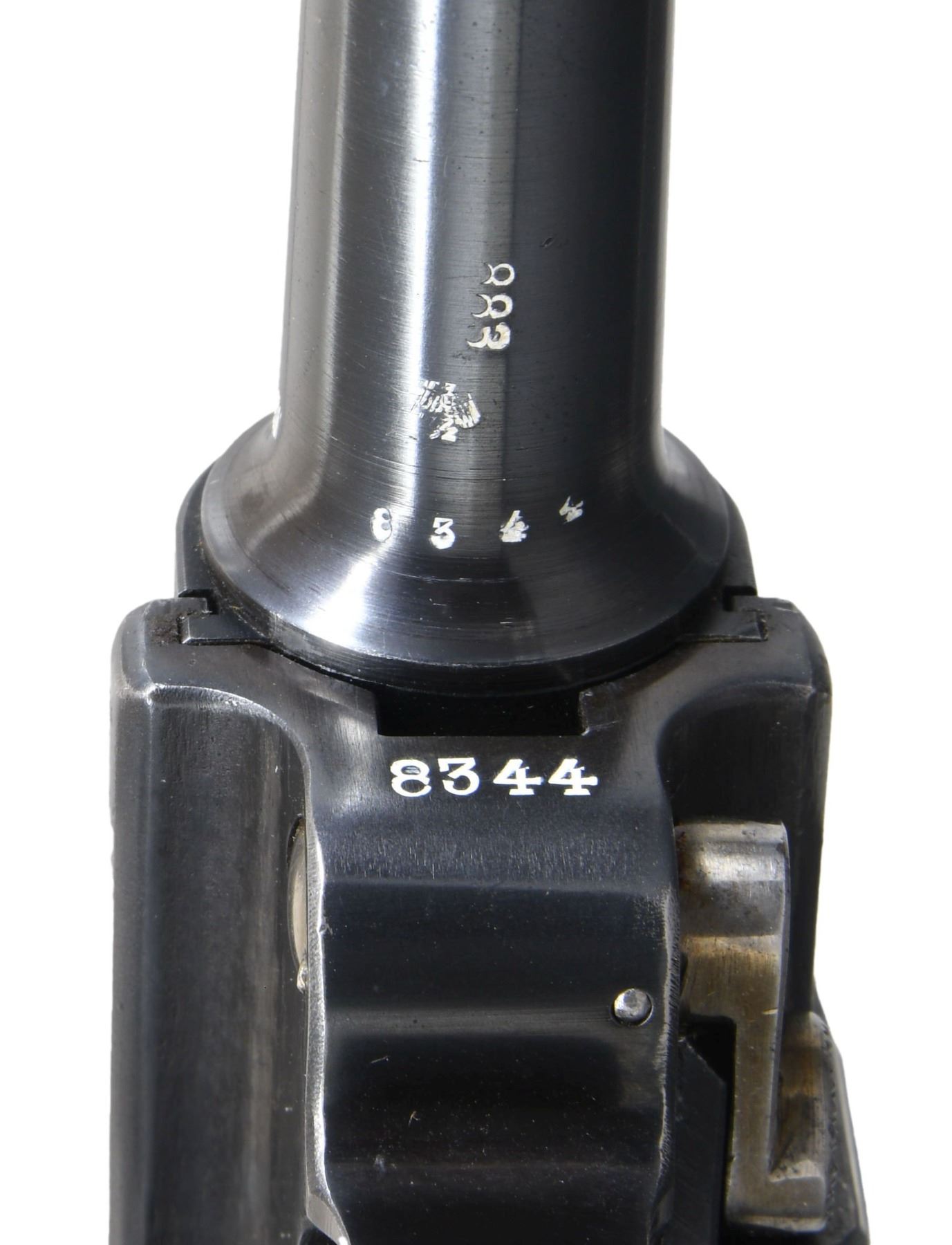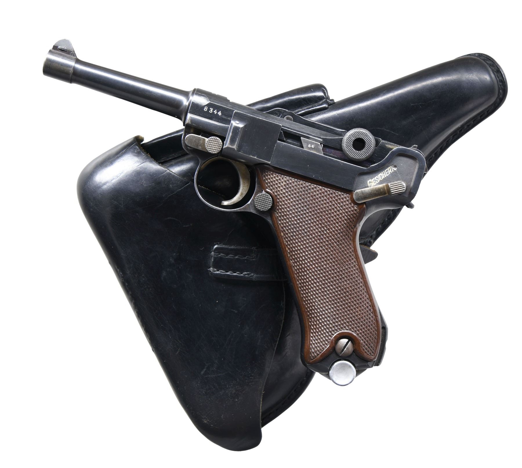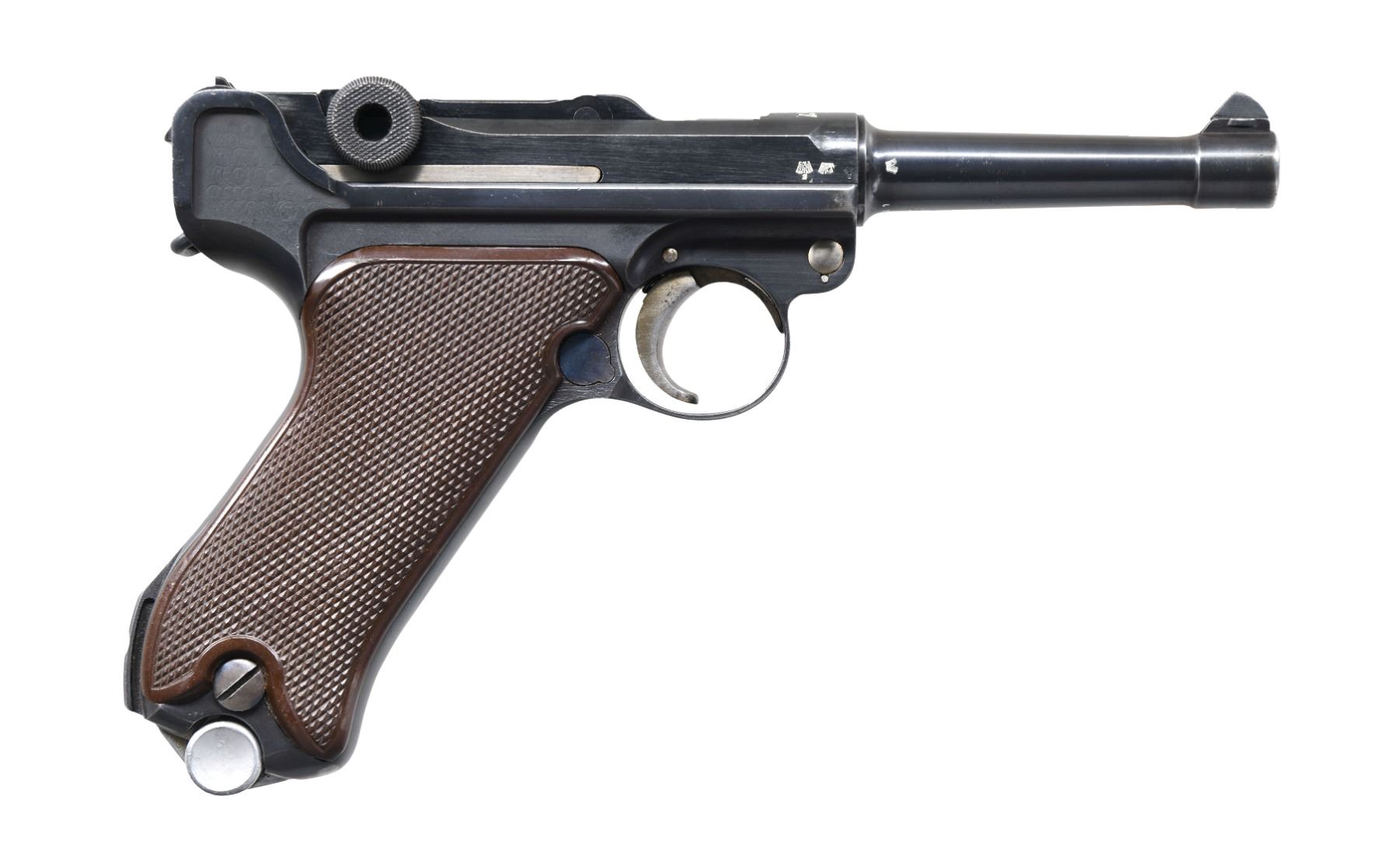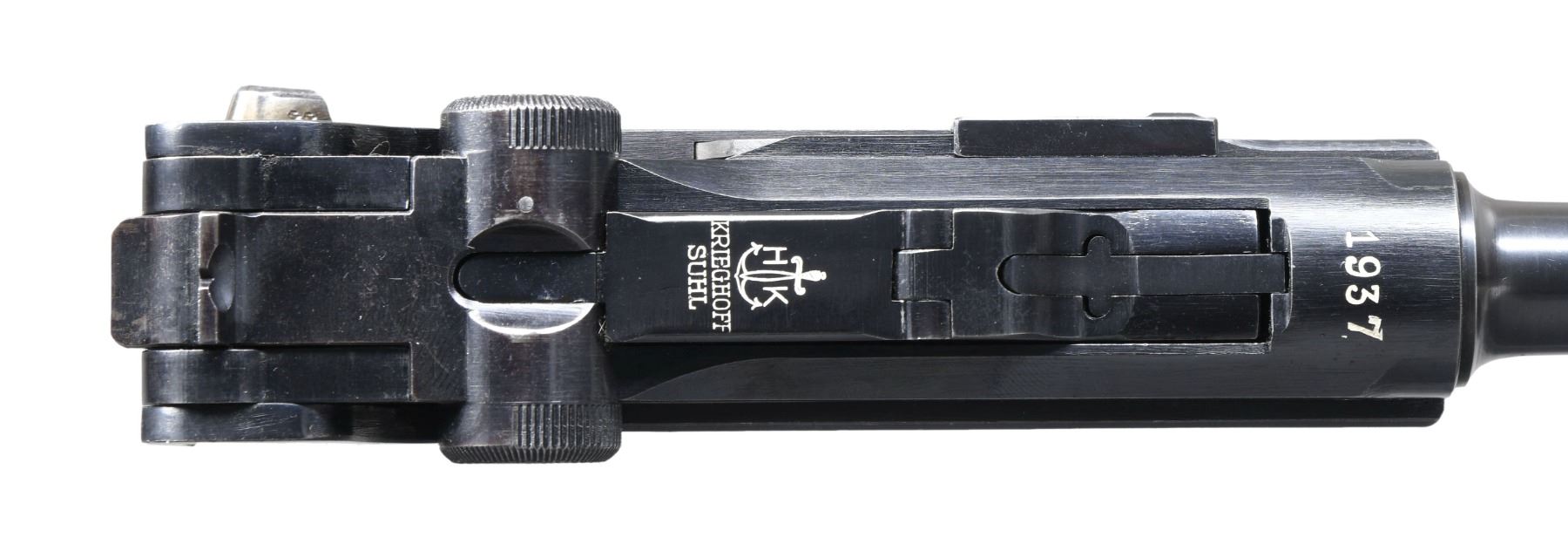 DATE LUFTWAFFE CONTRACT P.08 LUGER SEMI-AUTOMATIC PISTOL WITH HOLSTER. Cal. 9mm Para. S# 9344. Bbl. 4". 1 of only approx. 2,500 P.08 Luger semi-automatic pistols mfg. by Krieghoff in 1937 under contract for the German Luftwaffe. The top of the bbl. extension is marked "1937" over the chamber, with Krieghoff proofs marked on the right. Toggle is marked with Krieghoff's ("H" ANCHOR "K") logo above "KRIEGHOFF/ SUHL". Disassembly shows all small and internal parts with proper Krieghoff acceptance proofs. Major metal components exhibit a lustrous high polish blue finish, with several small parts, including the takedown lever, safety lever, and ejector exhibiting a straw finish. Frame is mounted with 2-piece checkered brown plastic grips. All serialized parts are matching and include the frame, takedown lever (rear), sideplate (interior), trigger, safety lever & bar, bbl., bbl. extension, breechblock, firing pin, firing pin guide, toggles, as well as the rear toggle pin. MAGS: 1 non-matching 8-rd. mag. (S# 7666c). UNATTACHED ACCESSORIES: black leather holster marked with an Eagle/2 on the interior, containing a Eagle/2 loading tool. CONDITION: extremely fine, with metal components retaining bountiful amounts of their original factory blue finish, exhibiting some light edge wear and thinning, some light superficial handling marks, as well as some scattered spots of light surface oxidation. Left side of the bbl. exhibits an area of thinning, with the frame exhibiting a small area of wear at the toe, both consistent with usual holster wear. Strawed parts retain large amounts of their original finish, exhibiting areas of wear and thinning that show through to gray patina, as well as spots of darker age related discoloration. Bright bore, exhibiting streaks of mild to moderate pitting, while retaining strong rifling throughout. Grips are very good, showing light to mild smoothing, as well as some scattered nicks and marks to the diamonds. Holster remains malleable, exhibiting scattered marks from handling and storage, as well as several scratches. An exceptional example of a 1937 dated Krieghoff P.08 Luger, delivered to the Luftwaffe prior to World War II. (24-6884/MLW). CURIO. $6,000-9,000.
