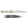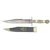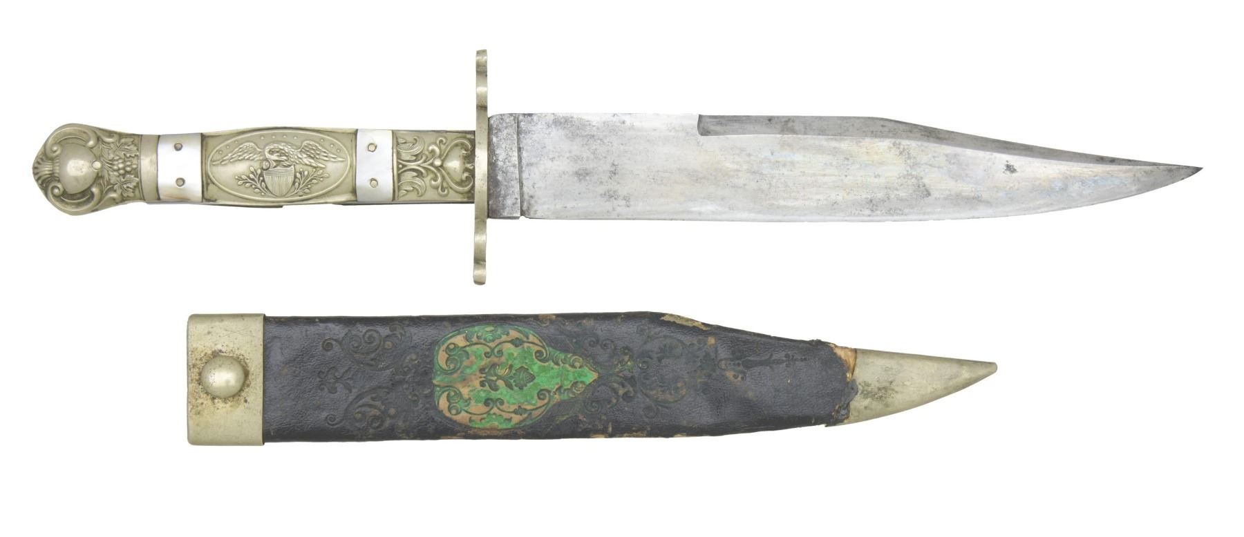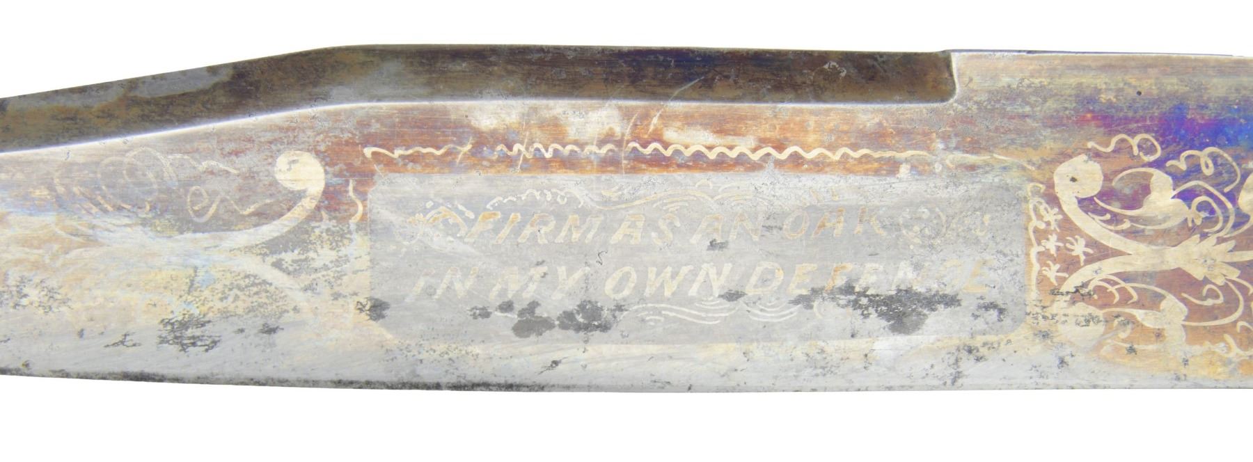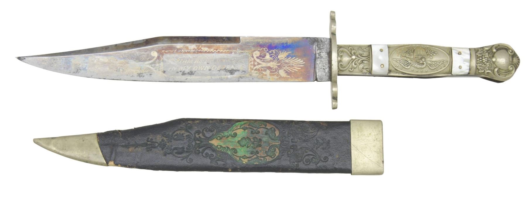 BOWIE KNIFE. 13"overall, 8" clip point blade, "J. LINGARD / PEACROFT / SHEFFIELD" stamped ricasso. Mother-of-pearl slab grip with large oval German silver spread wing eagle over shield and laurel wreath motifs on either side, 2.5" sculpted cross guard. Blade has wonderful etched panel "FIRM AS AN OAK / IN MY OWN DEFENCE". Accompanied by original well fit embossed German silver mounted sheath. CONDITION: fine overall, blade retains much original luster, good point & edge, etched panel is very good with portion of blued background, maker's mark on ricasso is weak with pitting. Handle & sheath both complete and matching condition. PROVENANCE: William Grimison; Larry W. Williams lifetime collection, 1977. (02-23260/JS). NON-GUN. $3,000-4,000.