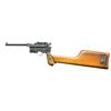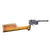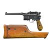 SEMI AUTO PISTOL WITH MATCHING STOCK. Cal. 7.63mm. S# 7778. Bbl. 5.5". Super scarce Mauser Conehammer 6-shot w/ 5.5" bbl. having fixed front sight, relieved to present bead profile, & slip-in 50-500 rear sight. Long extractor and early firing pin w/ matching retainer. Top of chamber w/ usual 3-line address, Crown /"C"/"U" on left side of bbl. extension; antler proof on right side. Major components rust blued w/ usual fire blued sm. parts. The bolt, hammer & trigger assembly in the white. Lanyard ring present. Disassembly shows all factory matching parts except grips, each panel numbered "13109". Complete w/ correct factory matching shoulder stock. UNATTACHED ACCESSORIES: matching shoulder stock. CONDITION: approx. 95% original blue w/ wear in expected locations, most pronounced at front of mag. well. Comparable condition fire blue that shows no suggestion of enhancement. Generally bright bore w/ oxidative etching in the grooves. Perfect manual mechanics. Stock is vg-exc. w/ usual discoloration & handling dings. Upper arm of lug was cleaned a long time ago, now faded to a mellow gray, the balance of the lug & hinge consistent w/ the overall appearance of this exceptional & unusually scarce Conehammer. (01-21636/LMA). ANTIQUE. $9,500-14,500.