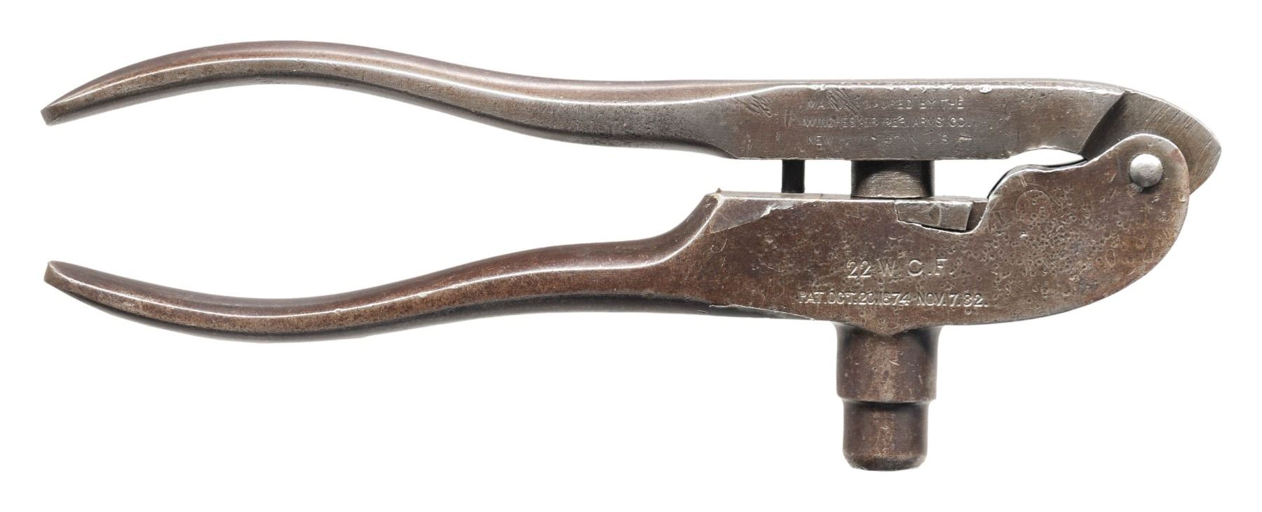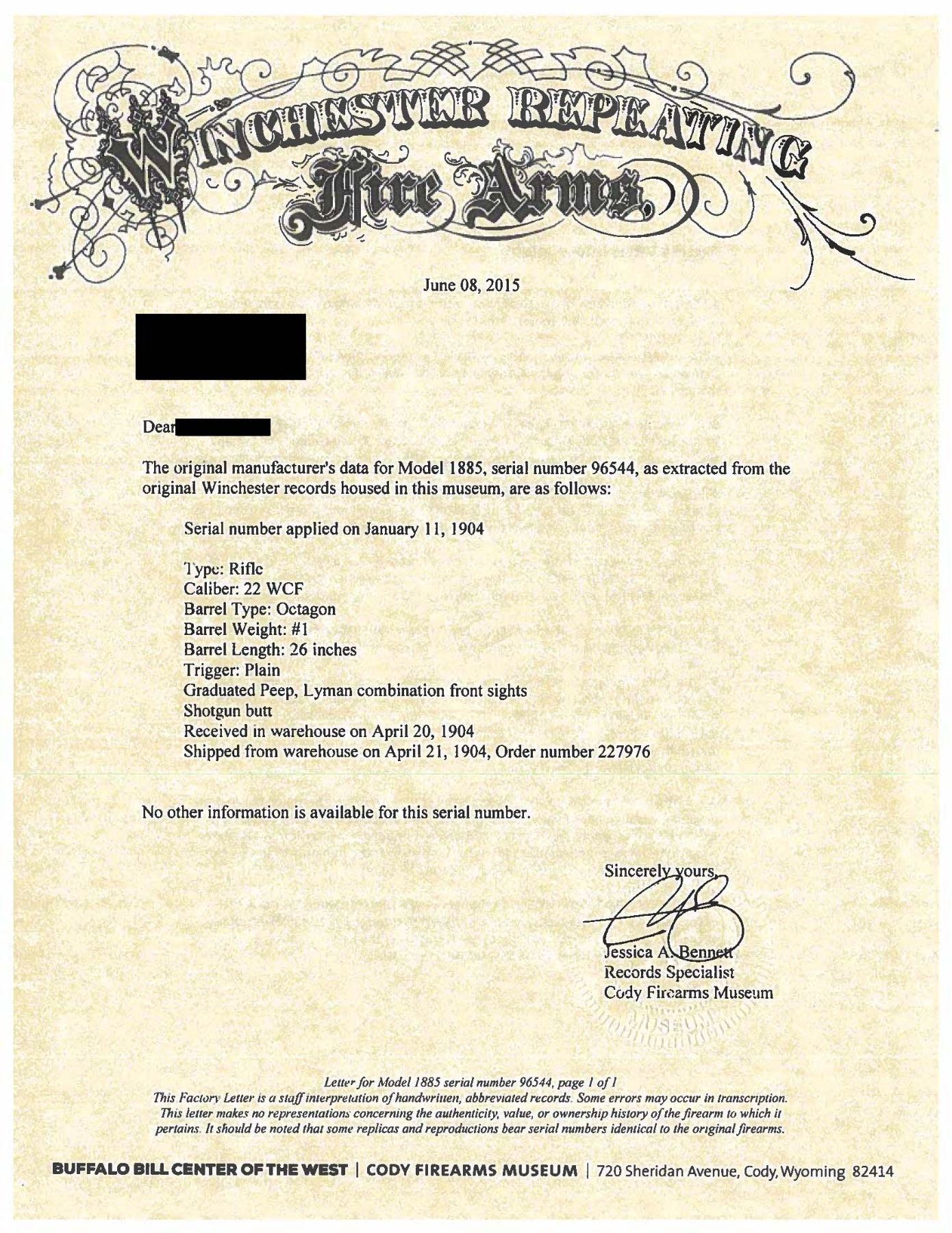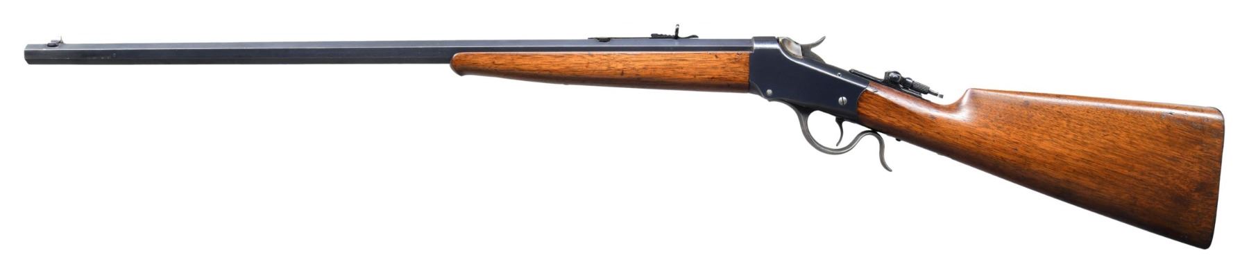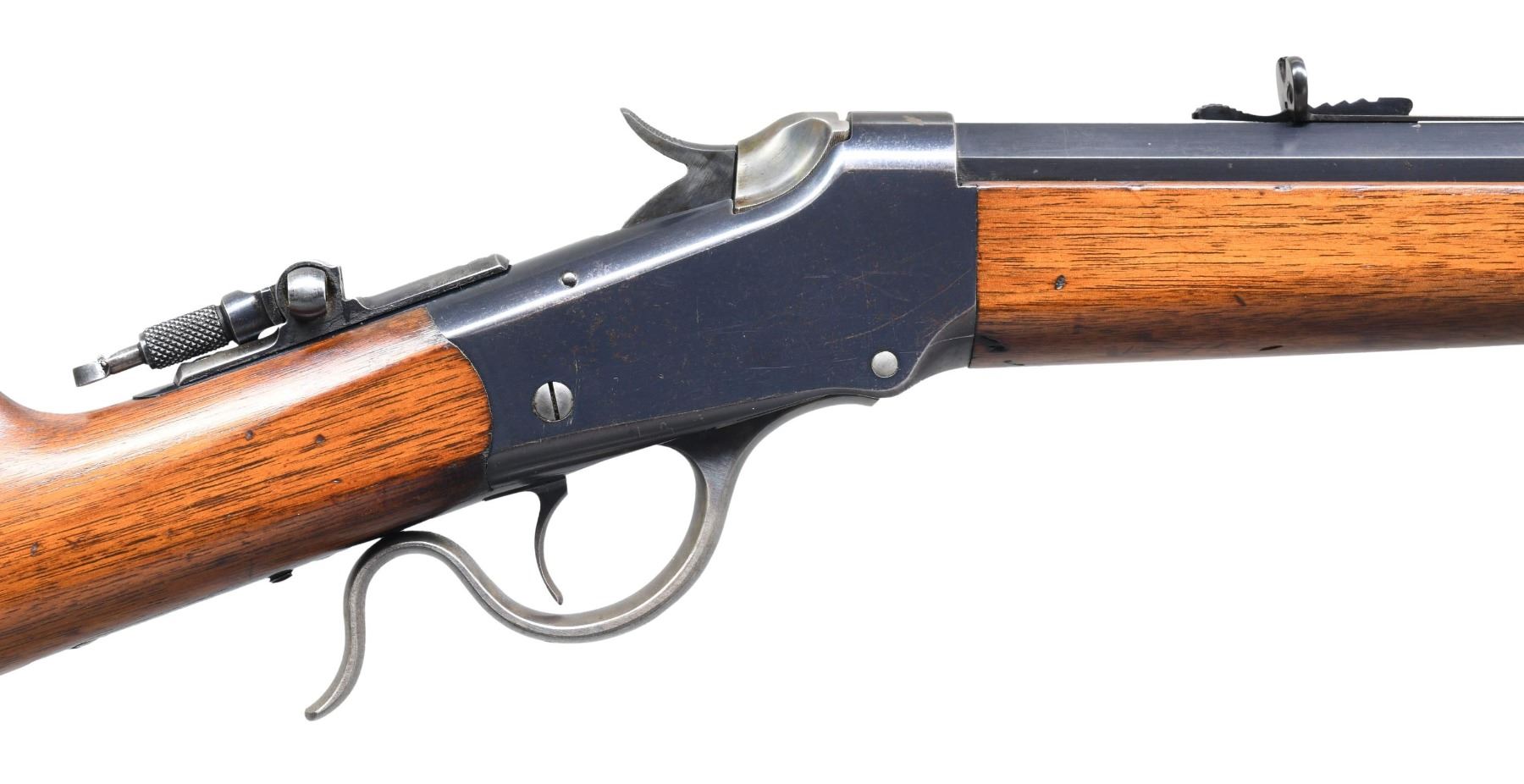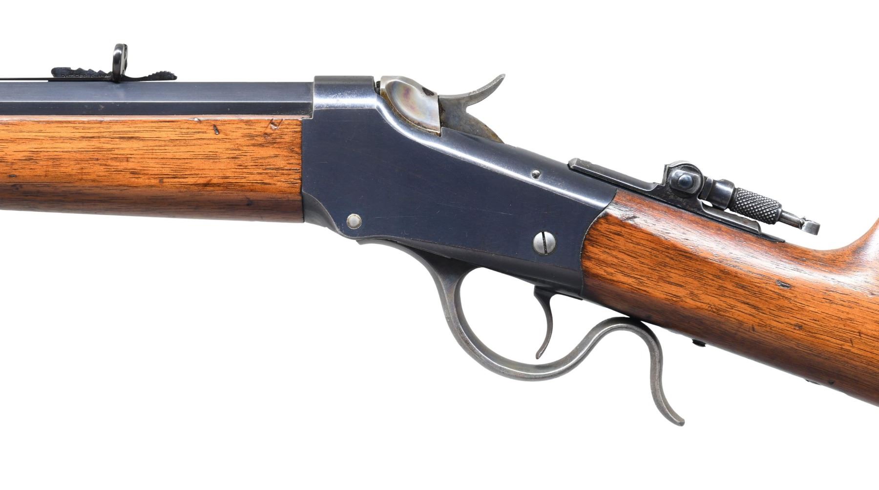 1885 LOW WALL SINGLE SHOT RIFLE WITH WINCHESTER LOADING TOOL. Cal. 22 WCF. S# 96544. Bbl. 26" octagon of No. 1 weight. Sporting bbl. sights, with combination tang sight. Thick wall receiver. Blue finish, with case colored hammer, lever, and breechblock. Ebony tipped schnabel forearm and straight grip walnut stock, with steel shotgun buttplate. UNATTACHED ACCESSORIES: Cody Firearms Museum record stating "Type: Rifle/ Caliber: 22 WCF/ Barrel Type: Octagon/ Barrel Weight: #1/ Barrel Length: 26 inches/ Trigger: Plain/ Graduated Peep, Lyman combination front sights/ Shotgun butt/ Received in warehouse on April 20, 1904/ Shipped from warehouse on April 21, 1904, Order number 227976". Also accompanied by a Winchester Repeating Arms 22 WCF bullet mold. CONDITION: high finish rifle, retaining over 85% original blue, showing light edge wear, with scattered small spots of surface freckling. Hammer, lever, and breechblock retain 50% original case colors. Lightly worn original wood finish shows scattered minor scratches and marks. Bore has slightly darkened appearance, with strong rifling. Mold in good condition with numerous small superficial dents & dings. (25-1740/DS). CURIO. $3,000-4,000.