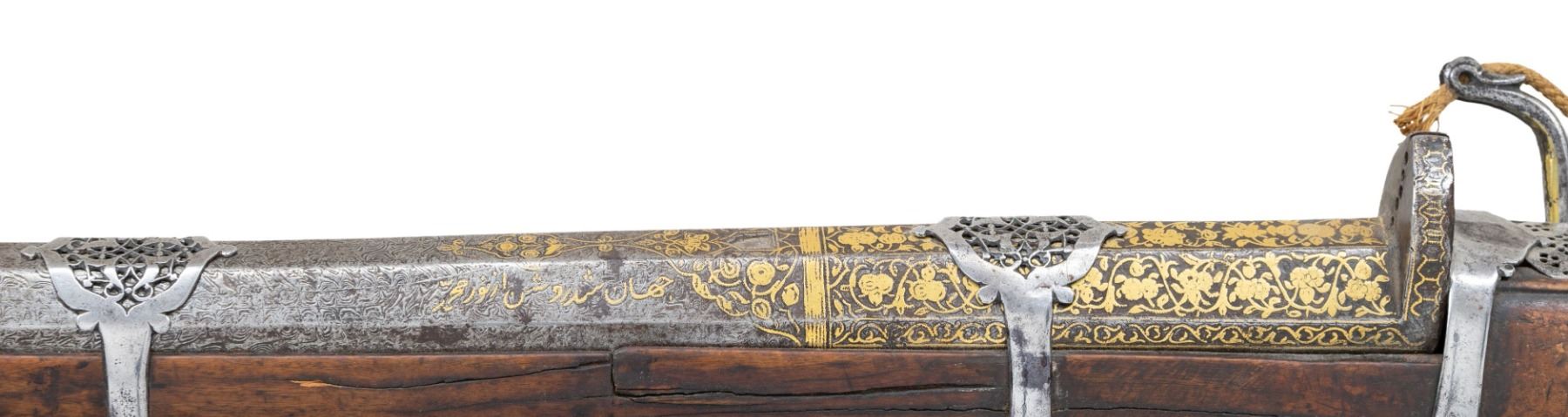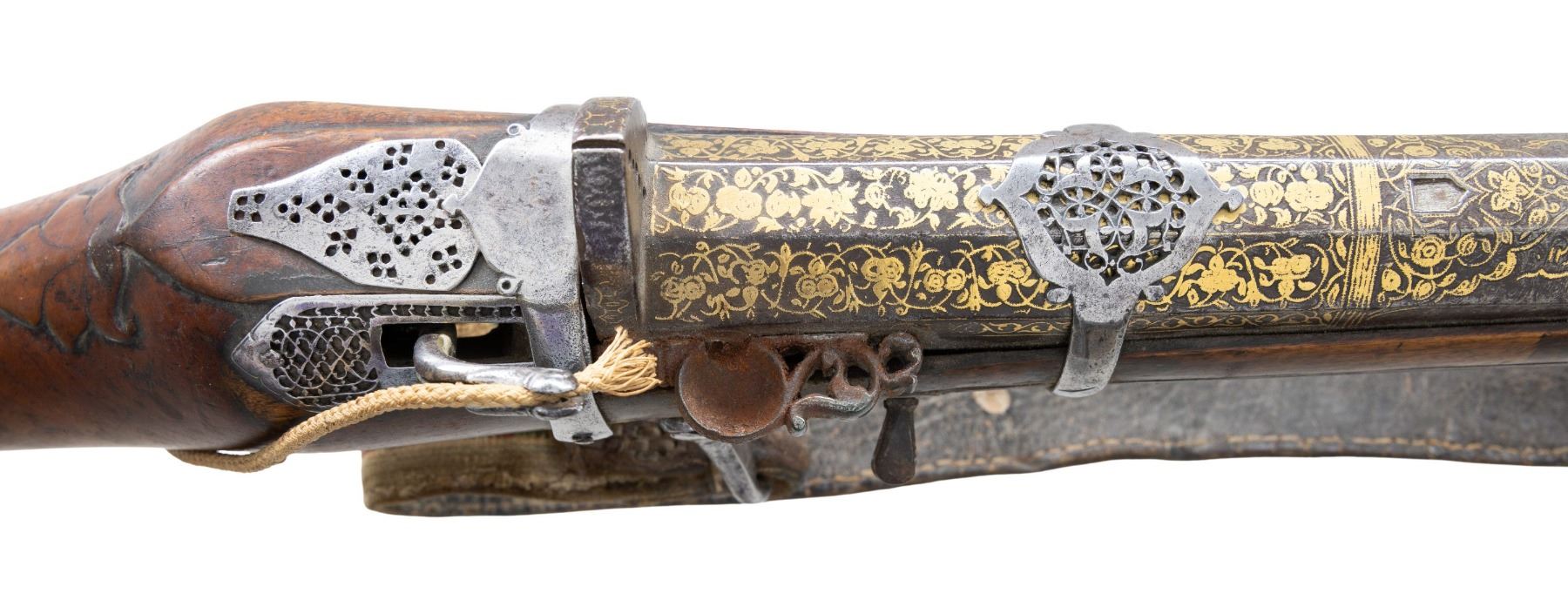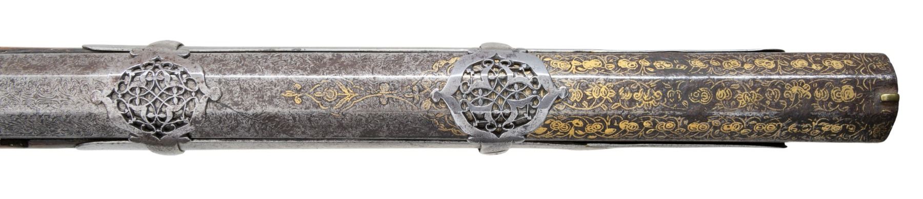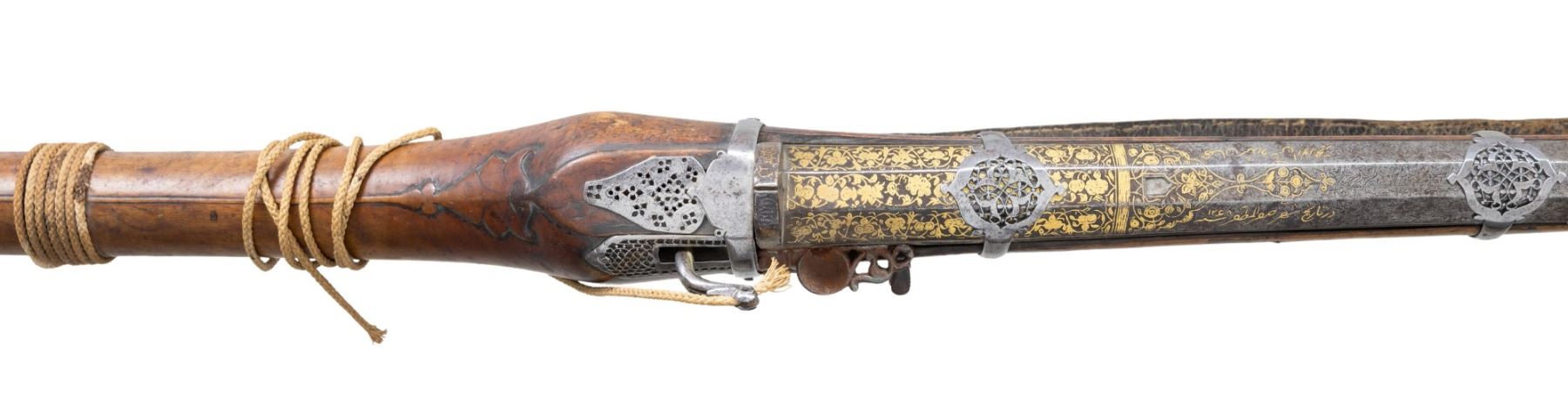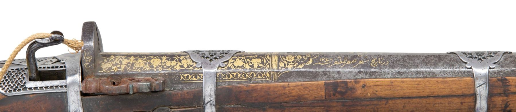 Cal. 65. NSN. 65" overall, heavy 48" octagonal swamped Damascus barrel with 2 Persian inscriptions, integral tall tombstone rear sight, gold floral arabesques inlaid at breech and muzzle. Gold inlaid Persian inscriptions translate "made at the town of Yorn in the month of July in the year 1267" [1850] and "The world shone as from the light of Muhammad" [when gun is fired]. 8 fine pierced steel barrel bands attach 9" sculpted steel nose cap and 8" front sling swivel plate, matching rear sling swivel mounted on stock at breech, Sling swivels have chiseled design. The original leather & fabric sling still attached. Matchlock mechanism is elegant, chiseled steel with pierced plates. The long, graceful stock has carved palmette moldings, checkered at butt terminating in ivory and chiseled steel butt cap, original chiseled ramrod. UNATTACHED ACCESSORIES: collection notes concerning meaning of markings and carving, history of purchase and possible provenance to Persian Qajar noble family. One page appraisal by Oliver S. Pinchot, 2004. CONDITION: very good overall, stock has old pinned inset repair rear of nose cap, several age cracks, hand worn patina. Steel mounts and matchlock mechanism are smooth and bright. Barrel's damascene surface is very good and complete, gold inlaid designs are complete with some reductions & wear at muzzle and edges of tall integral rear sight. Mechanically matchlock functions well, rust & corrosion in flash pan "as-found". Bore has deep twisted rifling. 2 lengths of original wick are very good. Ivory has numerous age cracks, sound & complete. PROVENANCE: Estate Collection of Dr. Curtis S. Morse. (01-26314/JS). ANTIQUE. $10,000-20,000.