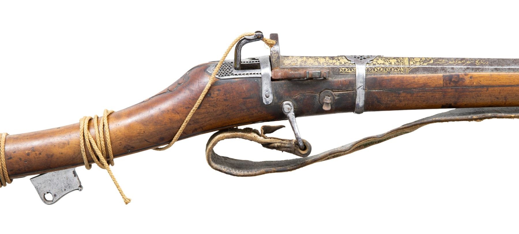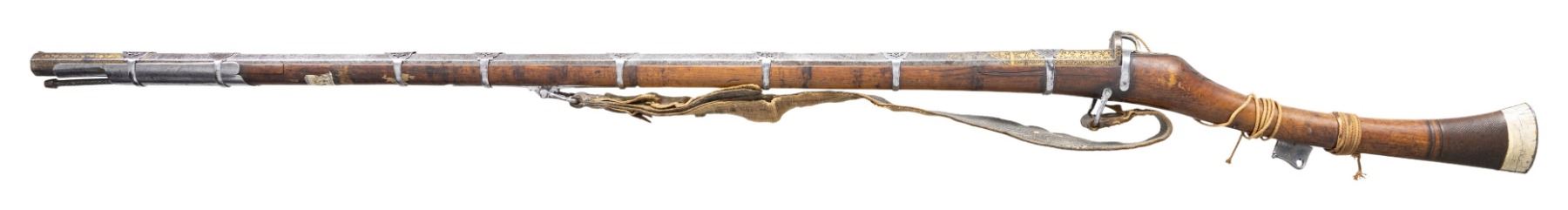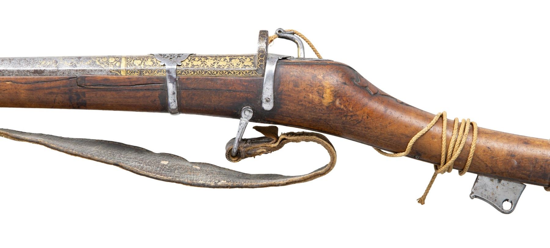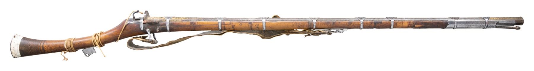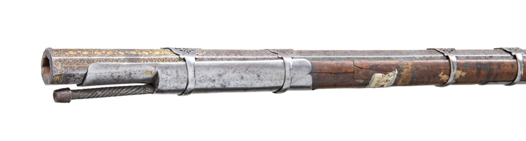 Cal. 65. NSN. 65" overall, heavy 48" octagonal swamped Damascus barrel with 2 Persian inscriptions, integral tall tombstone rear sight, gold floral arabesques inlaid at breech and muzzle. Gold inlaid Persian inscriptions translate "made at the town of Yorn in the month of July in the year 1267" [1850] and "The world shone as from the light of Muhammad" [when gun is fired]. 8 fine pierced steel barrel bands attach 9" sculpted steel nose cap and 8" front sling swivel plate, matching rear sling swivel mounted on stock at breech, Sling swivels have chiseled design. The original leather & fabric sling still attached. Matchlock mechanism is elegant, chiseled steel with pierced plates. The long, graceful stock has carved palmette moldings, checkered at butt terminating in ivory and chiseled steel butt cap, original chiseled ramrod. UNATTACHED ACCESSORIES: collection notes concerning meaning of markings and carving, history of purchase and possible provenance to Persian Qajar noble family. One page appraisal by Oliver S. Pinchot, 2004. CONDITION: very good overall, stock has old pinned inset repair rear of nose cap, several age cracks, hand worn patina. Steel mounts and matchlock mechanism are smooth and bright. Barrel's damascene surface is very good and complete, gold inlaid designs are complete with some reductions & wear at muzzle and edges of tall integral rear sight. Mechanically matchlock functions well, rust & corrosion in flash pan "as-found". Bore has deep twisted rifling. 2 lengths of original wick are very good. Ivory has numerous age cracks, sound & complete. PROVENANCE: Estate Collection of Dr. Curtis S. Morse. (01-26314/JS). ANTIQUE. $10,000-20,000.