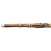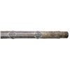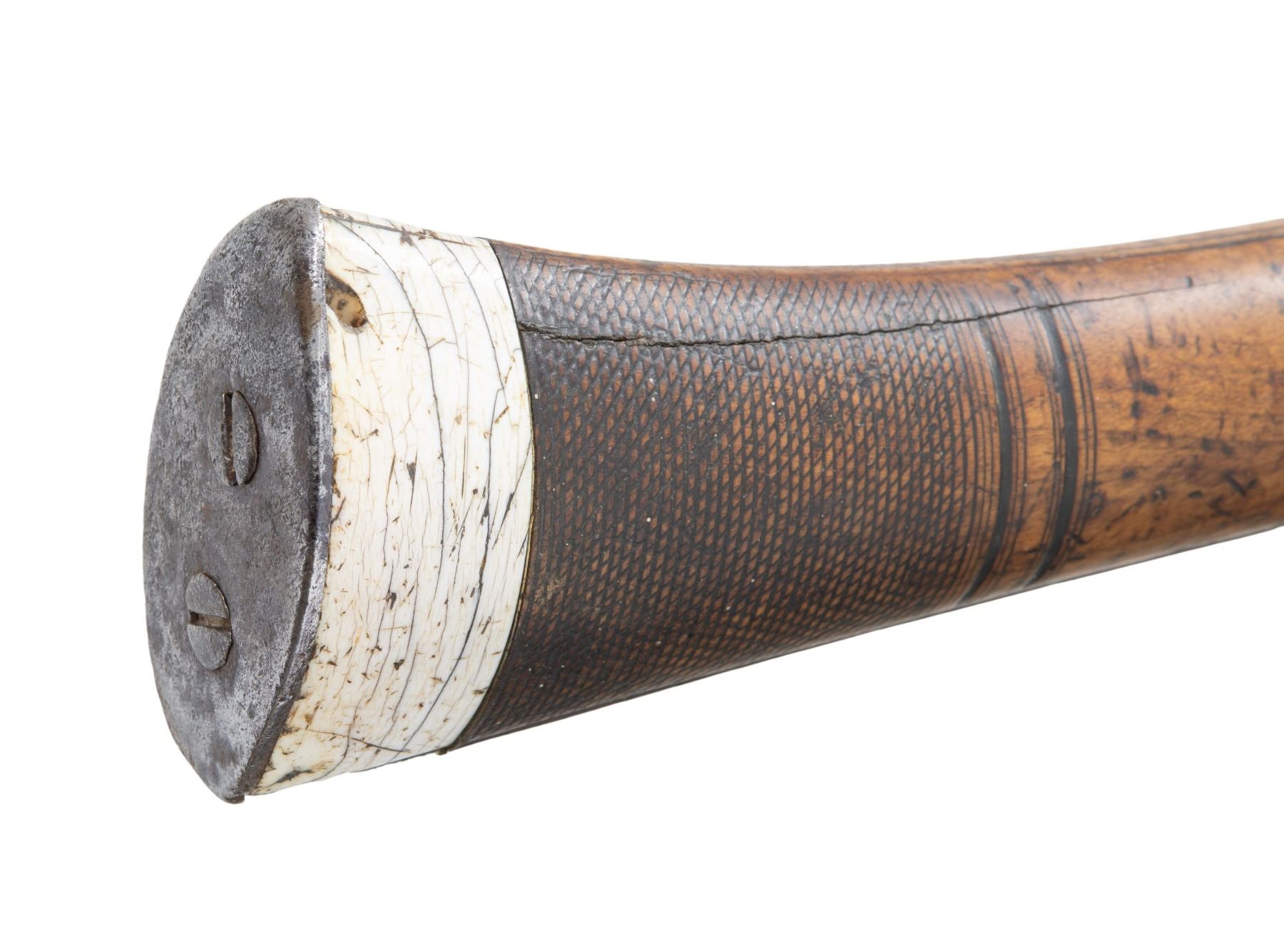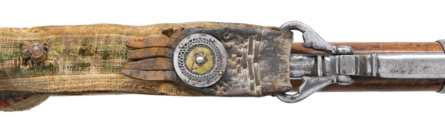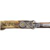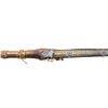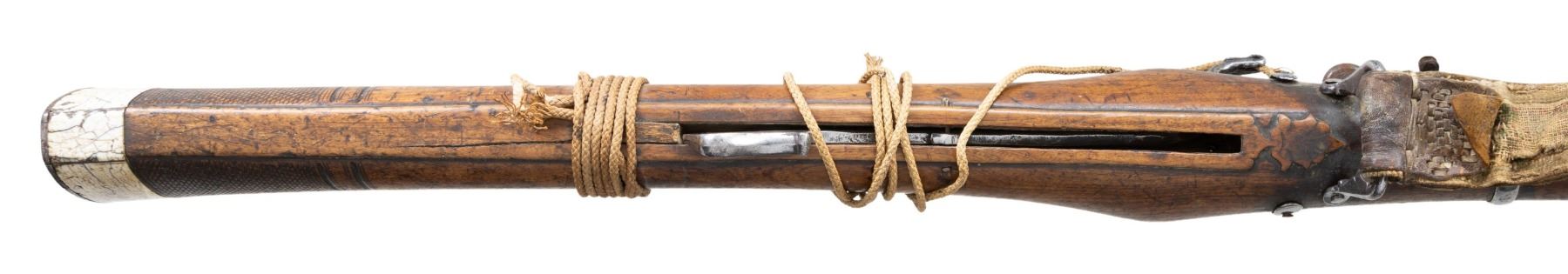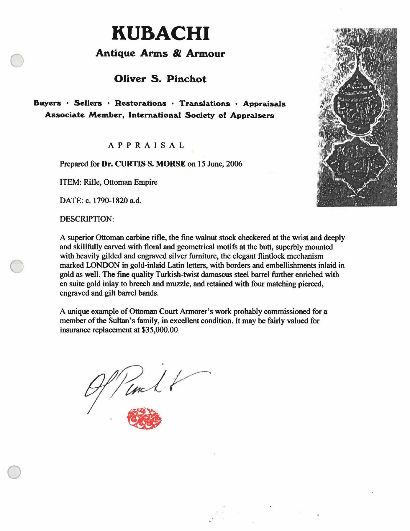 Cal. 65. NSN. 65" overall, heavy 48" octagonal swamped Damascus barrel with 2 Persian inscriptions, integral tall tombstone rear sight, gold floral arabesques inlaid at breech and muzzle. Gold inlaid Persian inscriptions translate "made at the town of Yorn in the month of July in the year 1267" [1850] and "The world shone as from the light of Muhammad" [when gun is fired]. 8 fine pierced steel barrel bands attach 9" sculpted steel nose cap and 8" front sling swivel plate, matching rear sling swivel mounted on stock at breech, Sling swivels have chiseled design. The original leather & fabric sling still attached. Matchlock mechanism is elegant, chiseled steel with pierced plates. The long, graceful stock has carved palmette moldings, checkered at butt terminating in ivory and chiseled steel butt cap, original chiseled ramrod. UNATTACHED ACCESSORIES: collection notes concerning meaning of markings and carving, history of purchase and possible provenance to Persian Qajar noble family. One page appraisal by Oliver S. Pinchot, 2004. CONDITION: very good overall, stock has old pinned inset repair rear of nose cap, several age cracks, hand worn patina. Steel mounts and matchlock mechanism are smooth and bright. Barrel's damascene surface is very good and complete, gold inlaid designs are complete with some reductions & wear at muzzle and edges of tall integral rear sight. Mechanically matchlock functions well, rust & corrosion in flash pan "as-found". Bore has deep twisted rifling. 2 lengths of original wick are very good. Ivory has numerous age cracks, sound & complete. PROVENANCE: Estate Collection of Dr. Curtis S. Morse. (01-26314/JS). ANTIQUE. $10,000-20,000.