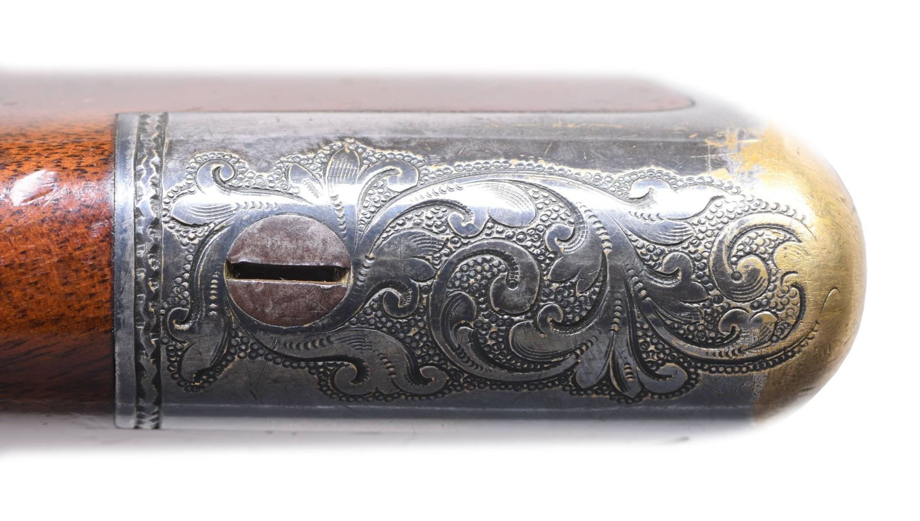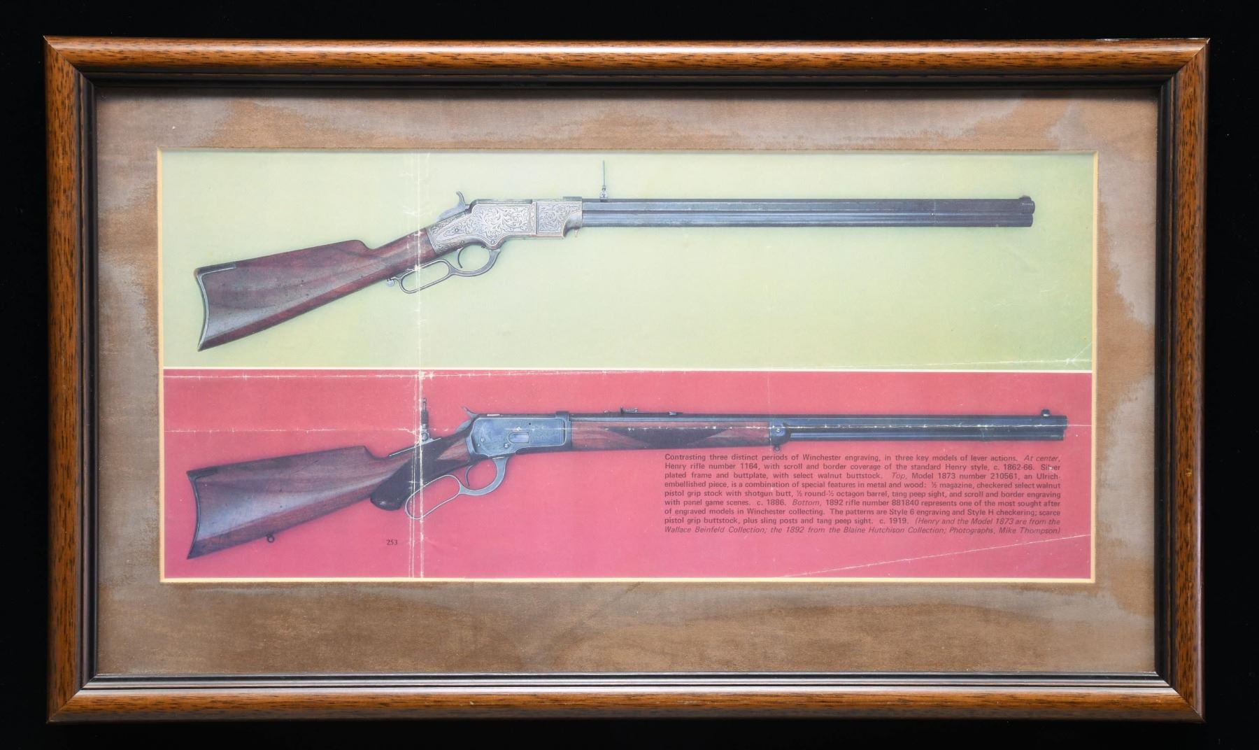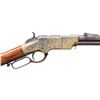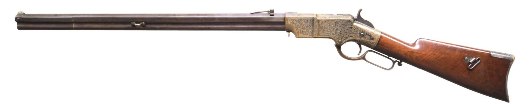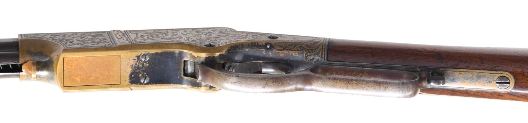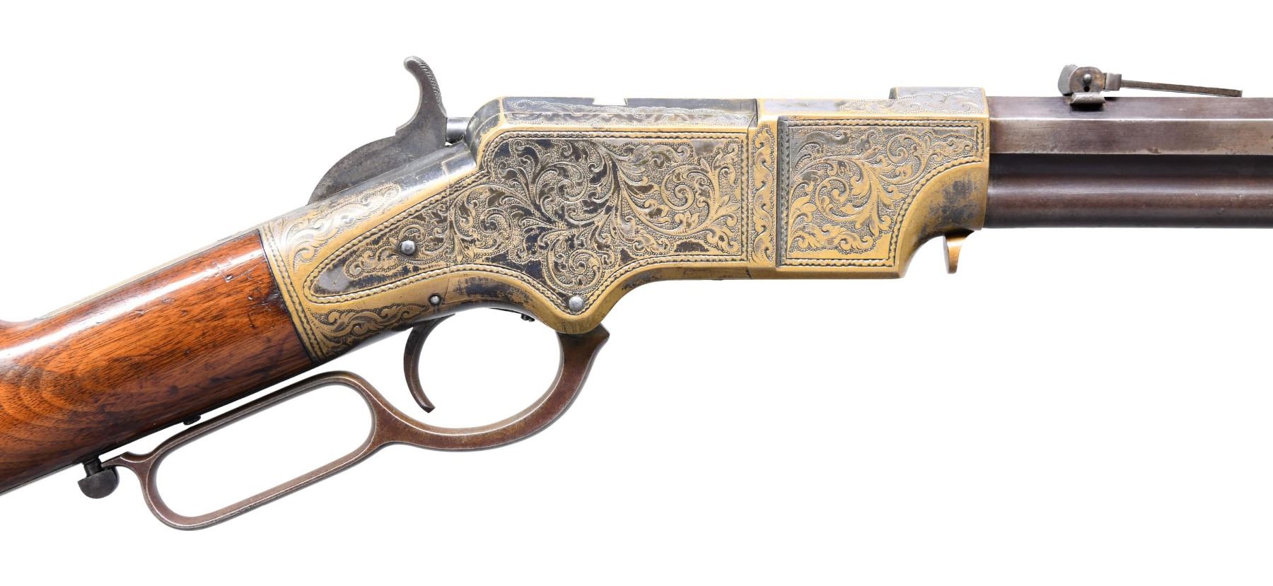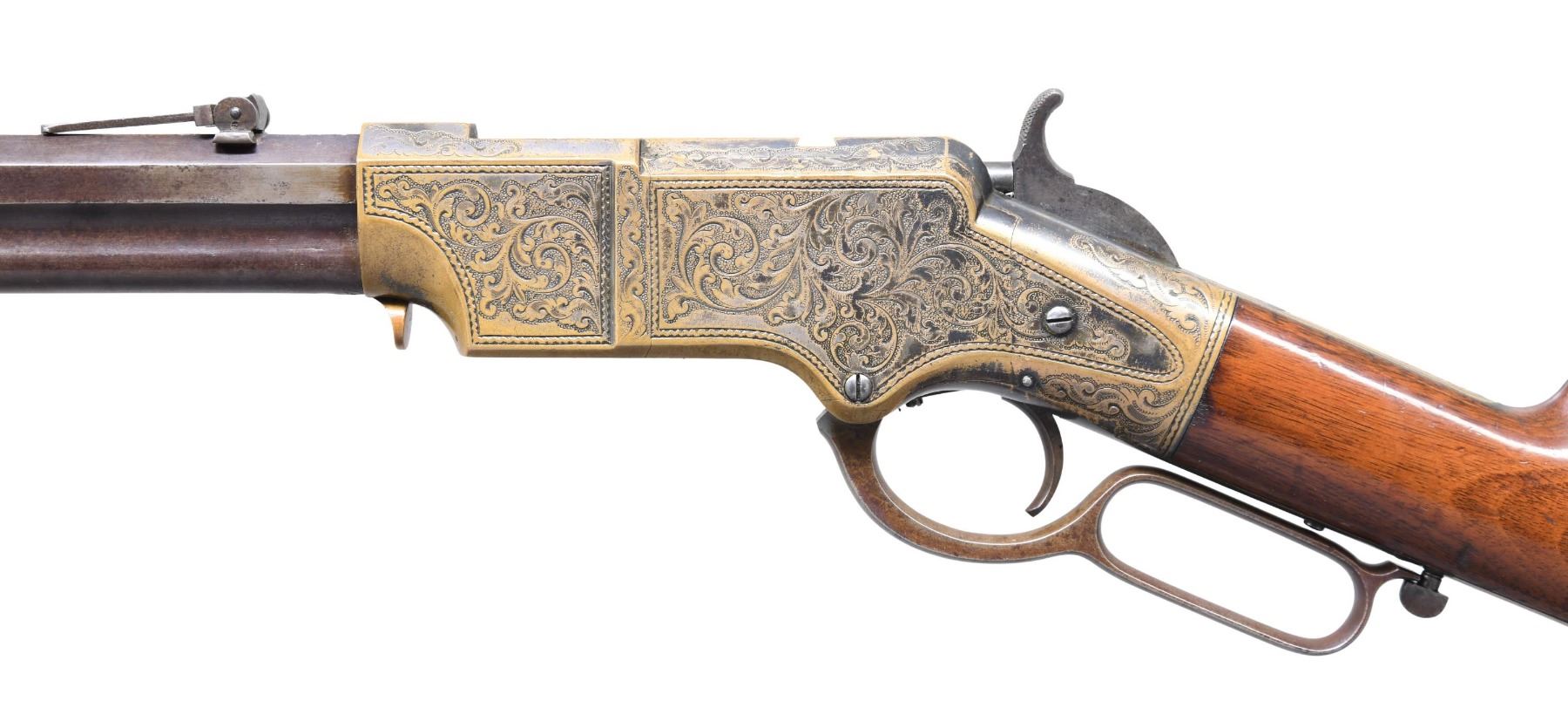 FACTORY ENGRAVED HENRY RIFLE. Please note as of 4/21/25 this item description has been updated. Please revisit this description and contact us with any questions. Cal. 44. S# 1164. This rifle is wonderful surviving silver plated elaborate factory engraved 1862 manufactured Henry rifle. All original and authentic with long collection history, last sold by Ivan Hart in 1978. This 2nd variation, 1st model spans serial range about 400-1500 with all proper characteristics, rounded butt plate with 7/8" wide trap door, .9" round mortise bored in butt stock to accept 4-piece wood & iron cleaning rod, lever latch, and earliest small magazine follower with 1/2" wide finger tab, half-moon rounded front sight blade which transitions to square back blade about serial #1200, transitional slanting profile of comb, noticeable perch belly profile to lower edge of stock which transitions to less noticeable in later production till end of production, varnish finish on stock, small 2.5" serif & sans-serif early barrel address, six groove rifling, sight dovetails milled in both barrel and receiver, 900 yard rear sight with no slide stop screw transitioned from 1000 yard sight around serial 1200, sling swivels on right side. Serial number stamped on following parts: barrel behind rear sight dovetail, left side of lower receiver tang, top receiver tang channel in butt stock, inside top edge of butt plate, and all 5 tang and buttplate screws. Matching assembly numbers stamped on rounded portion of barrel under loading sleeve and on rear edge of loading sleeve. Mounted on varnished select burl walnut. A cluster of Hoggson factory engraved guns fall in serial range 1000-1500, with about half being this higher coverage more elaborate engraving outside frame borders. All these elaborate engraved guns appear to have been plated. This example retains much original silver plate beautifully highlighting the deluxe scrolls. This is a beautiful & attractive deluxe engraved & silver finished rifle. UNATTACHED ACCESSORIES: file of research and provenance. Proof plate from RL Wilson's Winchester engraving book. CONDITION: excellent overall, retaining 40-50% original silver on frame & buttplate with much of the plating showing the decades of old black patina of an untouched/unpolished rifle. Barrel is fine smooth plum patina with strong traces of bright blue in protected areas. Mechanics are fine, crisp rifled bore with scattered pitting. PROVENANCE: Jim Fowler collection, Chattanooga 1960s; pictured in ANTIQUE ARMS ANNUAL 1971; Wally Beinfeld collection; Ivan Hart collection; pictured in WINCHESTER ENGRAVING, by Wilson 2008. (01-26500/JS). $90,000-140,000.