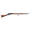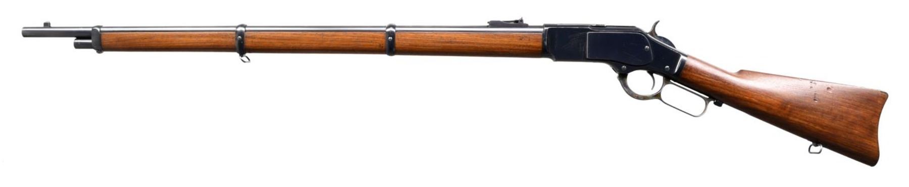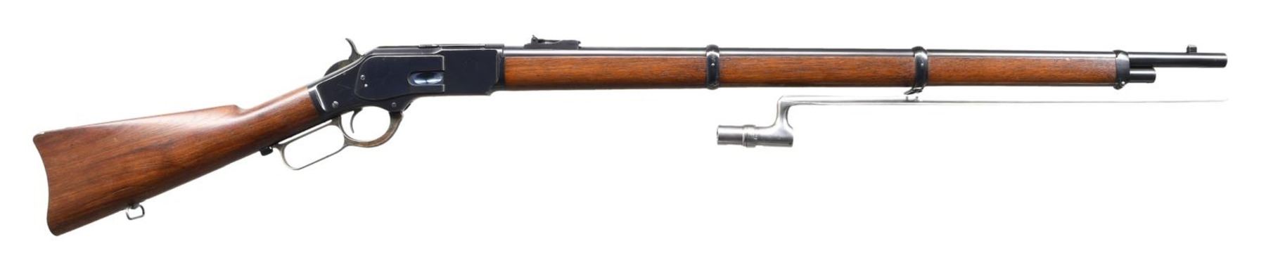 ACTION MUSKET. Cal. 44 WCF. S# 570163B. Bbl. 30" round w/ Barleycorn front sight & graduated leaf musket rear sight. Musket length mag. Blue finish w/ case colored hammer, trigger & lever. 3 band fastened walnut forearm & straight grip stock w/ case colored musket trapdoor buttplate & sling swivels. Mfg. 1902. UNATTACHED ACCESSORIES: an unmarked triangular blade socket bayonet. Bayonet has been cleaned bright. CONDITION: very fine, retaining over 97% blue & case colored finish. Receiver shows small spots of pitting & fine scratches. Very good wood finish showing scattered dents & handling marks. Bright near excellent bore. (24-787/DS). CURIO. $3,000-5,000.
