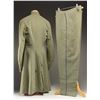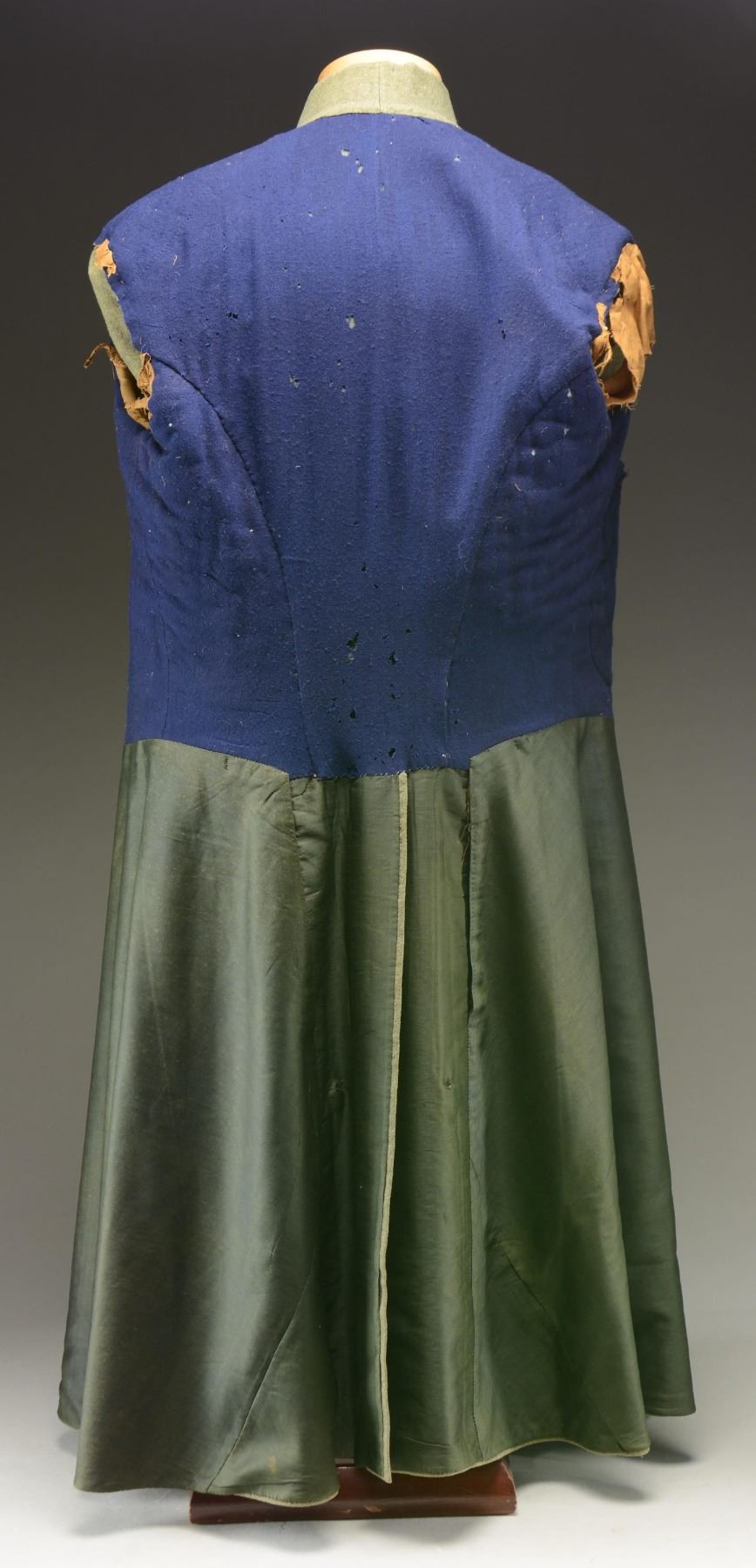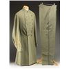 OFFICER'S FROCK COAT & MATCHING TROUSERS BY WILLIAM POOLEY OF MEMPHIS, TN. This beautifully tailored uniform consists of a full-length, double-breasted frock coat and matching trousers of a green/gray woolen broadcloth in a tabby weave. The weave appears to be about 60 threads per inch in both the warp and the weft. The warp looks to be very fine brown cotton with a gray woolen weft. The finely made, obviously expensive cloth is light in weight but holds its shape well and does not wrinkle. The coat has a 6-piece body consisting of two front panels, two side back panels, and two central back panels with a center seam. There are seven coat-size Confederate script “I” buttons on each side of the breast, conforming to Confederate regulations. The CS-177-A buttons bear the backmark “S. ISAACS CAMPBELL & CO 71 JERMYN ST LONDON”. The button holes are conventional in style and type, being hand-sewn with black thread over a larger brownish thread around the edge of the button hole. The standing 1 5/8” collar is made of two pieces and lined with the same material as the coat. There is no indication that the collar ever had any type of insignia attached. The 2-piece sleeves measure 5 1/4" across at the cuff and 9 1/4" across at the elbow. There are no colored facings on the non-functional cuffs. Each cuff has three small 14mm Confederate script “I” buttons, bearing the backmark “TREBEL RICH STANDARD” and identified as CS-177-Av. Each sleeve bears three strands of gold bullion “Austrian knots”, which is regulation for a Major, Lieutenant Colonel, or Colonel. This large, flamboyant insignia extends 15 3/8” up the sleeve from the edge of the cuff. The skirt of the coat is of conventional frock coat form and originally had four coat-size buttons, similar to those on the front. The two upper buttons are missing, but the two on the ends of the pocket flaps remain present. There are pocket bags on the inside of the skirts under the lining made of dark brown, lightly glazed cotton. The frock coat is lined in the button falls with the same material utilized for the coat. The upper body is lined in a dark blue, tabby weave wool flannel. There is a 6 1/4" x 7” patch pocket at the left breast made of the same material as the blue lining. The entire skirt is lined in what appears to be a very fine greenish brown cotton material. The sleeves are lined with a coarse, light brown cotton twill. The front of the coat measures 17 1/8” from the bottom of the collar to the waist seam. The back of the coat measures 19 1/2" from the bottom of the collar to the waist seam. The skirt is 21” long in the front and 3/8” longer in the back. Accompanying this fine coat is a matching set of trousers of the same material with an adjustment belt in the rear and a Japanned buckle marked “PATENT 1855”. The fly consists of two layers of trouser material lined with dark brown cotton that is closed by means of four black Japanned metal buttons measuring 13mm. The waistband closes with a single button of similar form but measuring 17mm. Perhaps the most important button on the uniform is an inside Japanned metal button for inside closure of the fly to maintain a flat appearance. This 14mm button is clearly marked “WM. POOLEY. MEMPHIS TENN.” The pants are lined with a light-colored cotton twill, and the material appears the same on the pocket bags. The trousers have side slit pockets in line with the dark blue velvet-piped seam. This uniform was originally found at a yard sale near Dallas, TX, in the 1970s, and at one time was accompanied by a white cotton vest with Mississippi “I” buttons. The William Pooley button indicates that he was the tailor who made the uniform in Memphis, TN, and we can assume, because of the aforementioned vest, that it was for a Mississippi officer of a rank from Major to Colonel. All buttons, whether script “I" buttons or black Japanned pants buttons, are original to the coat and further reinforce the assumption that William Pooley created this exceptional uniform. Since Memphis fell to Federal forces in June of 1862, it is quite likely the uniform was made during the first year of hostilities. UNATTACHED ACCESSORIES: a looseleaf binder containing several images of the uniform and the vest that once accompanied the set. The binder also contains a detailed letter from Les Jensen of New York, authenticating and describing in great detail the uniform and its manufacturer. Also included is the original letter written by Mr. Jensen to a previous owner when the vest still remained with the uniform. CONDITION: the uniform is in truly extraordinary condition for its age and shows only the very slightest traces of moth damage. Seams are generally tight with a few minor small openings and one notable seam opening on the right sleeve. When this coat was first discovered, it has several separated seams. The seams were resewn with museum quality precision. Modern thread was used as museum restorations would require. The quality of the seam strengthening is extraordinary. Buttons are original and complete, except for two at the top of the tail. Pants buttons are also original and complete. The small cinching belt in the back is detached but present, being held on by a safety pin. It would be difficult to imagine a Confederate uniform of finer cloth or better condition. (02-23306/BF). $25,000-35,000.