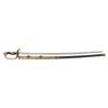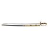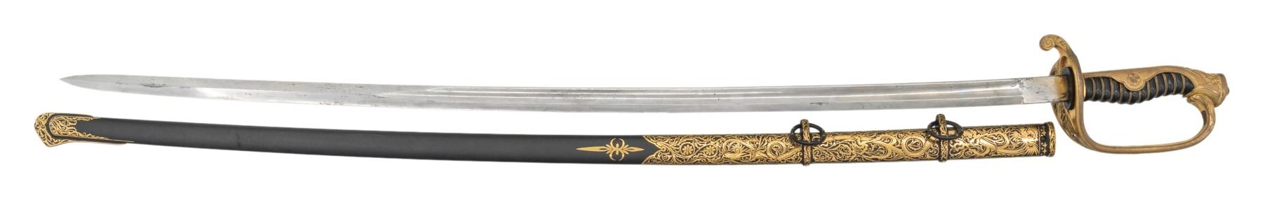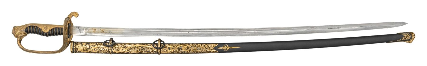 PARADE SABER.This Japanese army parade saber has an incredibly ornate gold encrusted scabbard. The sword measures 36" overall with a single fullered plain 29 3/4" blade with a plated finish. There are two initials inlaid in gold near the ricasso of the blade. Gilded brass hilt with a pierced guard and plain knuckle bow. Ornate pummel and backstrap with 10 petal cherry blossoms. Wire wrapped black composite grip. The superbly decorated scabbard has a darkened finish with heavy gold inlay over the top 15". The inlays show a 10" dragon on each side with a plethora of scroll and foliate motifs. Even the suspension rings have inlaid gold crosses throughout. The tip of the scabbard as well as the drag also show scrolled gold inlay work. This is most assuredly the highest grade army parade saber that we have seen come through our doors. CONDITION: The blade has a few small areas of plating loss. The hilt shows light wear with the vast majority of the gilded finish remaining. The scabbard shows very light wear and is of truly exceptional merit. (02-25815/BF) $1000-1500.