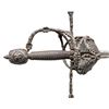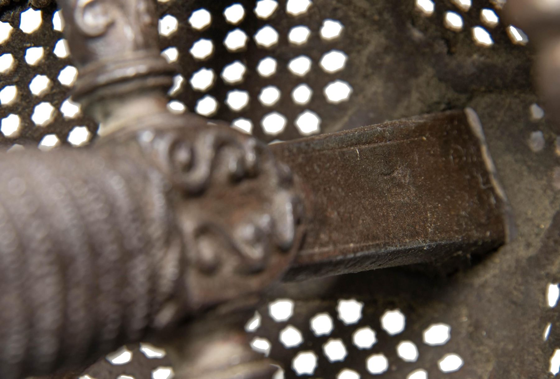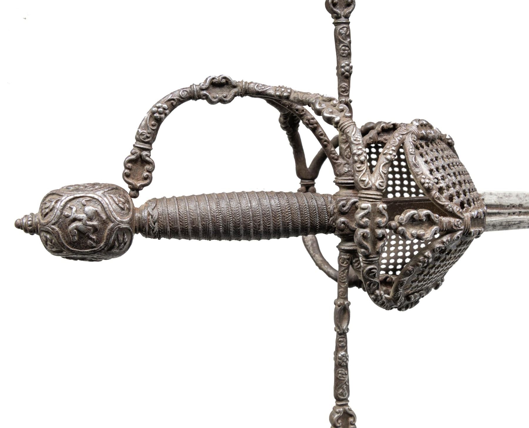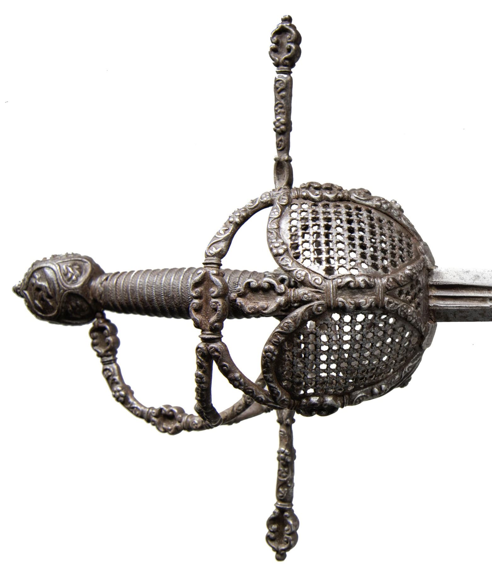 This rapier has a beautifully made very ornate hilt that appears to be of cast and hammered steel. The swords overall length is 48 1/4" and the blade length is38 3/8". The blade has two central fullers with partially discernable inscriptions along with an armorers mark just below the fuller on each side. Large double disk guard similar to a bilbo hilt with intricate designs and pierced ovals. The crossguard measures 12" across and is also quite ornate. The motif of the knuckle bow and the massive pommel match the rest of the sword. Wire wrapped gip with Turk's head knots above and below. CONDITION: blade has a lightly cleaned medium gray mottled patina and the hilt generally shows light wear with a medium gray patina. PROVENANCE: Estate Collection of Nicholas Apergis. (02-24765/BF). $3000-5000.
