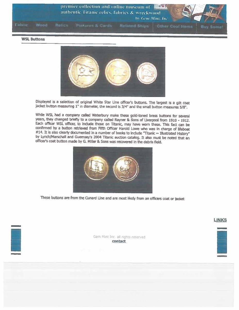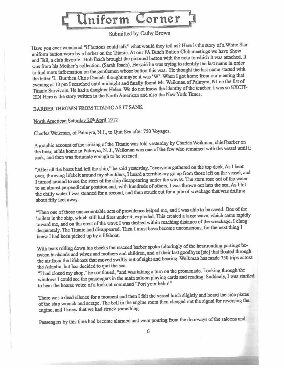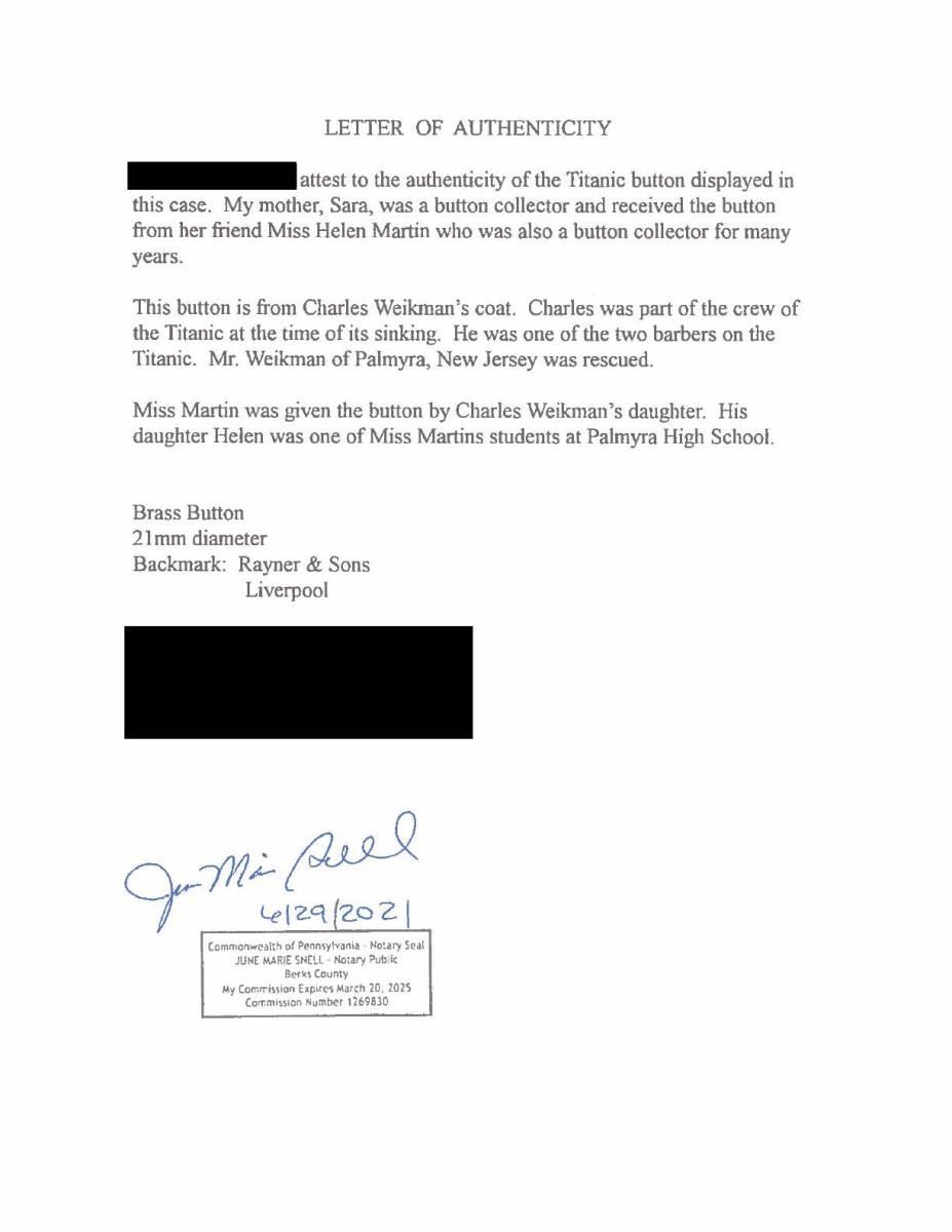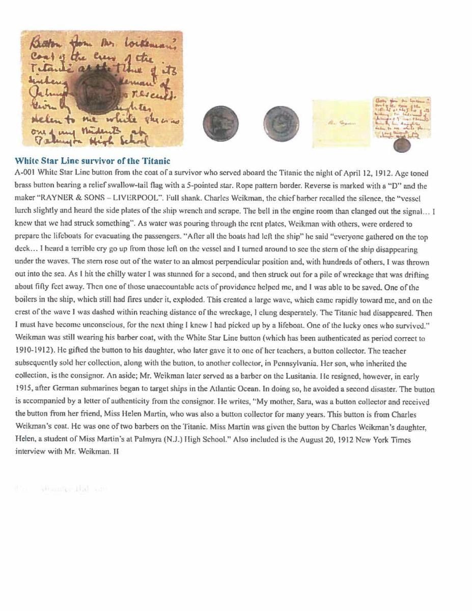 BUTTON FROM A SURVIVOR OF THE TITANIC. This button represents an incident infamous in the annals of maritime history, the sinking of the RMS Titanic. This button was worn by the chief barber onboard named Charles Weikman from Palmyra, NJ. On the night of April 12, 1912, the Titanic struck an iceberg and proceeded to sink in Arctic waters. Charles Weikman was ordered to prepare the lifeboats for passenger evacuation. Subsequent to the entire compliment of lifeboats leaving the ship the remaining crew gathered on the top deck. Weikman reports hearing terrible cries as the stern of the ship slowly sunk toward oblivion. During the final death throes of the great ship the stern rose out of the water to a nearly perpendicular position. At this point, Weikman was thrown into the water clear of the sinking. He attempted to make his way toward floating debris as the boiler exploded during the ship’s sinking. The ensuing wave cast him up on a small floating island of wreckage. Shortly thereafter he lost consciousness and awoke to being rescued by one of the many lifeboats. A button worn by Weikman on his uniform during his ordeal is offered here. The button depicts a White Star Line company flag with a rope border. The reverse is marked “RAYNER & SONS . LIVERPOOL . “, which is correct for the 1910 to 1912 period when Titanic was outfitted. The button also has a letter D next to the shank. It is attached to an original card, inscribed with a dip pen, that reads “Button from Mr. Weikman’s coat of the crew of the Titanic at the time of its sinking. Mr. Weikman of Palmyra, N.J. was rescued. Given by his daughter Helen to me while she was one of my students at Palmyra High School.” UNATTACHED ACCESSORIES: several pages of provenance and news stories about the button. There is a notarized letter from a previous owner of the button as well as documentation from a previous sale of the button. CONDITION: the button has a pleasing patina with traces of gilt remaining. The shank is straight and the back mark is clear. The attached note is quite yellowed attesting to its age, but the inscription remains clear. (02-18118/BF). $2,000-3,000.