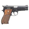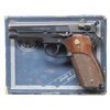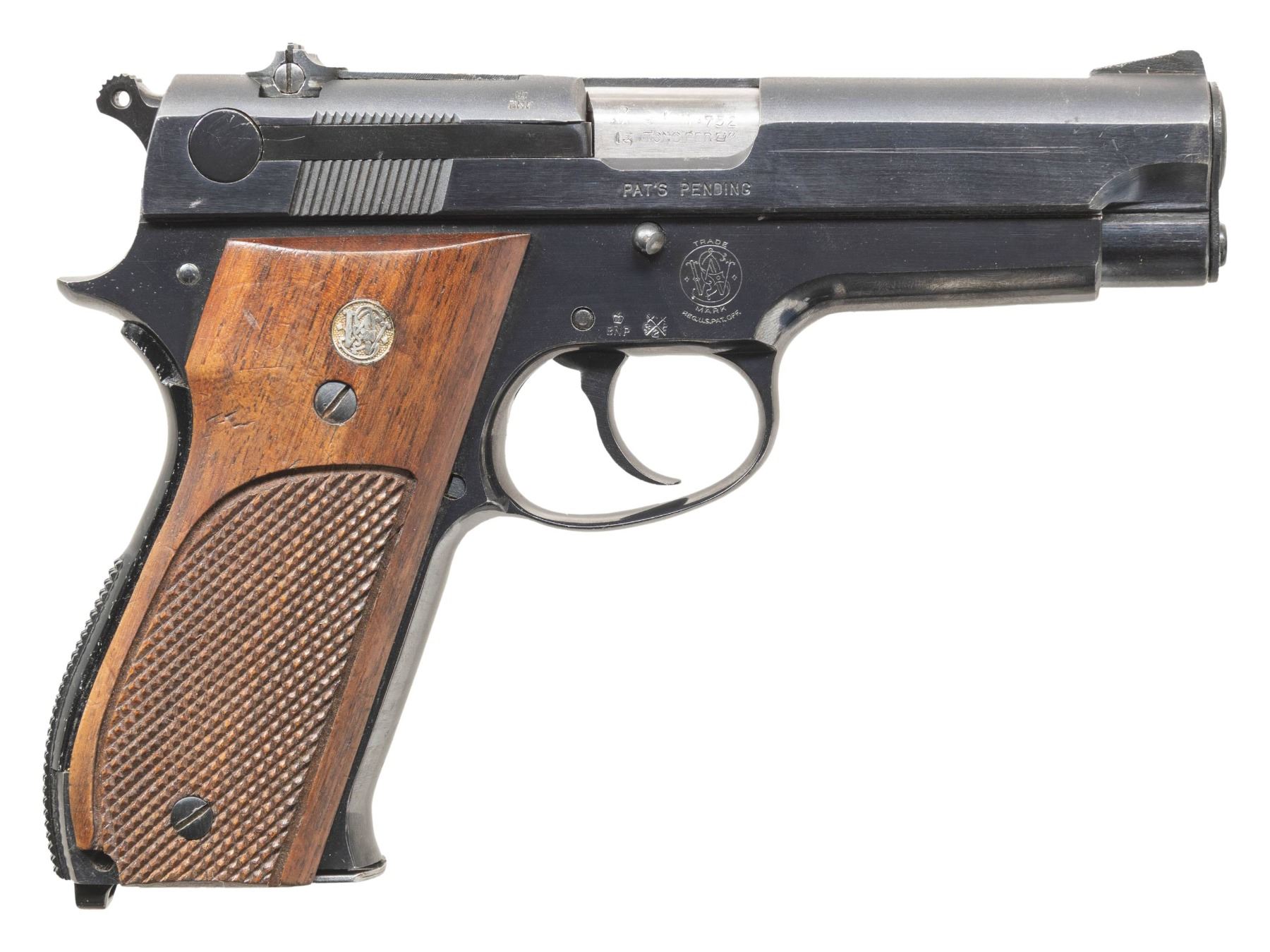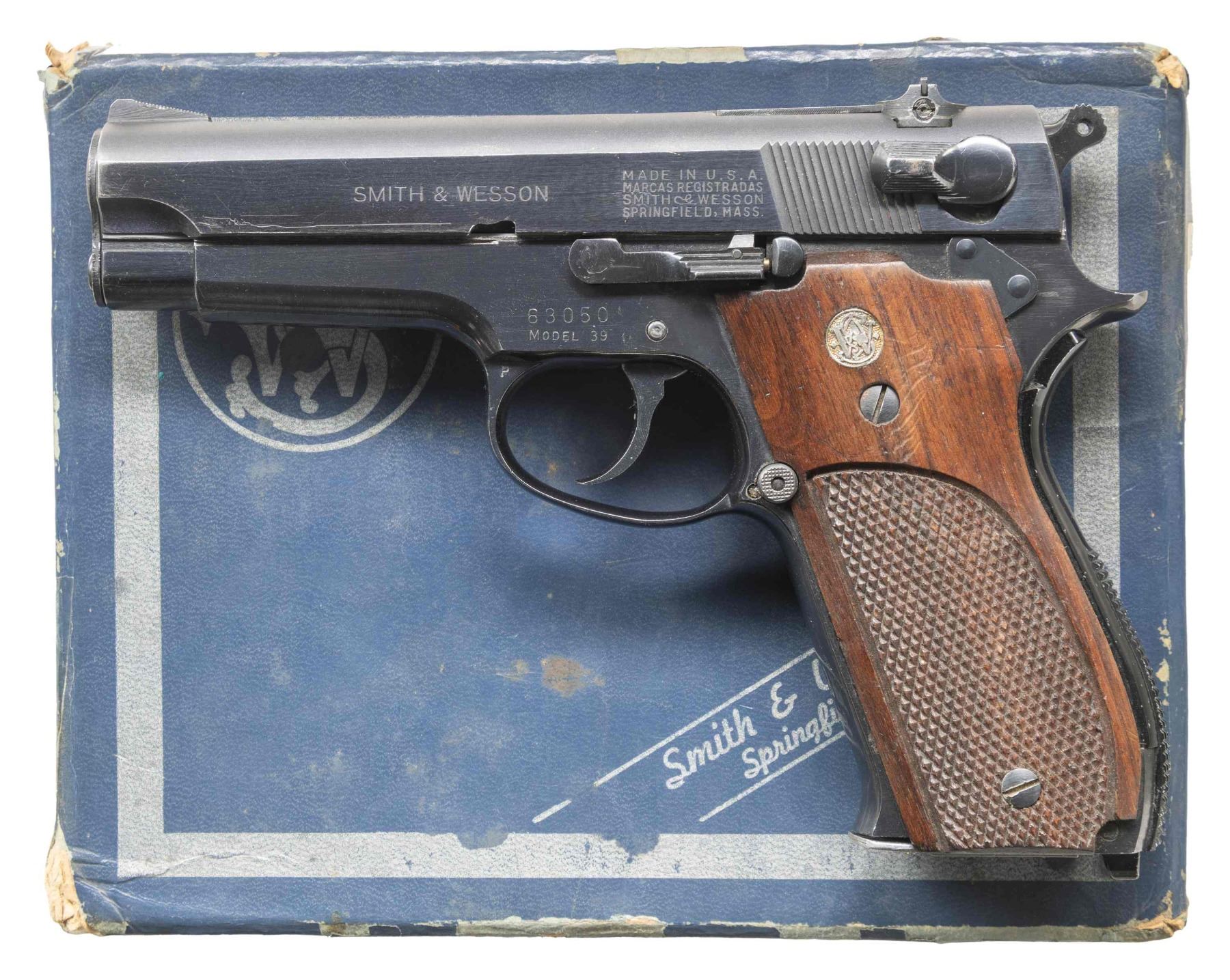 SMITH & WESSON MODEL 39 SEMI-AUTOMATIC PISTOL WITH MATCHING FACTORY BOX. Cal. 9mm Luger. S# 63050. Bbl. 4". 1 of only 927 steel frame Model 39 semi-automatic pistols mfg. by Smith & Wesson in 1966, this example being part of the second batch, falling between S#s 60000-64000. The left side of the slide is marked "SMITH & WESSON", followed by S&W's mfg. information, with "PAT'S PENDING" marked on the right. Left side of the frame is marked with the S# above "MODEL 39", with the S&W trademark logo marked on the right. Right side of the frame, slide, and bbl. exhibit British proofing. Metal components exhibit a blue finish overall, save for on the checkered alloy back strap, which exhibits a black anodized finish. Chamber area of the bbl. is polished in-the-white. Frame is mounted with 2-piece S&W trademark logo medallion checkered wood grips. Slide features an early long pattern extractor, with a serrated blade front sight and micrometer adj. square notch rear sight. MAGS: x3 blued steel 8-rd., x2 matte blue, x1 polished blue. UNATTACHED ACCESSORIES: matching factory box, containing a factory diagram, parts list, and instructions pamphlet. CONDITION: metal components retain the vast majority of their original factory blue finish, exhibiting some spots of light edge wear, with scattered superficial handling marks overall. Alloy grip strap shows small scattered superficial handling marks. Mirror bore, exhibiting a few small spots of minor pitting towards the muzzle, while retaining well defined rifling throughout. Proper manual mechanics, to include the safety / decocking lever. Grips show mild smoothing, as well as scattered marks and impressions from handling and storage, but otherwise remain sound. Box exhibits moderate wear, showing 2 corner tears on the lid (1 with taped repair), with a tear also present on the body. An extremely scarce example of a steel frame Smith & Wesson Model 39 semi-automatic pistol. (25-5372/MLW). CURIO. $1,500-2,500.