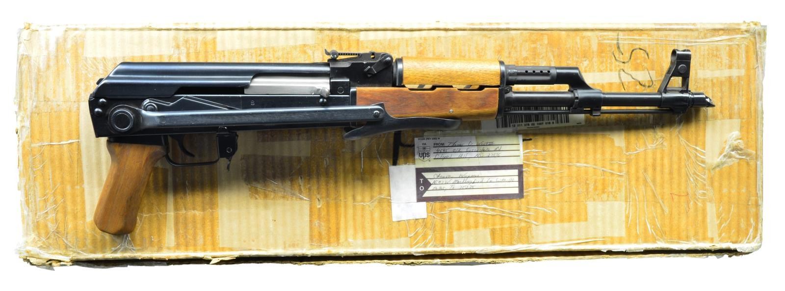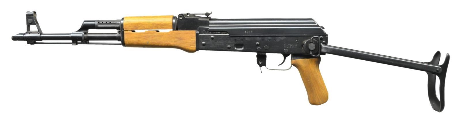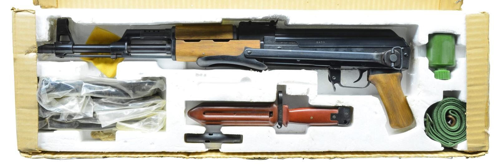 Cal. 223. S# PF85000408. Bbl. 16”. The ultimate in 1980s gun culture were the Chinese mfg. AK47 variants that were once so plentiful & inexpensive. The highest quality & most sought after variants were mfg. by Polytech & imported in numerous configurations. As their popularity increased in the United States w/ shooters & collectors & the availability of the once rare 7.62x39mm ammunition became available, we were faced w/ the first of numerous pieces of legislation dealing w/ the propaganda push of the day & firearms w/ similar attributes were branded “assault weapons” & eventually heavily restricted. Of course the full autos were already heavily under attack & their mfg. ceased on May 19, 1986. One of the first new restrictions regarding the semi automatic versions to go into effect was mandated by executive order w/out legislative involvement & banned the importation of guns that didn’t qualify as having a sporting purpose. One of the most noticeable & popular functional features is the bottom folding metal stock that was designed to completely fold over & around a loaded 30 rd. mag. This particular example is a textbook piece w/ its light brown hardwood furniture, still in factory packaging as it left China. Stamped receiver. Hooded front sight post & rear sight adj. in elevation to 800m. Safety selector on right side of receiver. Complete w/ its bayonet, scabbard, threaded bbl. & slanted muzzle brake. MAGS: 3 - 30 rd. factory. UNATTACHED ACCESSORIES: factory box & all components as shipped from Polytech including green canvas sling, oil bottle, cylindrical cleaning kit & magazines still unsealed plastic bags. CONDITION: all outward appearances indicate that this particular example may have been removed from its factory packaging only for display & occasional light fondling after being converted to full auto by SWD Inc. in Atlanta, Georgia as we received it in its original styrofoam lined cardboard box. All factory provided components are still nestled in their proper place. Finish coverage is complete w/ only thinning between stock & receiver, which can’t be avoided once extended & collapsed. Light impressions in lower handguard that correspond w/ closed placement of folding stock. Lower receiver marked “SWD INC., ATL. GA” left side trigger on bottom. Fire control mechanism appears to function correctly when cycled by hand. Bore is shiny w/ strong rifling. NATIONAL FIREARMS ACT MG REQUIRING BATF TRANSFER BEFORE TAKING POSSESSION. FULLY TRANSFERABLE. (03-1528/JZ). MODERN CLASS III. $13,000-18,000.