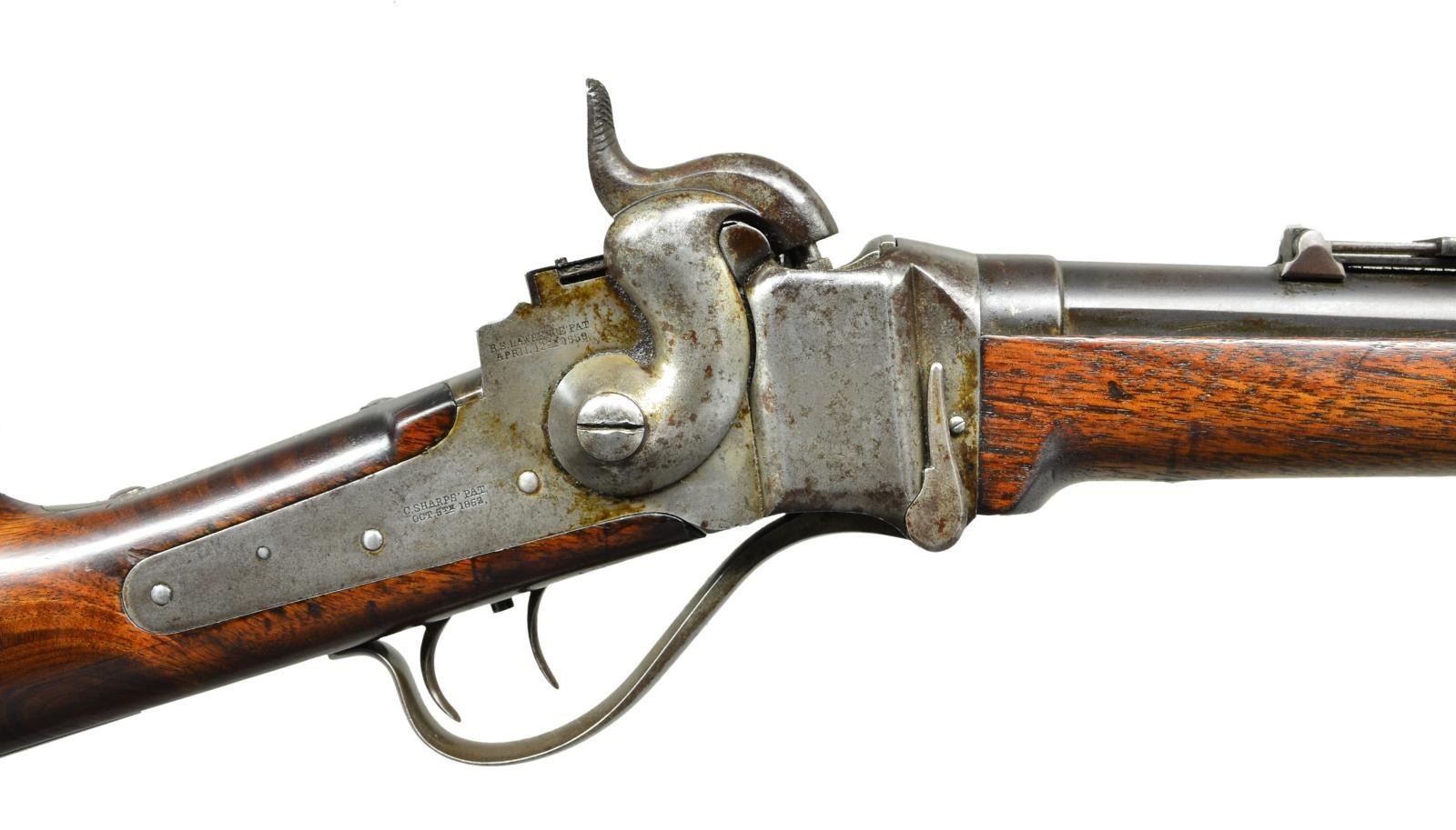 Cal. 52. S# 56113. Bbl. 30". Among the most iconic of Civil War Union firearms is the Sharps rifle with Hiram Berdan modifications for his elite Sharpshooter units which accounted for the highest kill rate of any regiment in Army of the Potomac. 47" overall, iron mounted, blued barrel, case hardened frame & breech. Berdan who formed the 1st & 2nd US Sharp Shooters Regiments ordered 2000 rifles early in 1862. His model 1859 sharps rifles were made with special double set triggers, improved breech lever without catch, long range rear sights with German silver blade mounted front sights which doubled as bayonet lugs. All were only inspected by John Taylor a civilian employee of the Springfield Armory. This rifle has fine "JT" final inspection cartouche. John Taylor’s sub-inspection "T" also found on barrel breech. Wiley Sword wrote the quintessential 1988 text: "Sharpshooter: Hiram Berdan, his famous Sharpshooters and their Sharps Rifles". This is the featured rifle in book illustrated and shown as among surviving examples. This rifle not only has every characteristic and marking, it also has the most beautiful burled stock which is rarely seen on a military gun. Frank sellers in his 1988 text "Sharps firearms" opined only 500 double set Berdan Sharps were made and that the other 1500 guns that filled contract were in different configuration such as single trigger. Roy Marcot in his 2008 text "US Sharpshooters, Berdan’s Civil War Elite" states that 43 documented Berdan Sharps survive, but none better than this one or better provenanced. The following lot is an identical configuration but not inspected by John Taylor so not necessarily Berdan issue. CONDITION: probably the best of all documented Berdan Sharps. Fine overall, strong thin blue on barrel blending to plum, frame & breech have overall mottled smooth silver gray patina, stocks sound & well fit, very good JT cartouche. All markings clear & discernible. PROVENANCE: ex-Wiley Sword Collection. (01-23320/JS). $15,000-30,000.