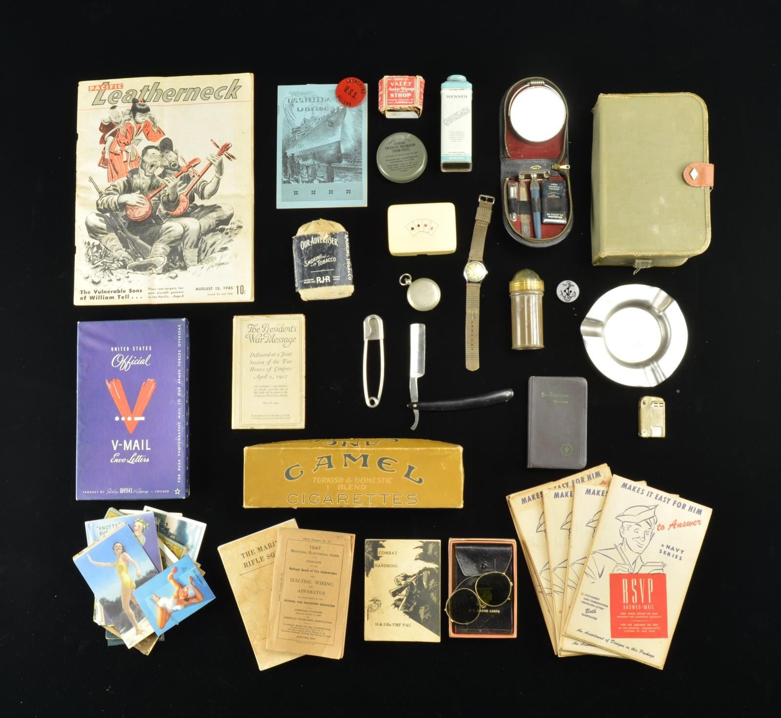 Various paper ephemera related to the US Marine Corp w/ notable items to include, but not limited to: Gillette shaving kit in leather zippered pouch. / $2 mess coupon. / Traveling hygiene kit. / Elrex watch. / 5+ Magazines in plastic sleeves. / 10+ Training books & manuals. / An assortment of postcards. / Sewing kit. / Deck of international "Signalcards". / Headquarters USMC card & Camp Elliot card. / photographs & documents off the USS Wright. / Sewing kit w/ naval motifs. / 3 Volume set of "INSTRUCTION MANUALS FOR STEAMFITTING APPRENTICES" volumes 1, 2 & 3 in fair condition w/ deterioating bindings & covers. / CONDITION :majority of items in good condition w/ wear & staining commensurate w/ age. (02-15919-2/MD). $500-1,000.