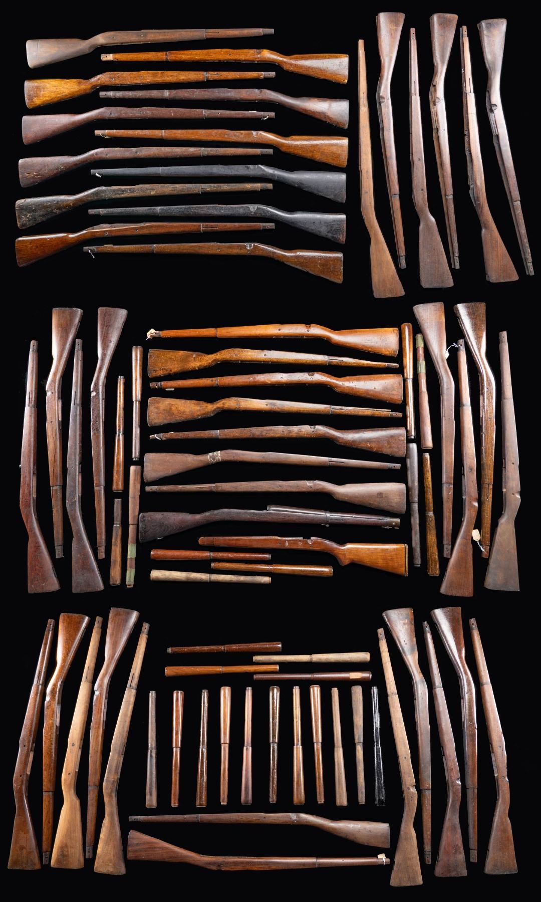 BOLT-ACTION RIFLE STOCKS AND 26 HANDGUARDS. Stocks are predominantly walnut w/ one or two exceptions. 34 of the stocks are straight grip, 13 are scant grip & 1 stock is sporter modified pistol grip. Stocks will have either reinforcing pins or bolts. Stocks were taken from rifles which had seen long hard service. CONDITION: stocks will have extensive wear, staining & handling marks. Many have cracks & missing chips. Most have arsenal rework type finishes. The handguards are in similar condition. (02-24590-48/RW). NON-GUN. $600-800.