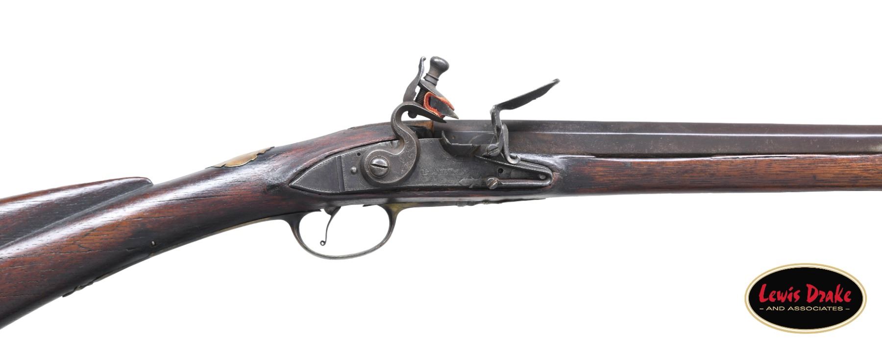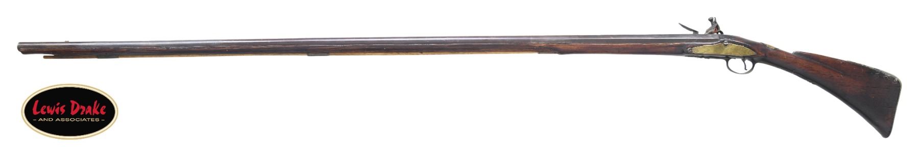 Cal. 71. S# NSN. Bbl. 53 1/2" octagon to round w/ smoothbore. Overall length is 69 1/2". Lock is marked Pomeroy. Curled plain trigger. Full length pin fastened stock. Brass fittings include buttplate w/ ornate tang, engraved trigger guard w/ style finial, engraved sideplate, faceted thimble & 2 faceted pipes. Wrist has an ornate brass plate. Right side of stock has carved initials "AC". Hardwood ramrod. CONDITION: metal finish has faded to brown showing handling marks & some very light pitting. Stock has heavily weathered appearance missing wood in forearm, lock & tang areas. Sound lock & trigger. Dark pitted bore. PROVENANCE: from the renowned collection of quality sporting arms from Lewis Drake together with inventory of Lewis Drake Associates. (01-26139/DS). ANTIQUE. $750-1,250.