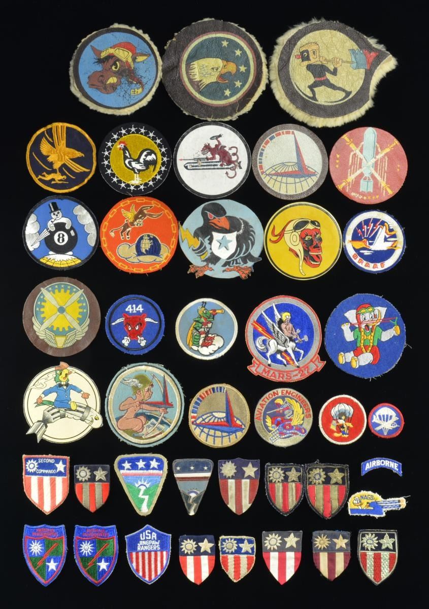 PATCHES WITH A FEW POST WWII ADDITIONS. A total of 41 US patches, including many painted leather squadron examples, along w/ several other embroidered & felt squadron patches. There is a wide variety, some of obvious artistic merit in the own right. 3 Are on fleece backed leather, 7 additional are on plain leather. Also included in this group are 10 various CBI patches of leather, bullion & cloth. 2 Ledo Road patches, 1 Jingpaw Rangers patch, 2 Merrill’s Marauders patches & a "USA KACHIN RANGERS" patch are included. We highly recommend that interested parties examine this fine group of patches. CONDITION: patches show slight to light wear. PROVENANCE: Collection of Brian C. Pinkerton. (02-15448-8/BF). $1,500-2,500.