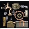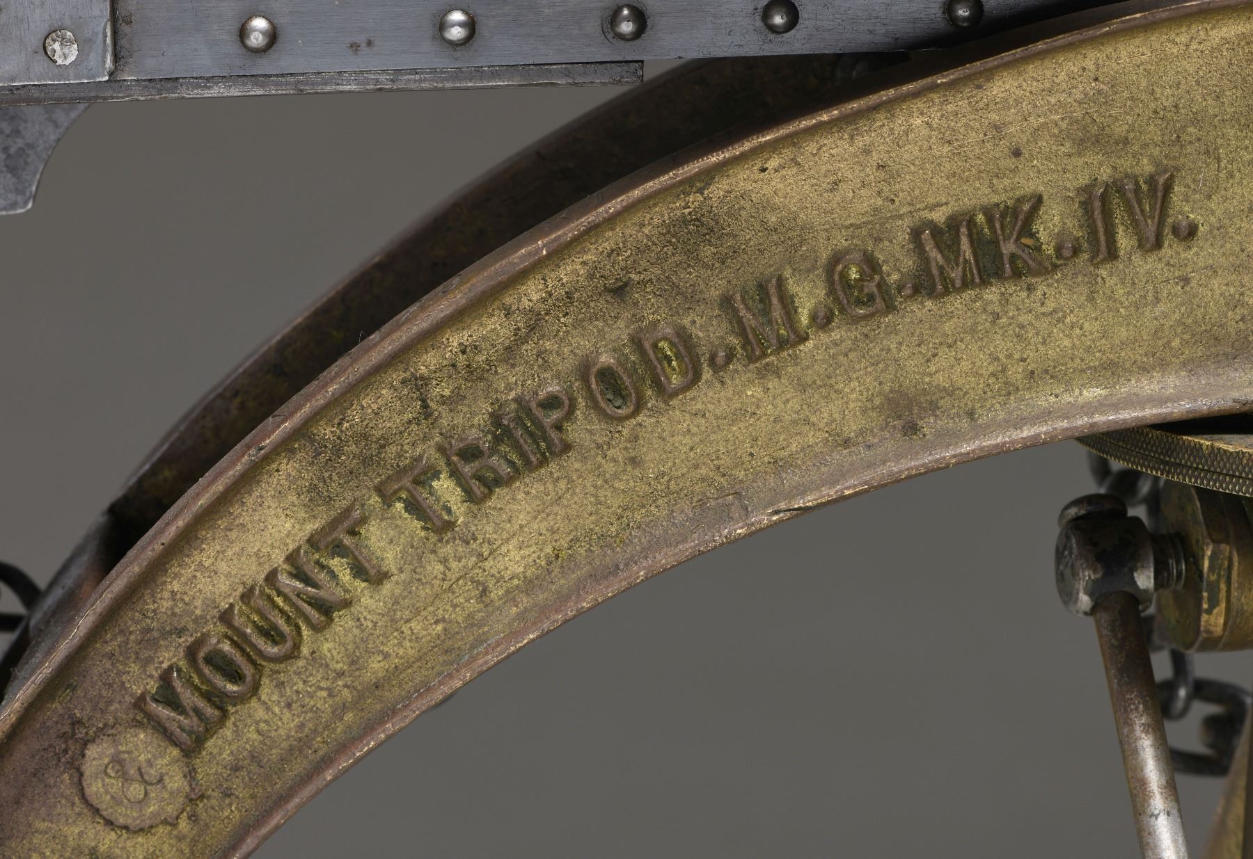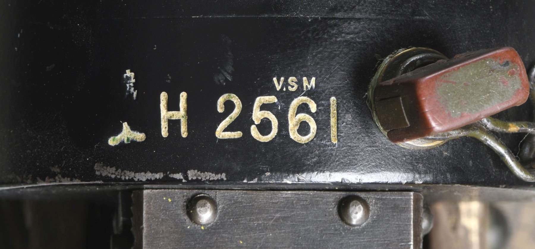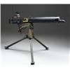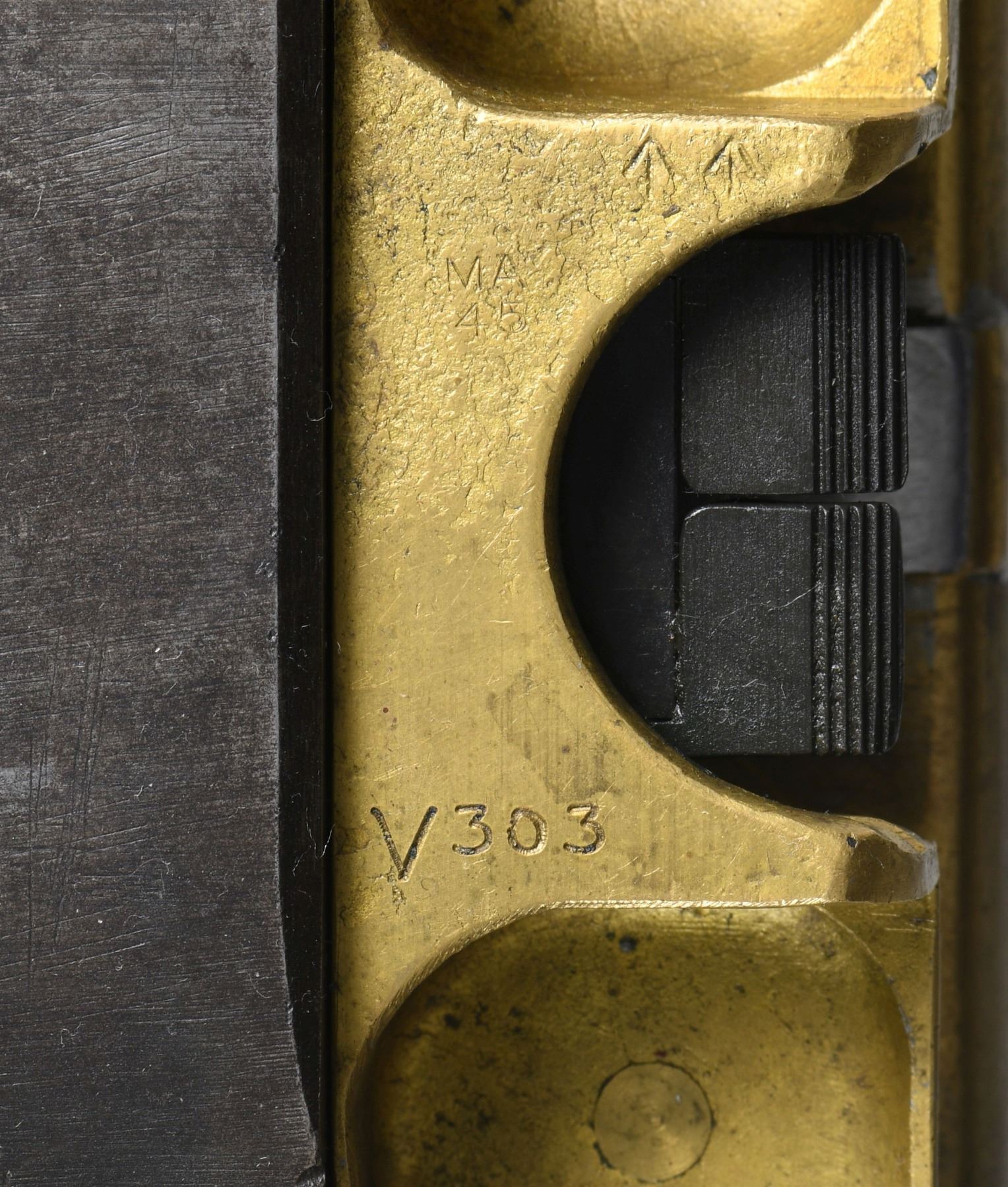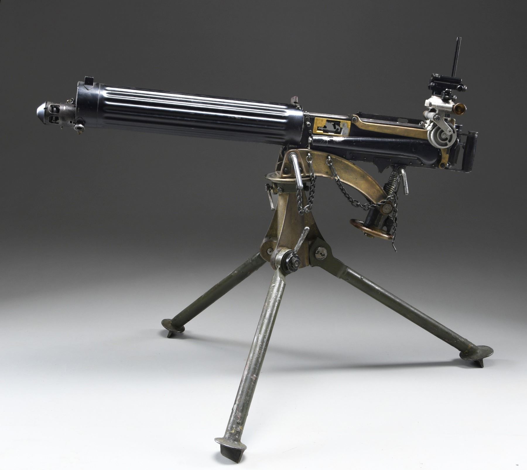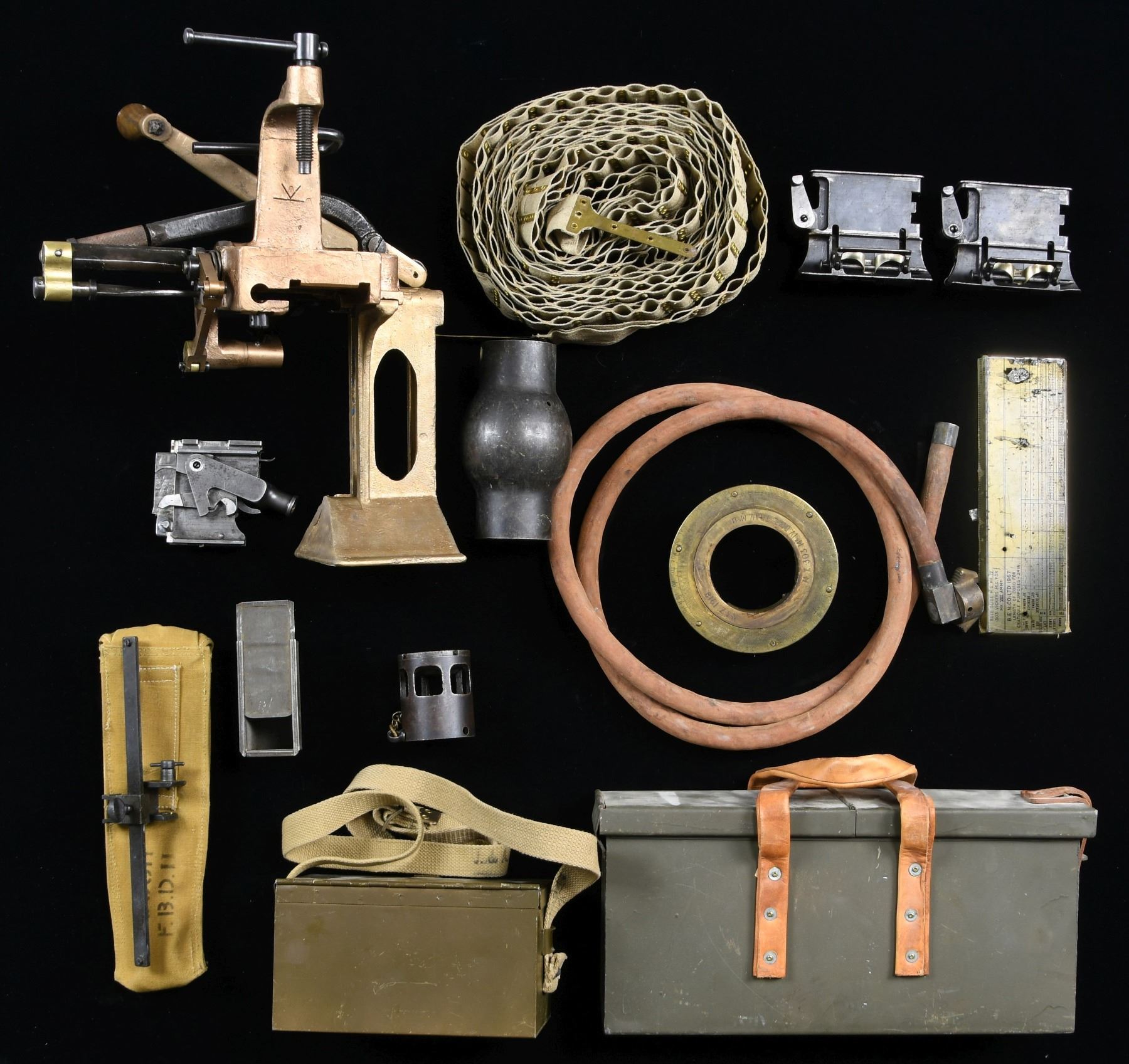 FLUTED BARREL JACKET WITH PLETHORA OF PARTS & ACCESSORIES. Cal. .303. S# H2561. Bbl. 28". The Vickers Machine Gun was originally referred to as the Vickers Maxim. It was adopted by Great Britain in 1912. It remained a principal machine gun through WWI & WWII until being replaced by the "L7A1 GPMG" in the 1960s. Though they were at one time available w/ two different water jackets, a corrugated style & the more traditional smooth side Maxim type, this gun is of the corrugated style. They were available in both ground gun & in aircraft gun variants. This example appears to be a Portuguese contract gun, as it is marked FBT on the right side of the receiver. All exposed steel surfaces are finished in a nice matching dark black, pleasantly accented by the traditional brass parts including the water jacket plugs, the feed block and the left-side scope mount as well as the traditional tripod. The beautiful hardwood spade grips have steel oil caps that include the oil brushes in matching black steel. This example comes w/ a standard brass & steel ground tripod. Tripod has steel legs w/ the rear most measuring 26" in length and the front legs measure 22" in length. All three legs are adj. for height and/or configuration and places the bottom of the receiver to rest at approximately 29" from the ground. The tripod's steel cradle locks into the 360° marked brass portion of the tripod, which is elevated an additional 7" above the legs of the tripod. The elevation mechanism utilizes a steel wheel for micro adjustments while traversing freely. The entire tripod is currently painted green, aside from the brass traverse portion, which retains its natural finish with degree marks and numbers painted black. This Vickers is equipped w/ iron sights which consist of a protective blade front sight forward of the water jacket & an elevation adj. rear peep sight marked in meters from 0 to 2,600 with a flip-up battle sight for close range combat. It is sporting the correct brass scope mount on the left side marked "Bracket, Dial Sight, MK II" on top. Mount sporting MKII Dial sight. Current configuration appears to be 7.62x54R and also includes many parts necessary to convert to 8mm Mauser. BATF Registry indicates manufacturer as "VS&M" w/ the originally listed caliber as .303 British. MAGS: 1 cloth belt with brass tabs and eyelets. UNATTACHED ACCESSORIES: Brass belt filling machine (partially complete), Australian No. 8 Mk. 1 belt box w/ leather straps, MK II Dial Sight in green steel box w/ accessories, 2 spare feed blocks labeled 8mm, 1 spare lock assembly, appears to be .303 British, 1 MKI Flash Eliminator, 1 MKI Foresight Deflection Bar in tan canvas case, 1 Steam Hose, & 1 Slide Rule for .303 MK VIII ammo. CONDITION: Finish on receiver external metal surfaces enjoy nice coverage for such an early example, ranging from full to thin w/ some gentle patina under close inspection. Most significant thinning is in areas of mechanical intervention. Coverage on fluted barrel jacket very complete and consistent with some thinning on high spots as would be expected. Brass feed block and scope mount are very nice w/ natural coloring. Hardwood spade grips are surprisingly free of normal dings & impressions with a brown painted finish. Steel oil brush caps are both intact & thread freely in & out of grips. Tripod legs move freely and steel portions retain some of an earlier green painted finish. Brass parts retain their natural finish & staining. Brass plate on riser still retains clear markings and cradle rotates smoothly. Fire control mechanism appears to function correctly when cycled by hand. Bore is bright w/ strong rifling. PROVENANCE: From the Lifelong Collection of Brian Linde. NATIONAL FIREARMS ACT MG REQUIRING BATF TRANSFER BEFORE TAKING POSSESSION. FULLY TRANSFERABLE. (03-1831/JZ). CURIO. CLASS III. $12,000-20,000.
