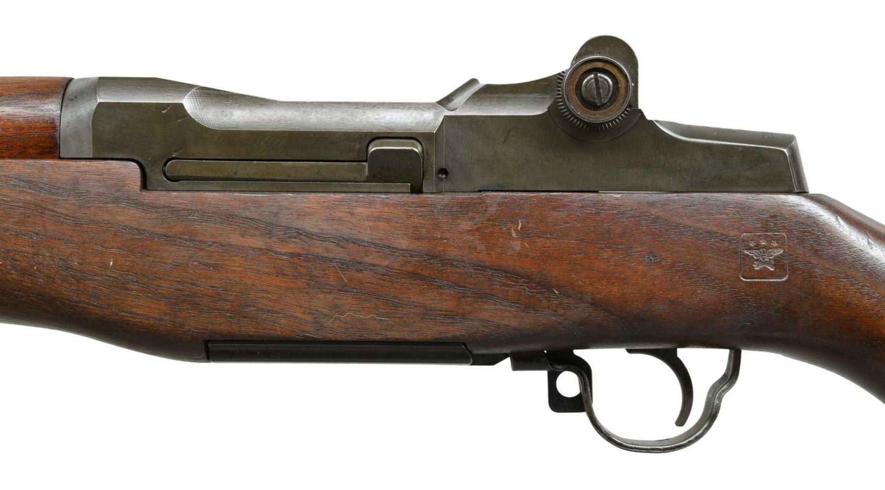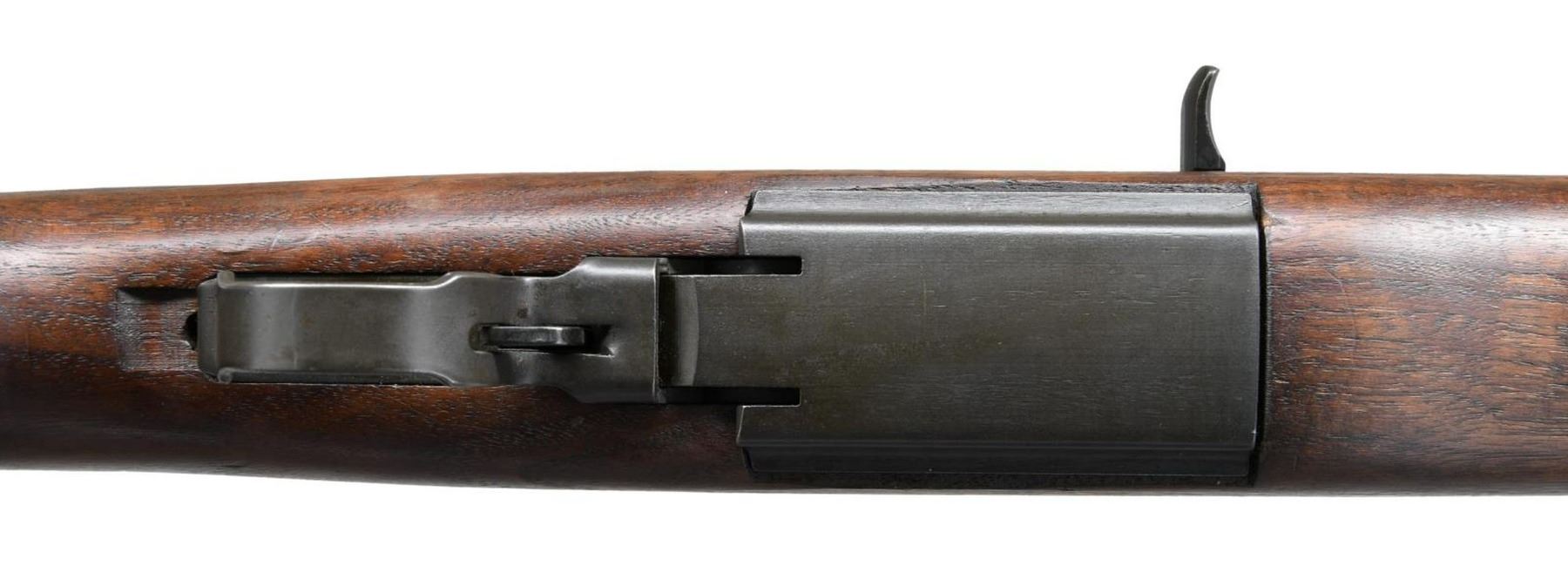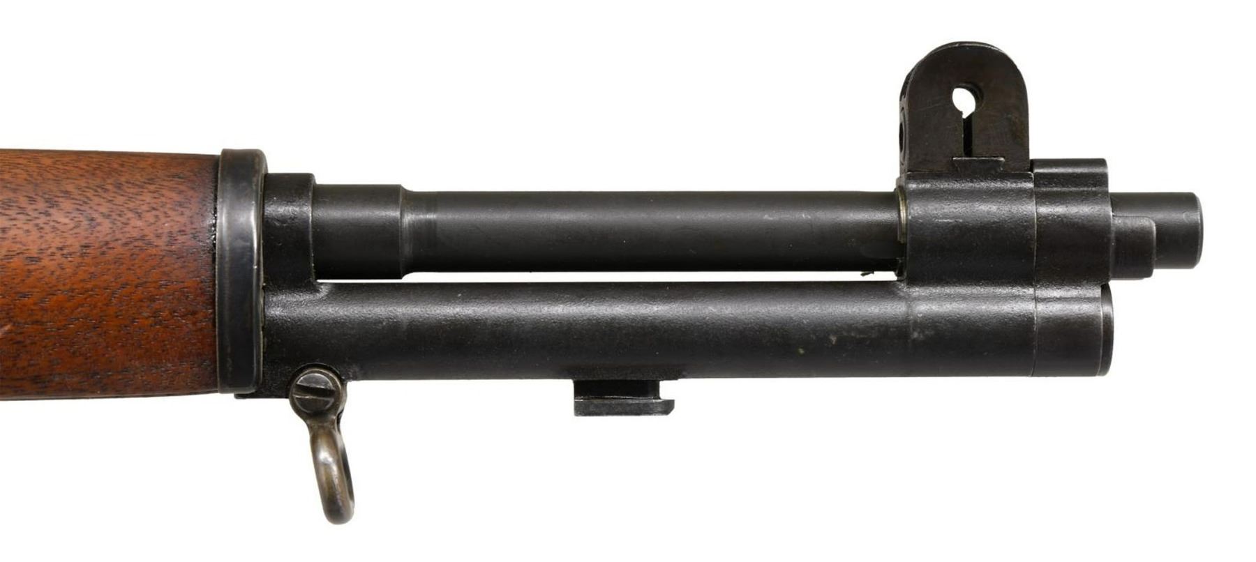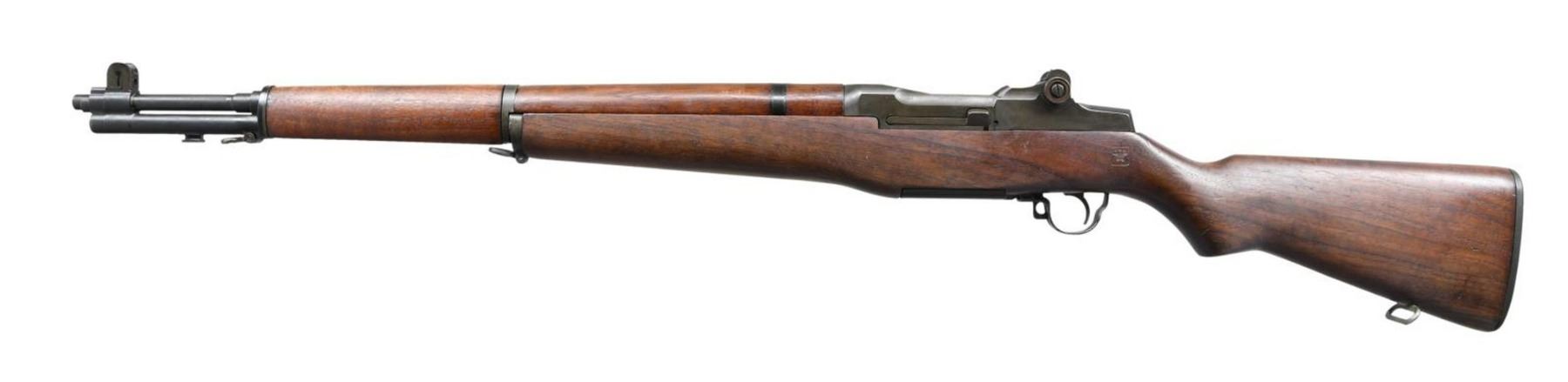 EXPERIMENTAL 22-06 SEMI-AUTO M1 GARAND RIFLE. Cal. 22-06 Single. S# 5342851. Bbl. 24". This unique and high condition rifle was converted at Springfield Armory to test the concept of a high velocity small caliber cartridge as being more lethal than the standard issue 30 caliber cartridges. The rifles were converted from standard service model by fitting them with a newly manufactured barrel. These barrels were marked "SINGLE, DUPLEX AND TRIPLEX" according to the load they were designed for. The single bullet load was supposed to propel a 50 grain bullet at 3500 fps. This rifle for the single bullet load appears to have been unissued at the time it was rebarreled. According to "The M1 Garand Rifle" by Bruce Canfield the serial numbers should be in the 6,000,000 range however this example S342851 manufactured in 1954 is 657149 units previous. The .22 caliber barrel is marked on the right side "SA F38536 8142 4344 9 58 T B " "CAL 22-06 SINGLE 1-12 " & DOD proof. Bolt is marked "6528287-SA A13". Late type aperture rear sight. Blade front sight with protective ears. All visible parts markings are SA . "High hump" gas cylinder lock. Cross slot gas cylinder lock screw. Stamped trigger guard. Walnut stock set. Buttstock is marked over trigger guard with crisp boxed "Defense acceptance eagle". Marked at end of pistol grip with small "crossed cannons". Trap buttplate. UNATTACHED ACCESSORIES: reprinted internet information relating to the development of this rifle and cartridge. White plastic rear sight protector. CONDITION: original finish stock set has a very little wear and scattered small handling marks. Rear handguard appears to be glued to lower band. Metal retains a very large percentage of original finish, with light high point wear. Good shiny bore with lightly worn lands. PROVANANCE STATEMENT: From the Estate Collection of Thomas J. Mulligan. (23-4913/RW). CURIO. $10,000-15,000.