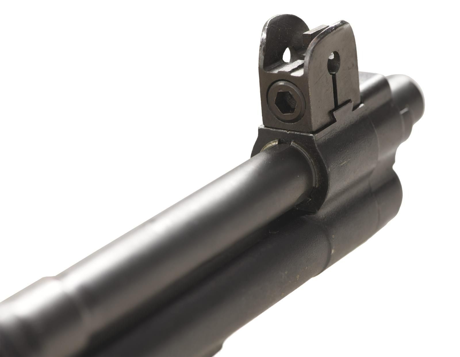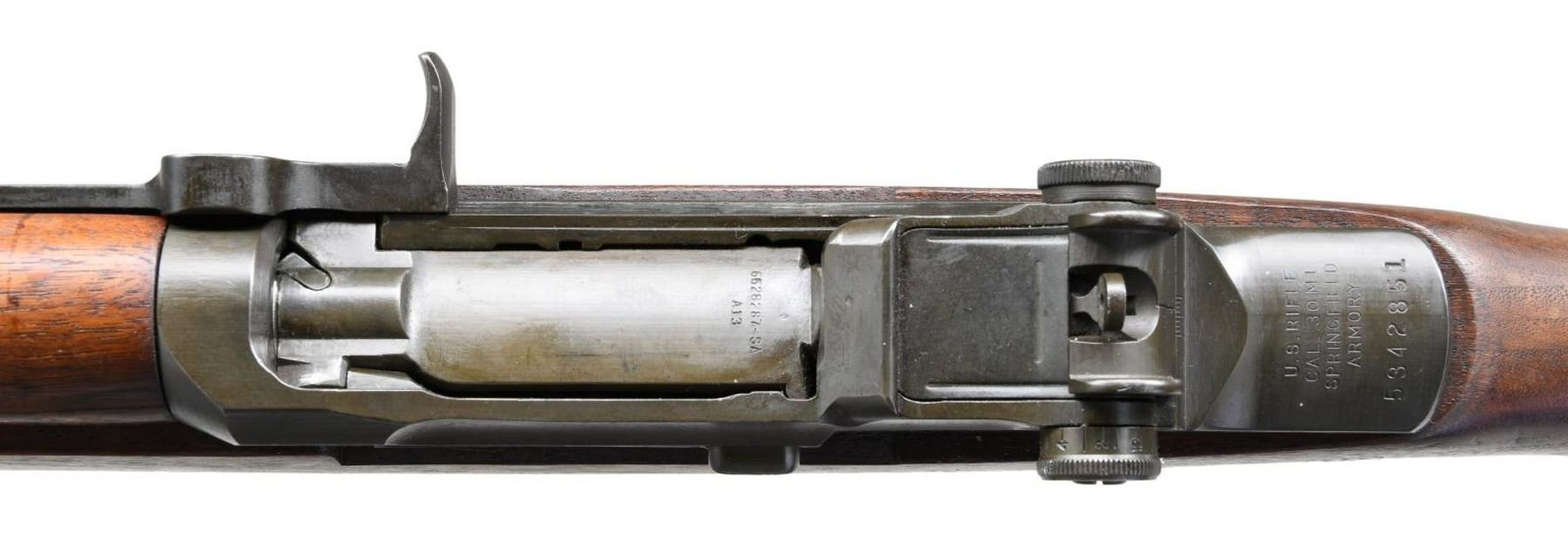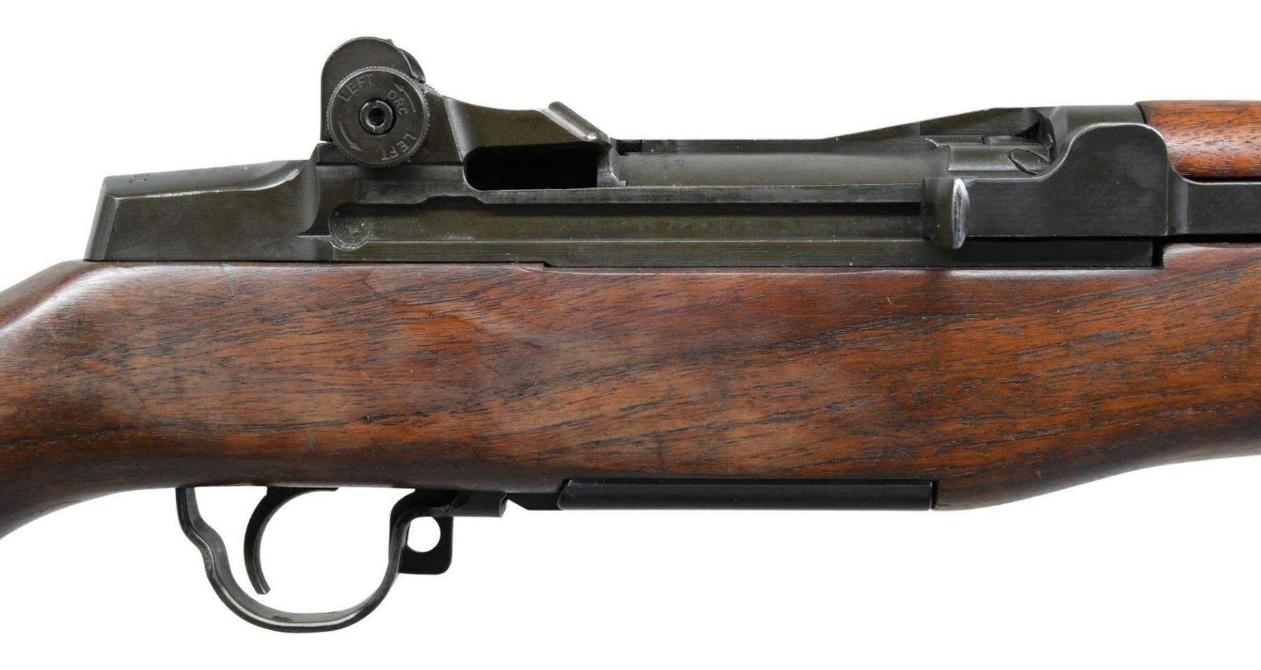 EXPERIMENTAL 22-06 SEMI-AUTO M1 GARAND RIFLE. Cal. 22-06 Single. S# 5342851. Bbl. 24". This unique and high condition rifle was converted at Springfield Armory to test the concept of a high velocity small caliber cartridge as being more lethal than the standard issue 30 caliber cartridges. The rifles were converted from standard service model by fitting them with a newly manufactured barrel. These barrels were marked "SINGLE, DUPLEX AND TRIPLEX" according to the load they were designed for. The single bullet load was supposed to propel a 50 grain bullet at 3500 fps. This rifle for the single bullet load appears to have been unissued at the time it was rebarreled. According to "The M1 Garand Rifle" by Bruce Canfield the serial numbers should be in the 6,000,000 range however this example S342851 manufactured in 1954 is 657149 units previous. The .22 caliber barrel is marked on the right side "SA F38536 8142 4344 9 58 T B " "CAL 22-06 SINGLE 1-12 " & DOD proof. Bolt is marked "6528287-SA A13". Late type aperture rear sight. Blade front sight with protective ears. All visible parts markings are SA . "High hump" gas cylinder lock. Cross slot gas cylinder lock screw. Stamped trigger guard. Walnut stock set. Buttstock is marked over trigger guard with crisp boxed "Defense acceptance eagle". Marked at end of pistol grip with small "crossed cannons". Trap buttplate. UNATTACHED ACCESSORIES: reprinted internet information relating to the development of this rifle and cartridge. White plastic rear sight protector. CONDITION: original finish stock set has a very little wear and scattered small handling marks. Rear handguard appears to be glued to lower band. Metal retains a very large percentage of original finish, with light high point wear. Good shiny bore with lightly worn lands. PROVANANCE STATEMENT: From the Estate Collection of Thomas J. Mulligan. (23-4913/RW). CURIO. $10,000-15,000.