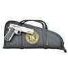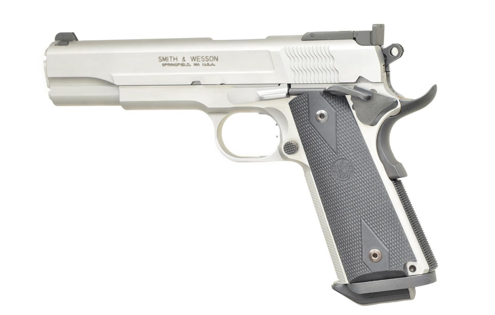 PERFORMANCE CENTER 1911-2 PISTOL. Cal. 38 Super S#DKC0144. 5" Performance Center Bbl. Manufactured 2005. First introduced at the 2004 SHOT Show, this is S&W's special Performance Center variation of the legendary Model 1911 pistol, originally designed by John M. Browning. Single action with a scalloped rear serrated slide hosting a black dovetailed front sight and micro-click adjustable black rear sight. Polished stainless steel frame w/ right side Performance Center logo and 2-tone polished and matte finish stainless steel slide bearing Doug Koenig logo on rear left side. Serrated Doug Koenig Speed hammer. Competition trigger with over-travel stop. Extended beavertail grip safety and enlarged ambidextrous thumb safety. Aggressively checkered mainspring housing and fine checkered front strap. Bevelled competition mag well. Oversized external extractor and full length guide rod. Black rubber double diamond grips bearing S&W logo in center. Glass smooth action. MAGS: 8rd w/extended floorplate. UNATTACHED ACCESSORIES: Factory Allen black carry pouch embroidered w/gold Performance Center logo, factory shipping box, fired casing and paperwork. CONDITION: All outward aspects indicate little or no use beyond factory test firing. No visible imperfections in any regard. Bright bore w/strong rifling. Fire control mechanism appears to function correctly when cycled by hand. PROVENANCE: Estate collection of Fred Inganamort. (22-1727/JZ). MODERN. $1,200-1,800.