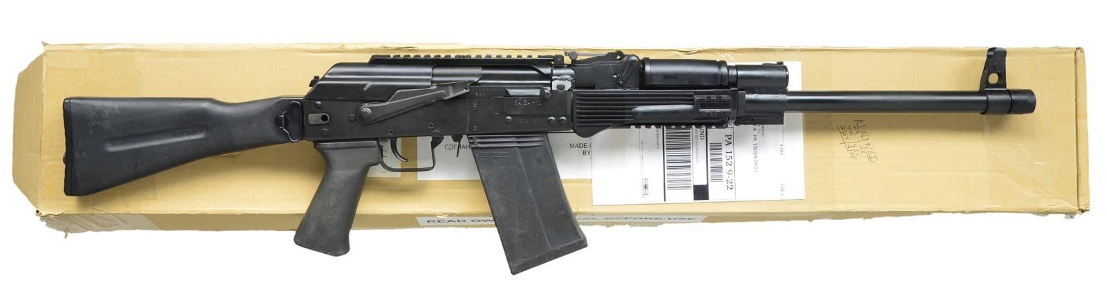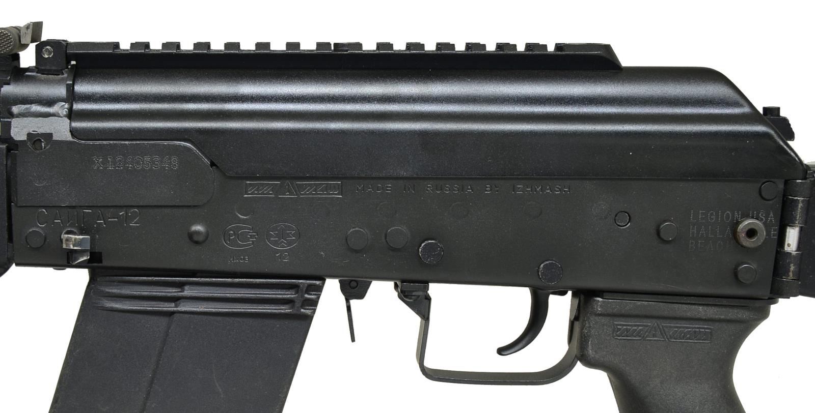 Cal. 12 Ga. S# X12405348. Bbl. 19". Since the last round of import restrictions, very few firearms have been as highly sought after as the Saiga-12 shotgun. This example correctly finished in dark black has a threaded muzzle w/ thread protector, a protected post front sight, tangent rear sight marked to 1000m & hinged top cover w/ 7" picatinny rail section for optic mounting. Black plastic furniture provides additional rail surface for accessory mounting at 3 & 6 o’clock on forend. Black plastic pistol grip w/ black plastic Bulgarian style left side folding stock. Right side controls. MAGS: 1-5 rd. UNATTACHED ACCESSORIES: factory box & owner’s manual. CONDITION: the intersection of the receiver & safety selector is barely marked. Since this area wears through the finish almost immediately, it is not unreasonable to assume this firearm has seen extremely low use if any at all. Mirror shined bore. Stock locks tightly in open & closed positions. Fire control mechanism appears to function correctly when cycled by hand. (21-743/JZ). MODERN. $600-1,000.