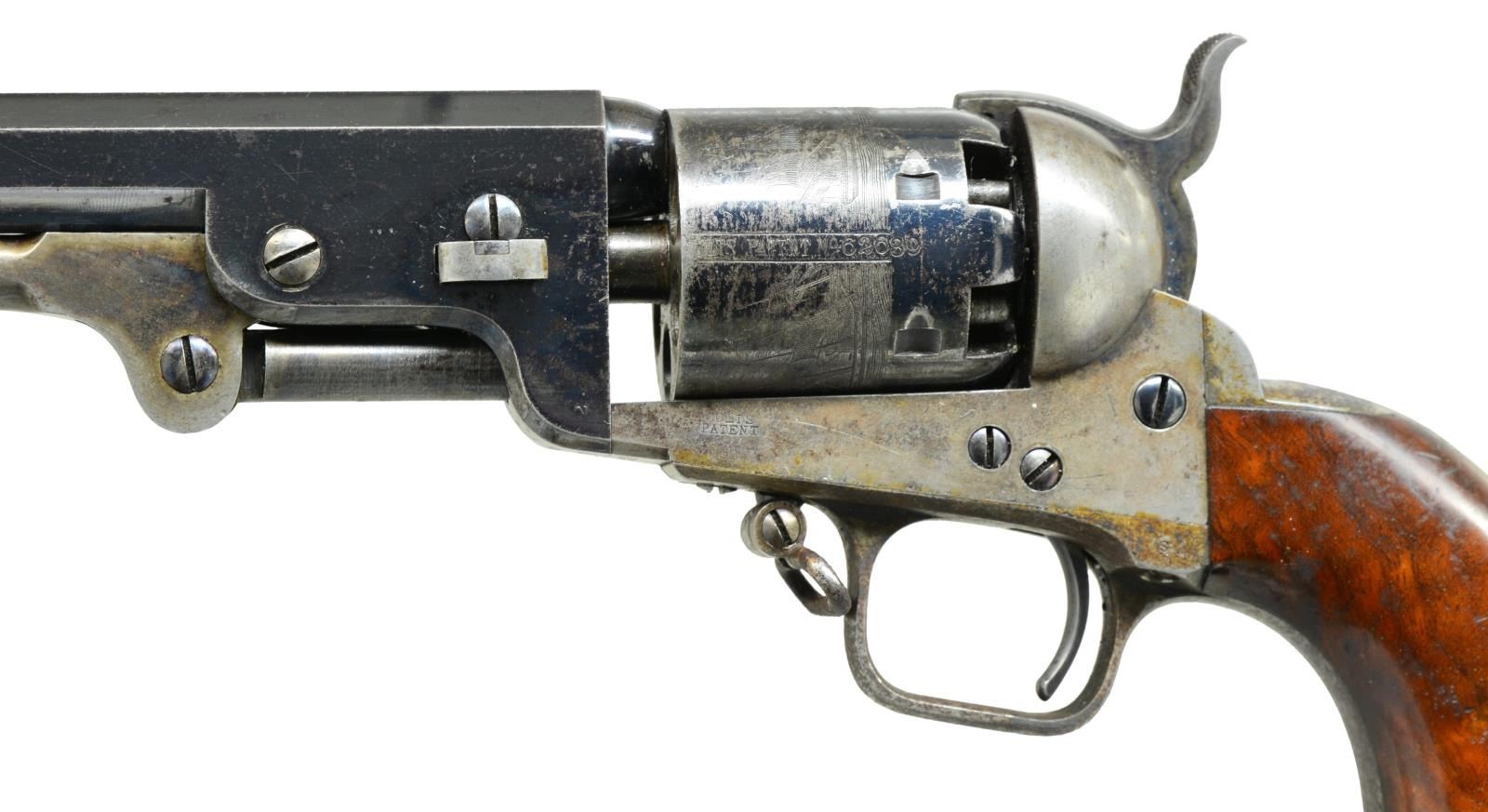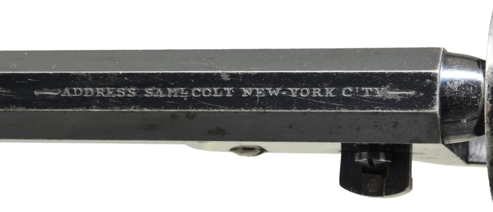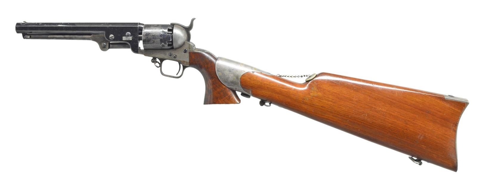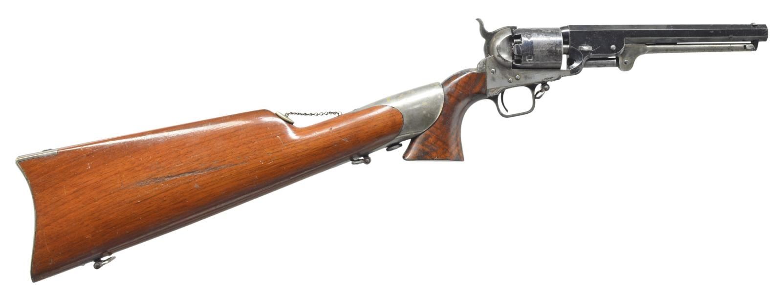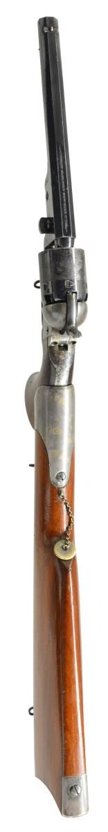 EXTREMELY RARE MATCHING 1ST MODEL CANTEEN STOCK. Cal. 36. S# 62638. There are only 5 or 6 examples known of Colt factory 1st model cut for stock navies, all made 1855-1856. This coordinates w/ 1st model shoulder stocks for Dragoon revolvers also made 1855-1856. The design for the stock closely follows that of the US Model 1855 pistol carbine w/ 2 prongs extending from the stock yoke to engage 2 slots in pistol’s backstrap & then secured by tightening knurled knob on bottom of yoke. The most common version, which was standard after 1857, required 4 screw frame, slotted butt strap & yoke extension on stock to fit into slot. This earliest 1st model design w/ out yoke & 3 screw frame is more complex to manufacture requiring steel grip frame. Like the other 2 known 1st models, trigger guard is fitted w/ sling swivel as is stock. The special order revolver has Colt factory German silver front sight fitted in dovetailed slot & deluxe burled walnut grips. Revolver has matching serial number 62638 on every part normally numbered w/ exception of loading arm 2639 & cylinder numbered 62689. Unique canteen stock has silver plated yoke w/ matching serial number 62638, silver plated brass buttplate has serial number, probable factory error 62628. Two small sling swivels are fitted in stock, one on yoke & one on oval escutcheon. This is the only example of the 1st model Colt Navy shoulder stock w/ pistol we are aware ever offered in auction. UNATTACHED ACCESSORIES: 6 page R. L. Wilson letter detailing rarity & its discovery in Scandinavia about 1995. CONDITION: extremely fine overall. Revolver retains about 95% bright factory blue on bbl., about 40% blue on cyl., muted case colors on frame, hammer & loading lever. There is rust & pitting on two of the sling swivels on pistol & stock where, according to the accompanying letter, stated original leather sling had been attached for decades causing the corrosion. There is also corrosion on slightly flat trigger bow & other areas on grip frame & one streak on cylinder which does not affect overall aesthetic of this great rarity. Burled grips retain most all of their factory varnish w/ light edge wear but varnish worn through in 2 crescents where yoke attached. Mechanically fine w/ crisp bright rifled bore. Stock retains most of its original silver plate on yoke, buttplate, & rear sling swivel escutcheon. Stock retains 95% original factory varnish w/ scattered small dings & dents & 3" long gouge on right side. Canteen screw in plug & attached chain are intact & functional. (01-19959/JS). ANTIQUE. $20,000-25,000.