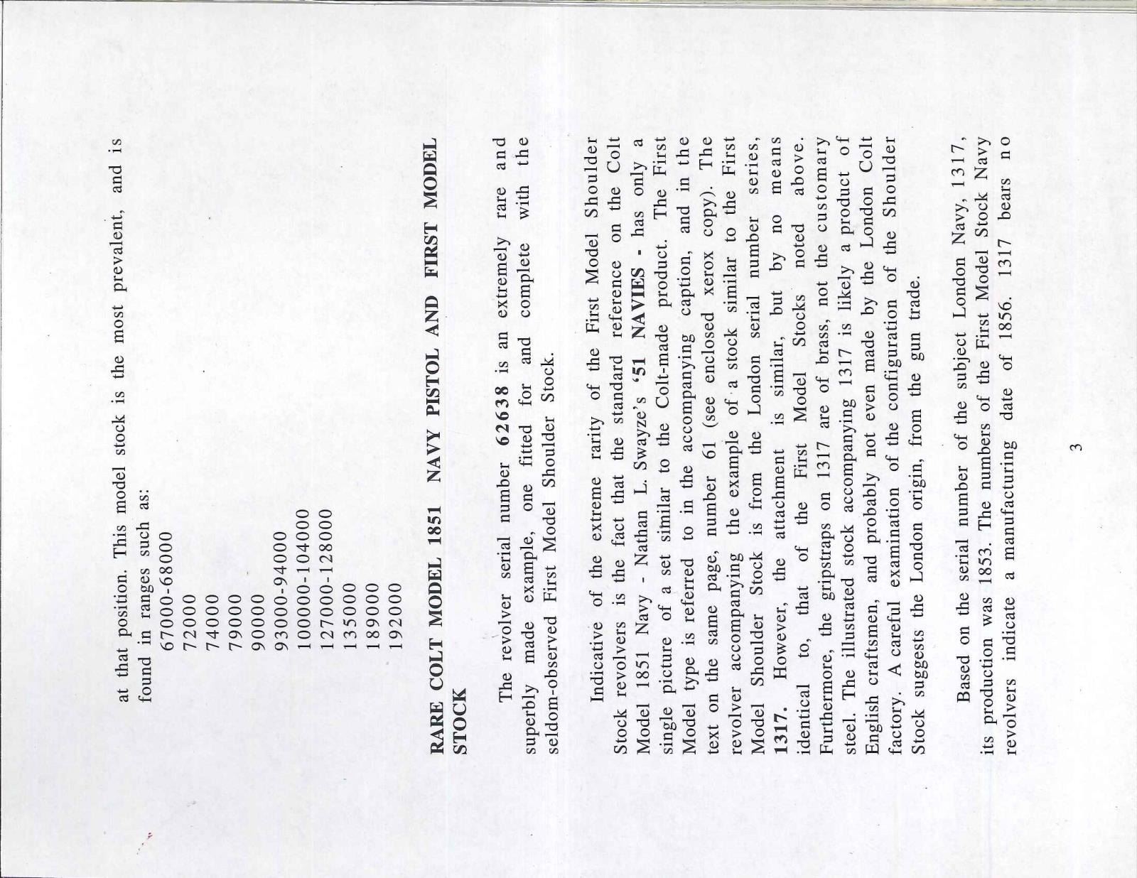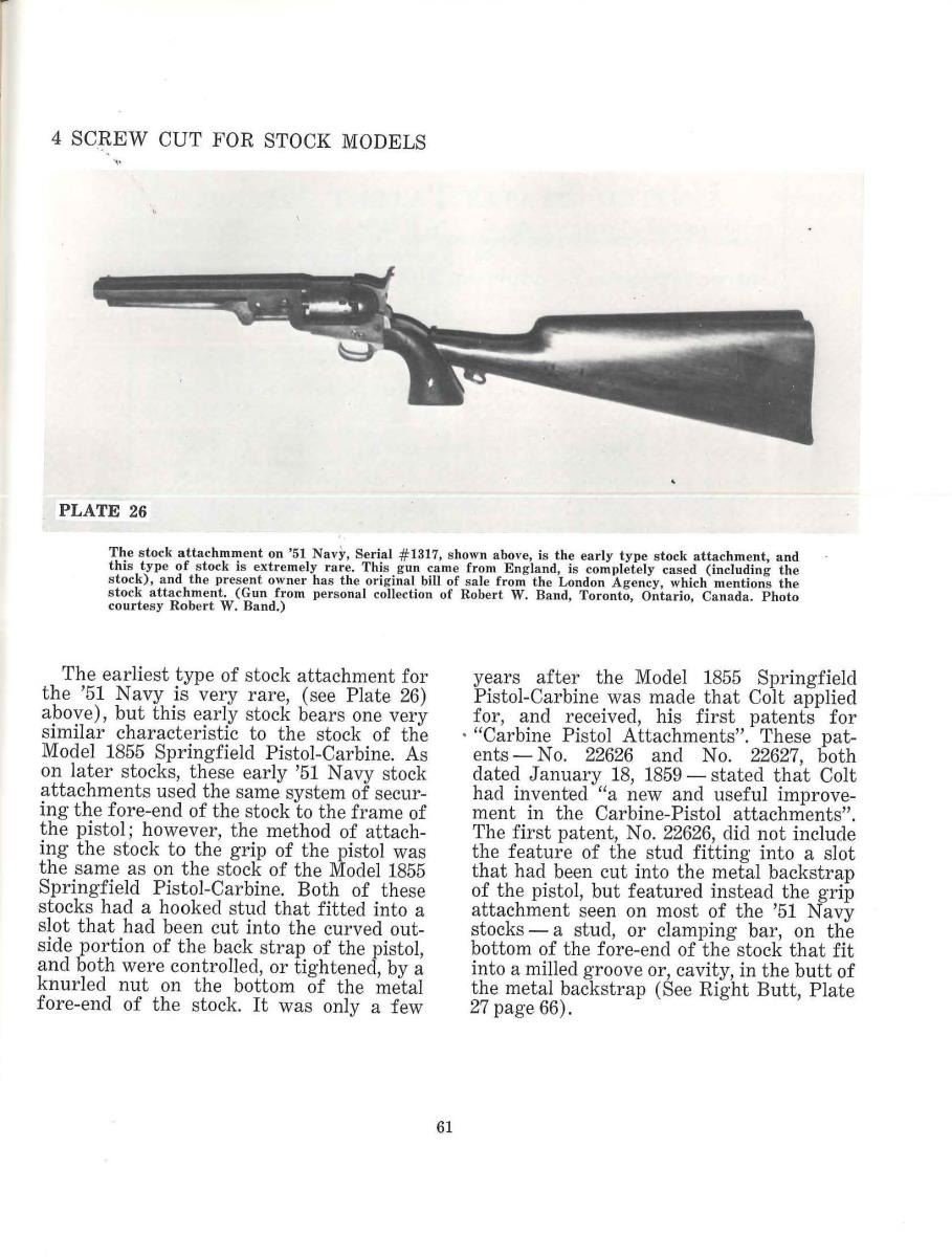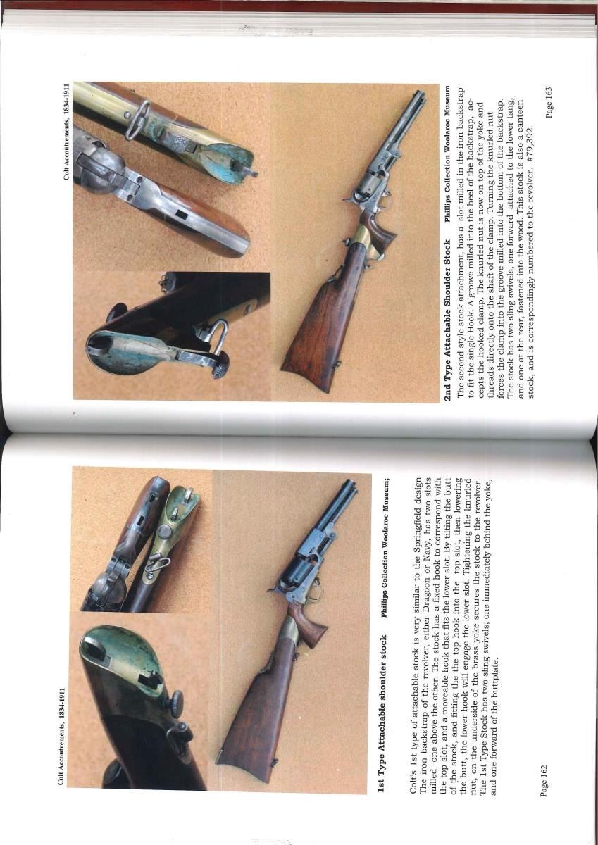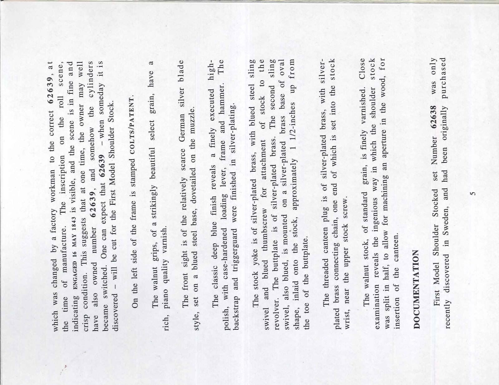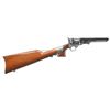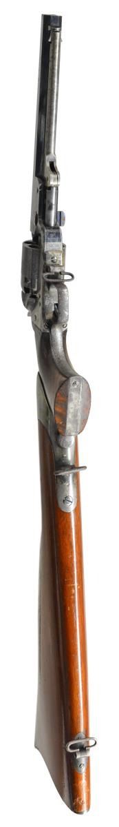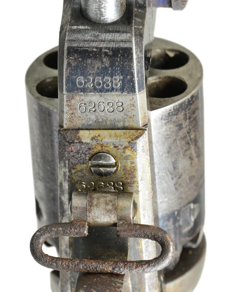 EXTREMELY RARE MATCHING 1ST MODEL CANTEEN STOCK. Cal. 36. S# 62638. There are only 5 or 6 examples known of Colt factory 1st model cut for stock navies, all made 1855-1856. This coordinates w/ 1st model shoulder stocks for Dragoon revolvers also made 1855-1856. The design for the stock closely follows that of the US Model 1855 pistol carbine w/ 2 prongs extending from the stock yoke to engage 2 slots in pistol’s backstrap & then secured by tightening knurled knob on bottom of yoke. The most common version, which was standard after 1857, required 4 screw frame, slotted butt strap & yoke extension on stock to fit into slot. This earliest 1st model design w/ out yoke & 3 screw frame is more complex to manufacture requiring steel grip frame. Like the other 2 known 1st models, trigger guard is fitted w/ sling swivel as is stock. The special order revolver has Colt factory German silver front sight fitted in dovetailed slot & deluxe burled walnut grips. Revolver has matching serial number 62638 on every part normally numbered w/ exception of loading arm 2639 & cylinder numbered 62689. Unique canteen stock has silver plated yoke w/ matching serial number 62638, silver plated brass buttplate has serial number, probable factory error 62628. Two small sling swivels are fitted in stock, one on yoke & one on oval escutcheon. This is the only example of the 1st model Colt Navy shoulder stock w/ pistol we are aware ever offered in auction. UNATTACHED ACCESSORIES: 6 page R. L. Wilson letter detailing rarity & its discovery in Scandinavia about 1995. CONDITION: extremely fine overall. Revolver retains about 95% bright factory blue on bbl., about 40% blue on cyl., muted case colors on frame, hammer & loading lever. There is rust & pitting on two of the sling swivels on pistol & stock where, according to the accompanying letter, stated original leather sling had been attached for decades causing the corrosion. There is also corrosion on slightly flat trigger bow & other areas on grip frame & one streak on cylinder which does not affect overall aesthetic of this great rarity. Burled grips retain most all of their factory varnish w/ light edge wear but varnish worn through in 2 crescents where yoke attached. Mechanically fine w/ crisp bright rifled bore. Stock retains most of its original silver plate on yoke, buttplate, & rear sling swivel escutcheon. Stock retains 95% original factory varnish w/ scattered small dings & dents & 3" long gouge on right side. Canteen screw in plug & attached chain are intact & functional. (01-19959/JS). ANTIQUE. $20,000-25,000.