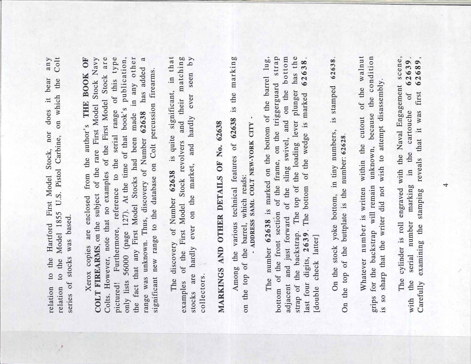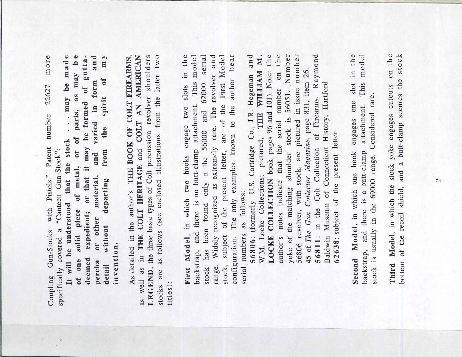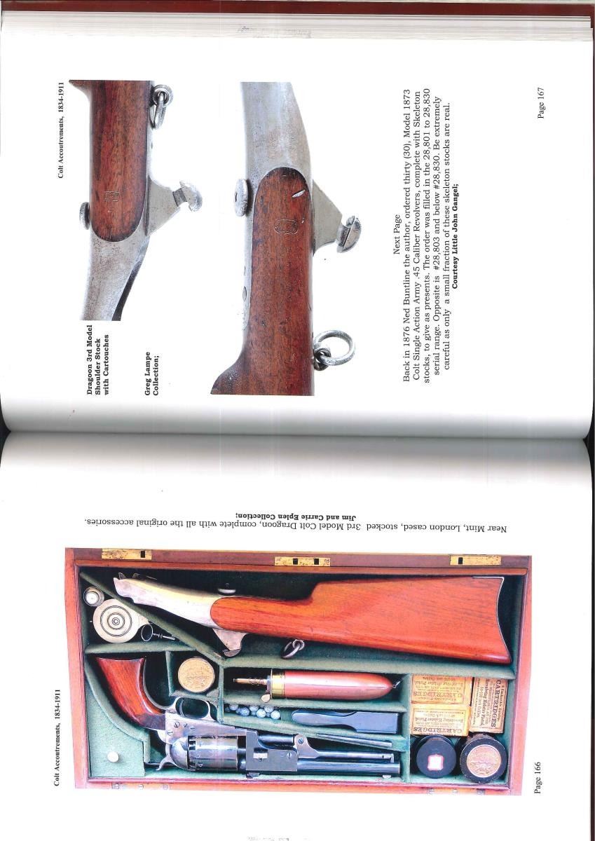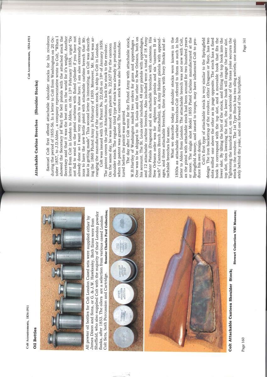 EXTREMELY RARE MATCHING 1ST MODEL CANTEEN STOCK. Cal. 36. S# 62638. There are only 5 or 6 examples known of Colt factory 1st model cut for stock navies, all made 1855-1856. This coordinates w/ 1st model shoulder stocks for Dragoon revolvers also made 1855-1856. The design for the stock closely follows that of the US Model 1855 pistol carbine w/ 2 prongs extending from the stock yoke to engage 2 slots in pistol’s backstrap & then secured by tightening knurled knob on bottom of yoke. The most common version, which was standard after 1857, required 4 screw frame, slotted butt strap & yoke extension on stock to fit into slot. This earliest 1st model design w/ out yoke & 3 screw frame is more complex to manufacture requiring steel grip frame. Like the other 2 known 1st models, trigger guard is fitted w/ sling swivel as is stock. The special order revolver has Colt factory German silver front sight fitted in dovetailed slot & deluxe burled walnut grips. Revolver has matching serial number 62638 on every part normally numbered w/ exception of loading arm 2639 & cylinder numbered 62689. Unique canteen stock has silver plated yoke w/ matching serial number 62638, silver plated brass buttplate has serial number, probable factory error 62628. Two small sling swivels are fitted in stock, one on yoke & one on oval escutcheon. This is the only example of the 1st model Colt Navy shoulder stock w/ pistol we are aware ever offered in auction. UNATTACHED ACCESSORIES: 6 page R. L. Wilson letter detailing rarity & its discovery in Scandinavia about 1995. CONDITION: extremely fine overall. Revolver retains about 95% bright factory blue on bbl., about 40% blue on cyl., muted case colors on frame, hammer & loading lever. There is rust & pitting on two of the sling swivels on pistol & stock where, according to the accompanying letter, stated original leather sling had been attached for decades causing the corrosion. There is also corrosion on slightly flat trigger bow & other areas on grip frame & one streak on cylinder which does not affect overall aesthetic of this great rarity. Burled grips retain most all of their factory varnish w/ light edge wear but varnish worn through in 2 crescents where yoke attached. Mechanically fine w/ crisp bright rifled bore. Stock retains most of its original silver plate on yoke, buttplate, & rear sling swivel escutcheon. Stock retains 95% original factory varnish w/ scattered small dings & dents & 3" long gouge on right side. Canteen screw in plug & attached chain are intact & functional. (01-19959/JS). ANTIQUE. $20,000-25,000.