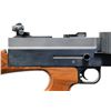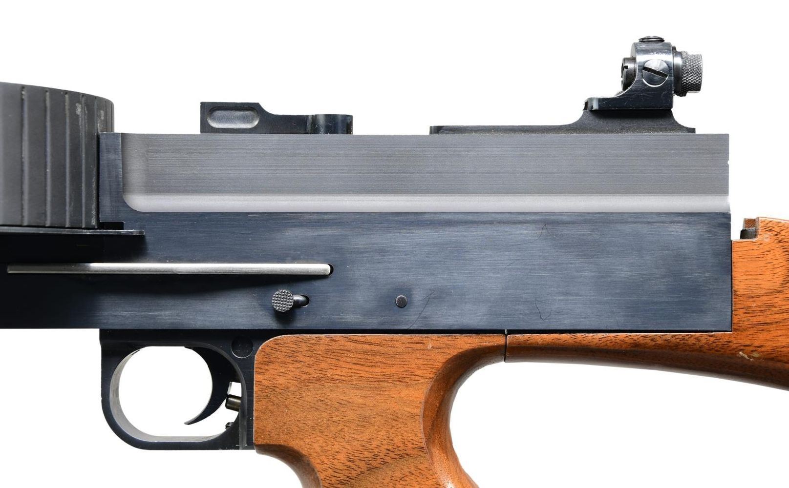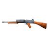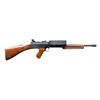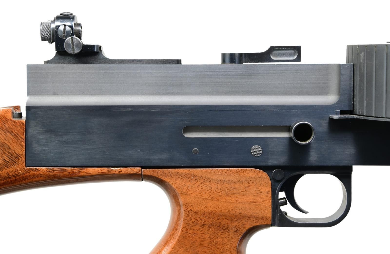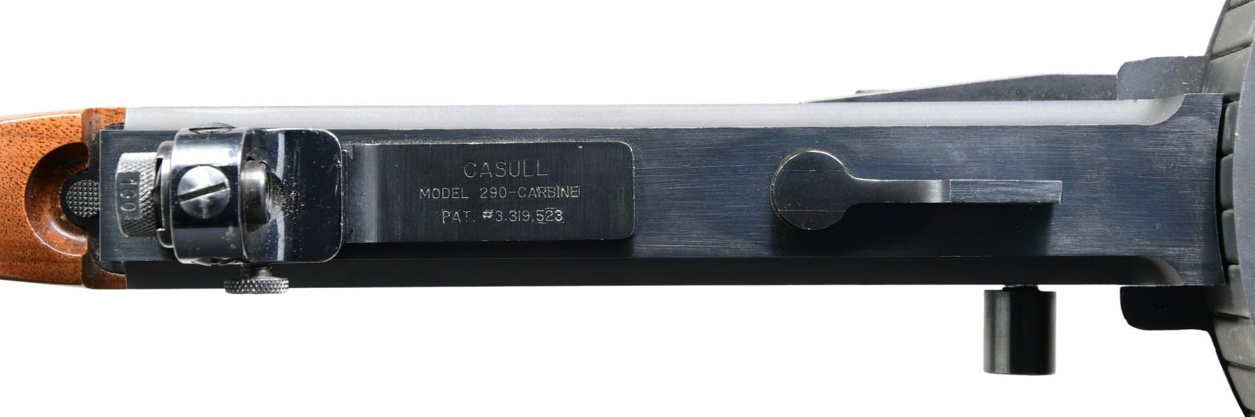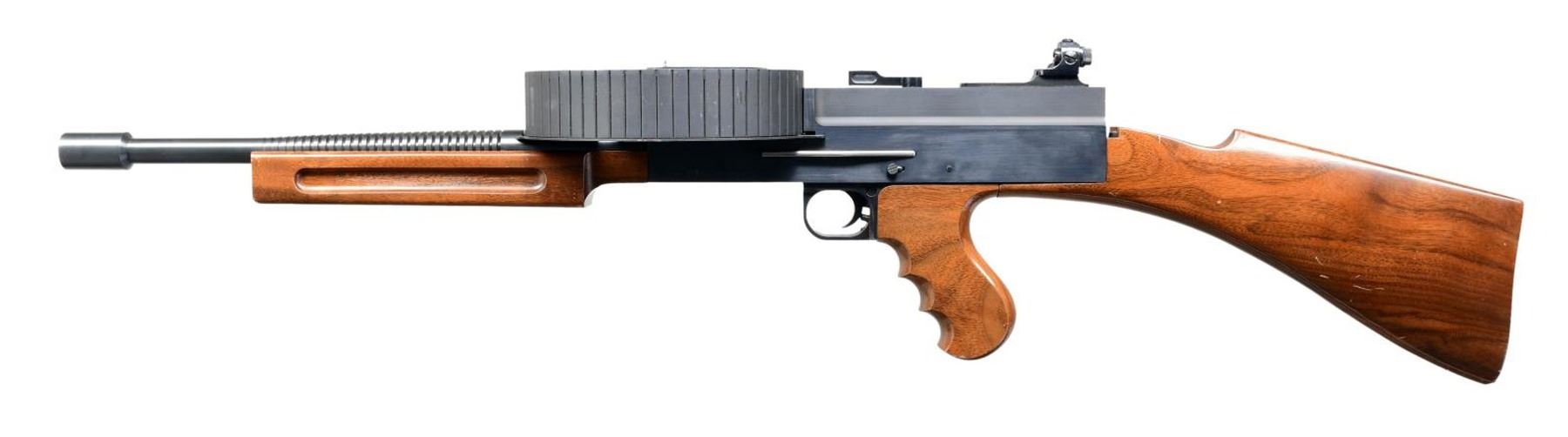 SEMI- AUTOMATIC CARBINE. Cal. 22 LR. S# NSN. A total of 87 manufactured. 1966-1967 by Dick Casull, who designed the famous 454 Casull cartridge & was co-founder of Freedom Arms. All were hand built & very costly when produced. MSRP in the mid 1960's was over $1,000. which was definitely one of the most expensive firearms on the market at the time. Similar in appearance to the feeding style of the Lewis Machine Gun & the predecessor to the much more common American 180 rifle. Fires from open bolt & fed from drum mounted on top of receiver. It employees a unique bolt face w/ raised vertical bar striking cartridge rims on 2 edges at once for more reliable ignition. Finned 16 1/2" bbl. w/ built up portion at front similar in appearance to Cutts compensator, w/out slots. Stock set similar in style to M1 Thompson SMG w/ grooved horizontal forend, finger grooved pistol grip & push button removable buttstock w/out buttplate; all walnut. Rear sight consists of an adjustable peep receiver sight, similar in appearance to those used on Belgium Browning's mounted onto grooved rail at rear. Front sight is simple post at center of drum above its pivot. MAGS: 1 approx. 290 rd. pan drum. UNATTACHED ACCESSORIES: 38" foam lined, plastic transport case. CONDITION: very good overall appearance w/ dark bluing. Coverage complete & consistent w/ very gentle thinning on some high spots under close inspection. Matte finish on drum. Some light handling marks & impressions on stock set; mostly on toe line of buttstock. Near excellent bore. Extremely rare firearm w/ very high capacity. Fire control mechanism appears to function correctly when cycled by hand. (24-1878/JZ). CURIO. $4,000-6,000.