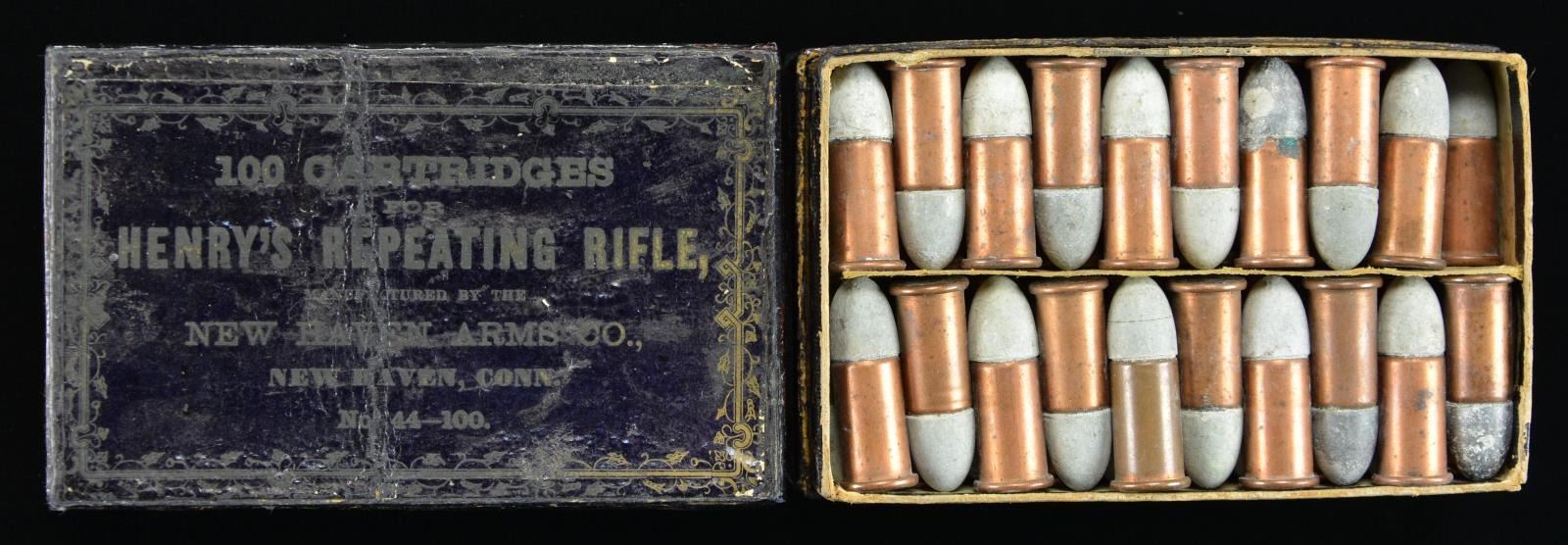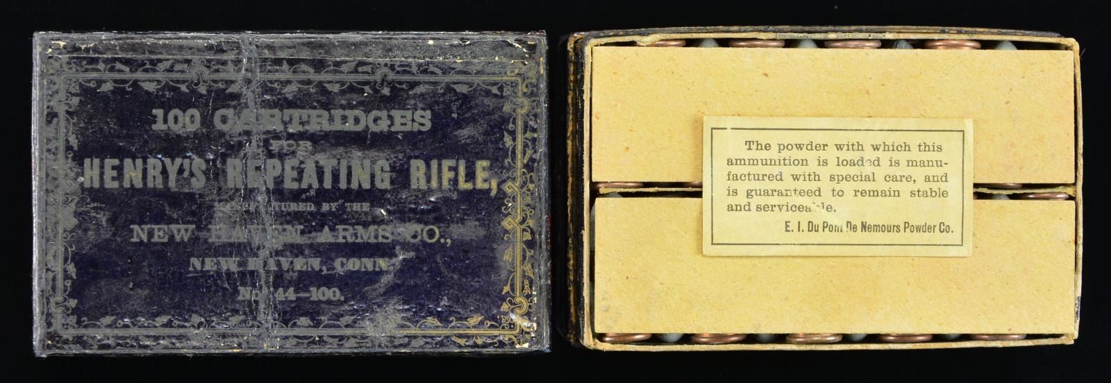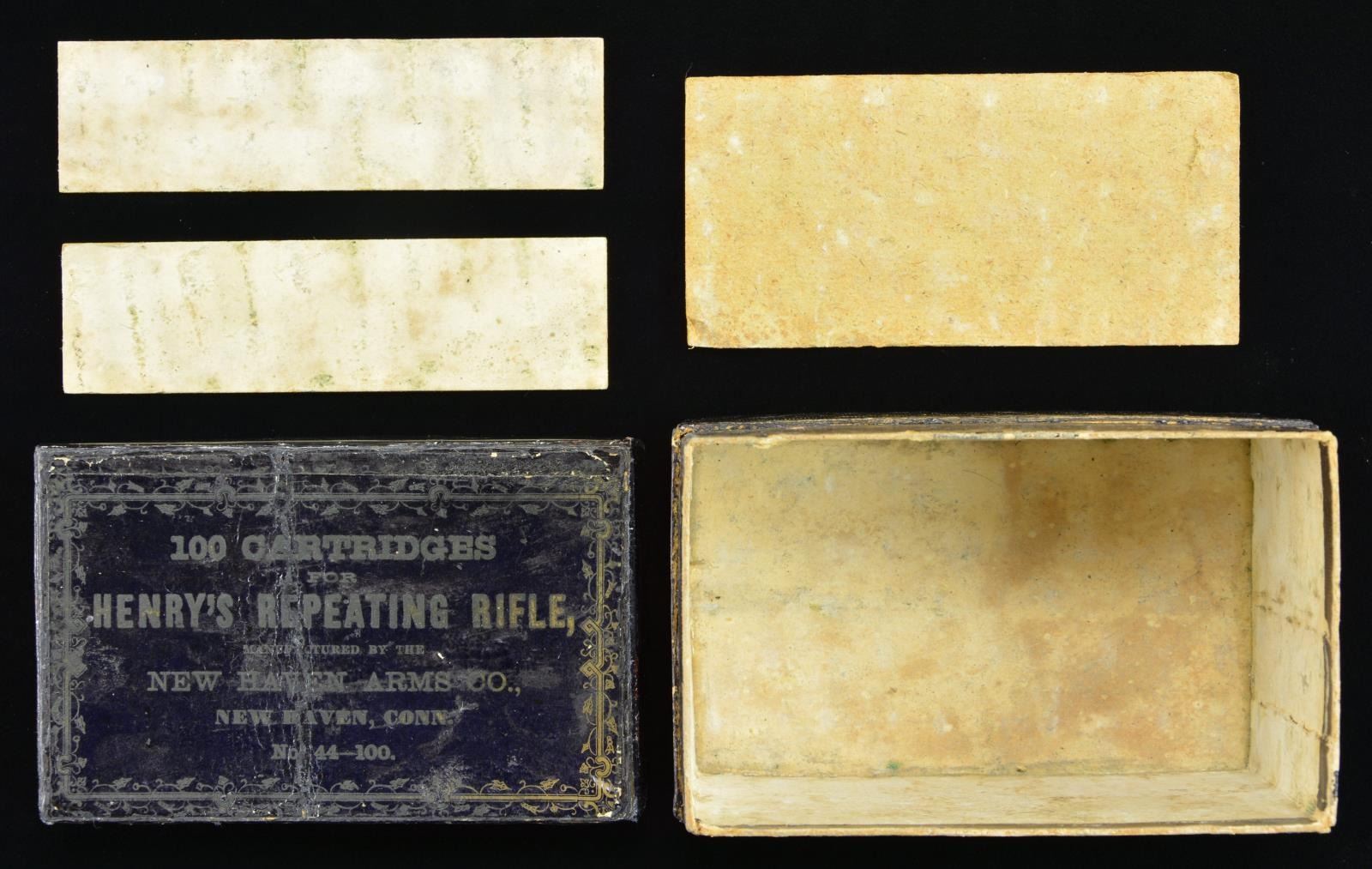 "BLACK BOX" CARTRIDGE PACK. No more than 3 or 4 examples known. The box contains 99 of the earliest "pointed round" tip projectiles with raised "H" head marks. If you want the rarest early Henry box of ammo known, this is it. This box just recently discovered with 1st model rifle, box had split at corners and lid cracked through center, still retains the pasteboard partitions and “Dupont” powder label inside, Dupont label is only example we are aware.