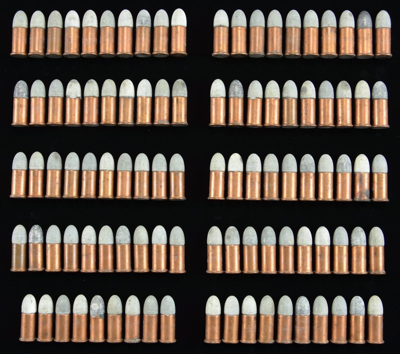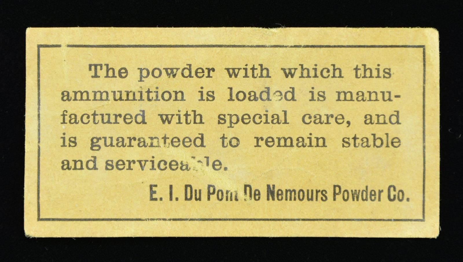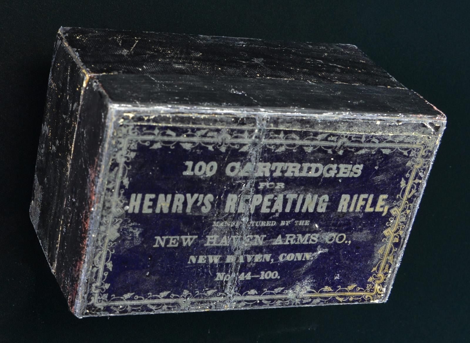 "BLACK BOX" CARTRIDGE PACK. No more than 3 or 4 examples known. The box contains 99 of the earliest "pointed round" tip projectiles with raised "H" head marks. If you want the rarest early Henry box of ammo known, this is it. This box just recently discovered with 1st model rifle, box had split at corners and lid cracked through center, still retains the pasteboard partitions and “Dupont” powder label inside, Dupont label is only example we are aware.