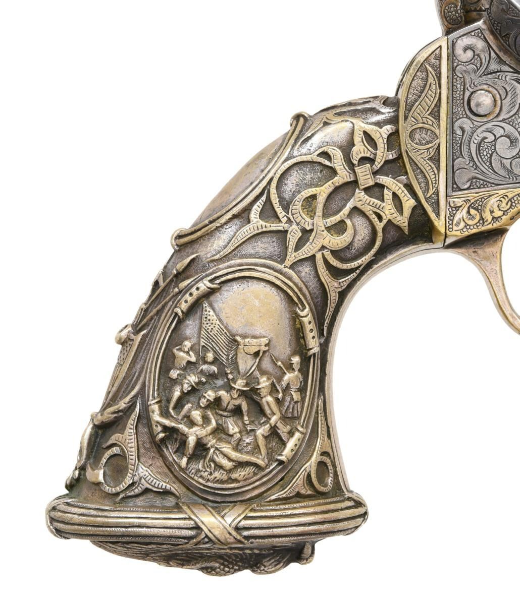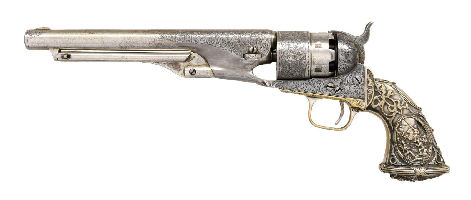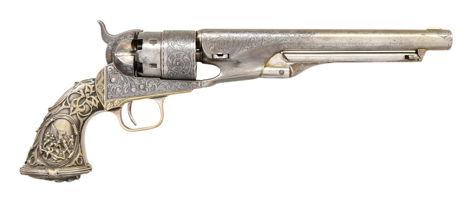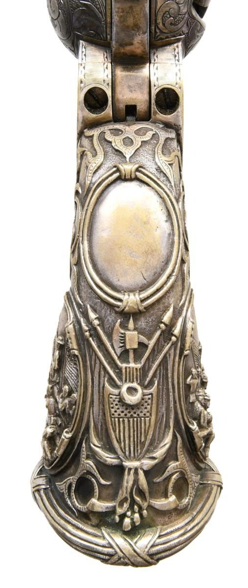 ARMY REVOLVER, "TIFFANY" CIVIL WAR BATTLE SCENE METAL GRIPS. Cal. 44, S# 180417. The rarest of "Tiffany" all metal grips have Civil War battle scene panels. Most of these grips are found on cartridge conversions and no more than a handful survive on percussion revolvers, especially the large frame armies. There are a pair of cased army revolvers given to the president of Peru in 1870 with identical grips, this revolver is also shown in L. D. Nimschke record book. Another engraved pair with identical grips are found in the Smithsonian Institution collection (photos of both accompany this lot). There has been much written about these grips and their manufacture by Larry Wilson in his early texts attributed these to Tiffany manufacture. Later published research by Marlin Polhemus shows these are most likely the product of Wexell and Degress of Mexico City. Wexel & Degress sold these grips to Colt; Schuyler, Hartley & Graham; and others, based on receipts. These beautiful, raised relief metal grips were mounted on custom Nimschke engraved Schuyler Hartley & Graham marketed revolvers who illustrated these grips in their 1864 catalog. Regardless of the manufacturer, whether it was Ames, or Wexell & Degress; the Nimschke shop, SH&G, and Tiffany all utilized these grips on their most special revolvers. There are several different fancy relief grips, these are by far the rarest with Civil War battle scenes. Revolver is in standard configuration, 8" barrel with one line New York address, scroll engraving a very similar form can be found in the accompanying pages from Wilson's engraving books attributed to Nimschke shop. This revolver based on serial number was manufactured in 1869, many of these revolvers stayed in factory and were converted to cartridge. This example has survived in fine original percussion configuration. UNATTACHED ACCESSORIES: copy of pages of similar engraved guns from Larry Wilson's "Colt Engraving Book" & auction receipt. CONDITION: fine overall, retaining much of its original silver wash, crisp markings including engraving. Revolver is original, complete and matching. Mechanically fine, crisp rifled bore. PROVENANCE: James D Julia Auctions March 13, 2006, Lot 177. (01-25217/JS). ANTIQUE. $20,000-25,000.