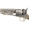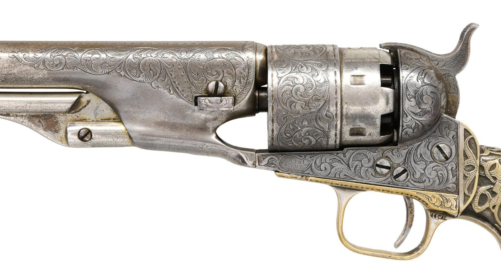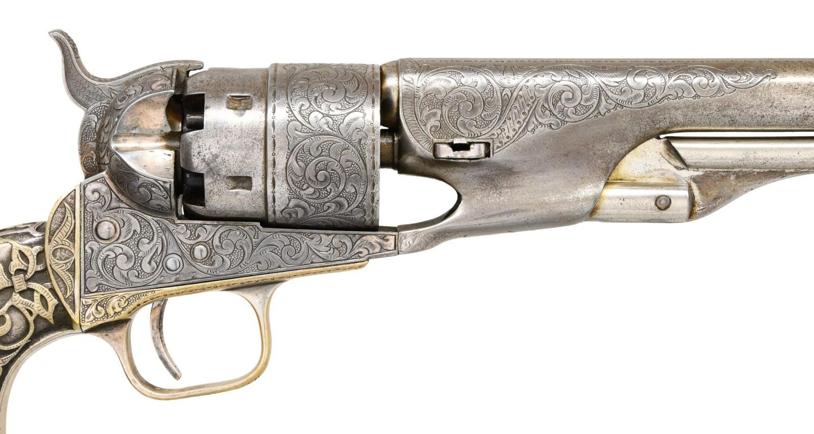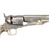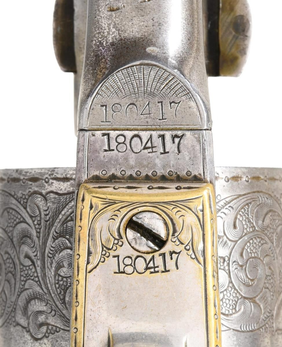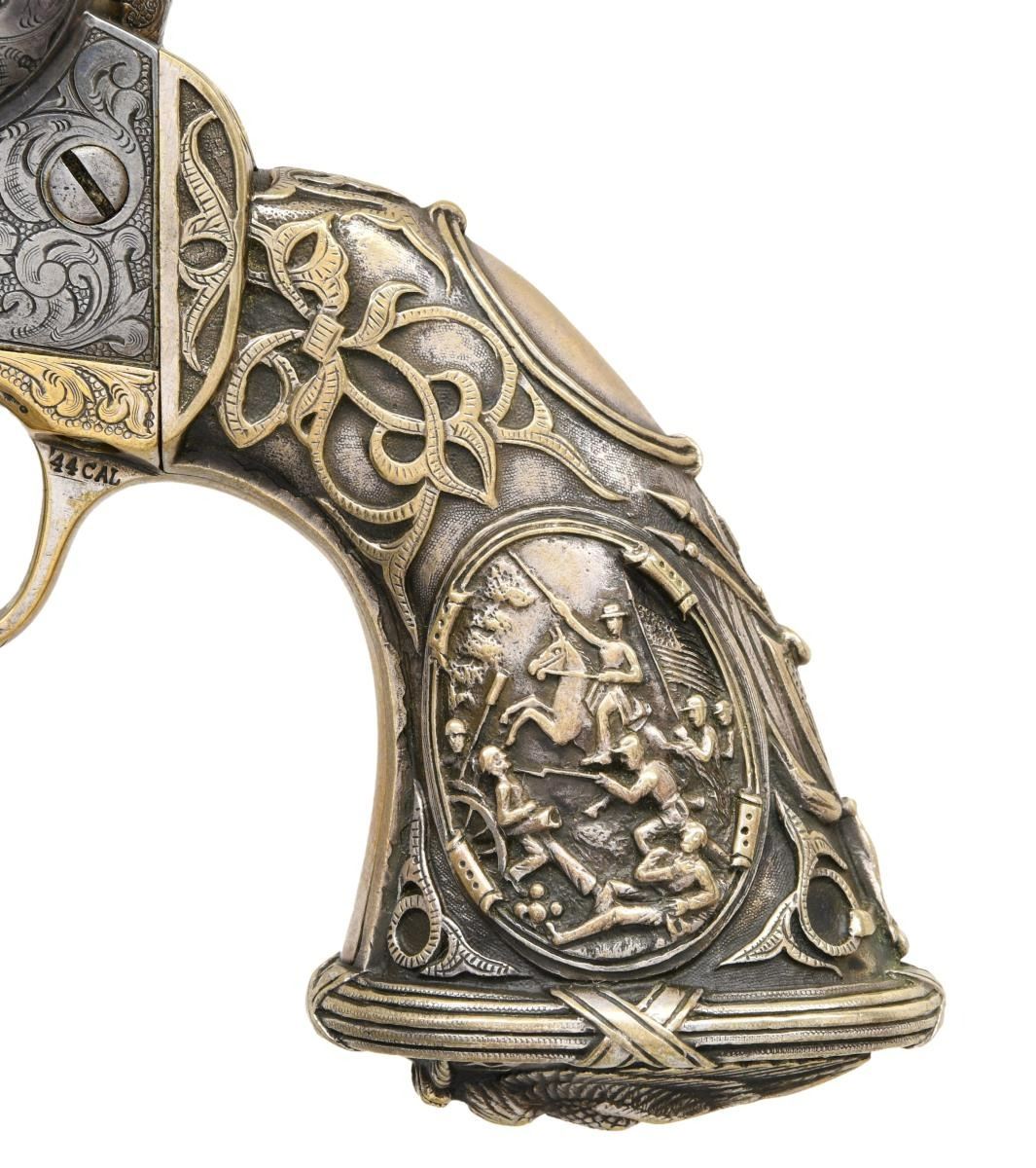 ARMY REVOLVER, "TIFFANY" CIVIL WAR BATTLE SCENE METAL GRIPS. Cal. 44, S# 180417. The rarest of "Tiffany" all metal grips have Civil War battle scene panels. Most of these grips are found on cartridge conversions and no more than a handful survive on percussion revolvers, especially the large frame armies. There are a pair of cased army revolvers given to the president of Peru in 1870 with identical grips, this revolver is also shown in L. D. Nimschke record book. Another engraved pair with identical grips are found in the Smithsonian Institution collection (photos of both accompany this lot). There has been much written about these grips and their manufacture by Larry Wilson in his early texts attributed these to Tiffany manufacture. Later published research by Marlin Polhemus shows these are most likely the product of Wexell and Degress of Mexico City. Wexel & Degress sold these grips to Colt; Schuyler, Hartley & Graham; and others, based on receipts. These beautiful, raised relief metal grips were mounted on custom Nimschke engraved Schuyler Hartley & Graham marketed revolvers who illustrated these grips in their 1864 catalog. Regardless of the manufacturer, whether it was Ames, or Wexell & Degress; the Nimschke shop, SH&G, and Tiffany all utilized these grips on their most special revolvers. There are several different fancy relief grips, these are by far the rarest with Civil War battle scenes. Revolver is in standard configuration, 8" barrel with one line New York address, scroll engraving a very similar form can be found in the accompanying pages from Wilson's engraving books attributed to Nimschke shop. This revolver based on serial number was manufactured in 1869, many of these revolvers stayed in factory and were converted to cartridge. This example has survived in fine original percussion configuration. UNATTACHED ACCESSORIES: copy of pages of similar engraved guns from Larry Wilson's "Colt Engraving Book" & auction receipt. CONDITION: fine overall, retaining much of its original silver wash, crisp markings including engraving. Revolver is original, complete and matching. Mechanically fine, crisp rifled bore. PROVENANCE: James D Julia Auctions March 13, 2006, Lot 177. (01-25217/JS). ANTIQUE. $20,000-25,000.