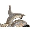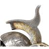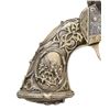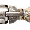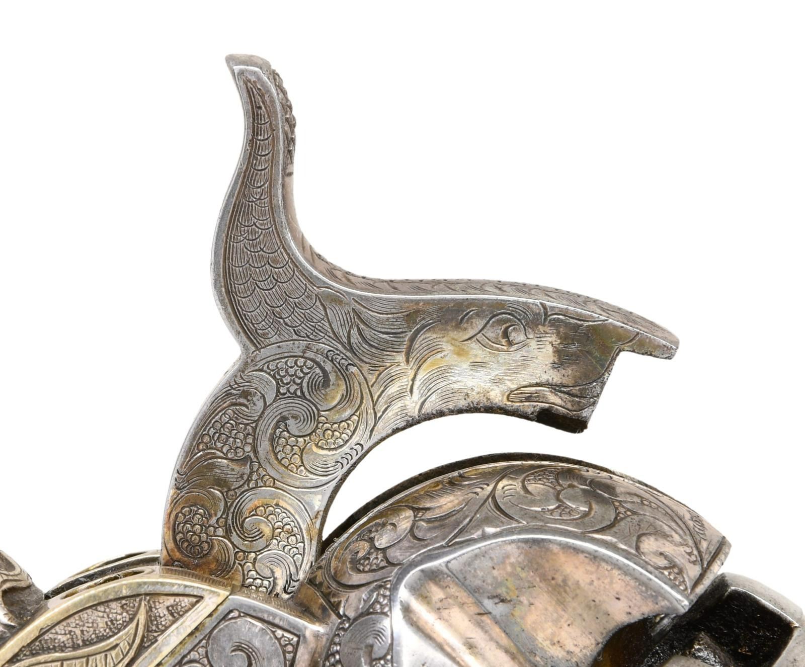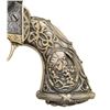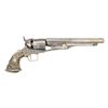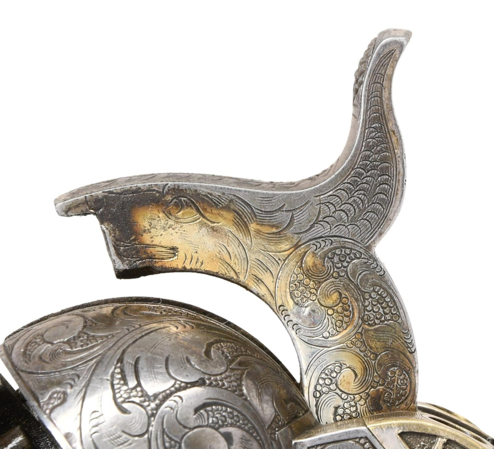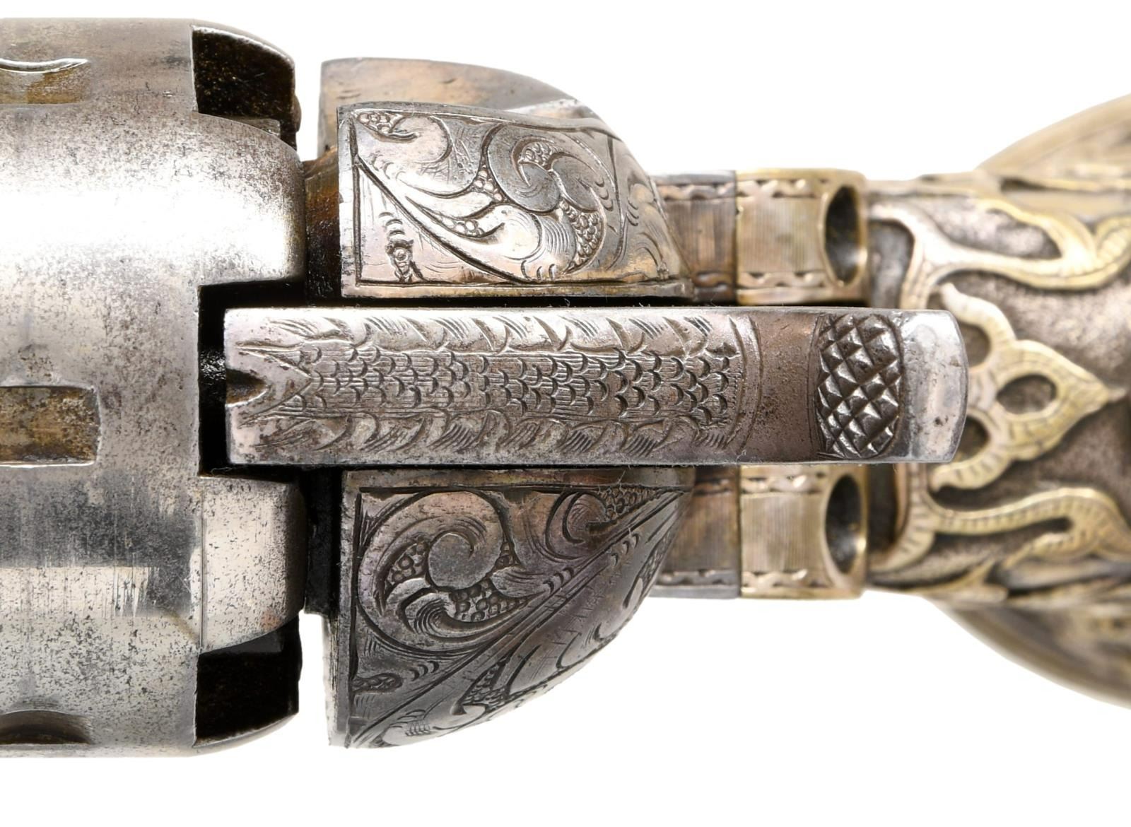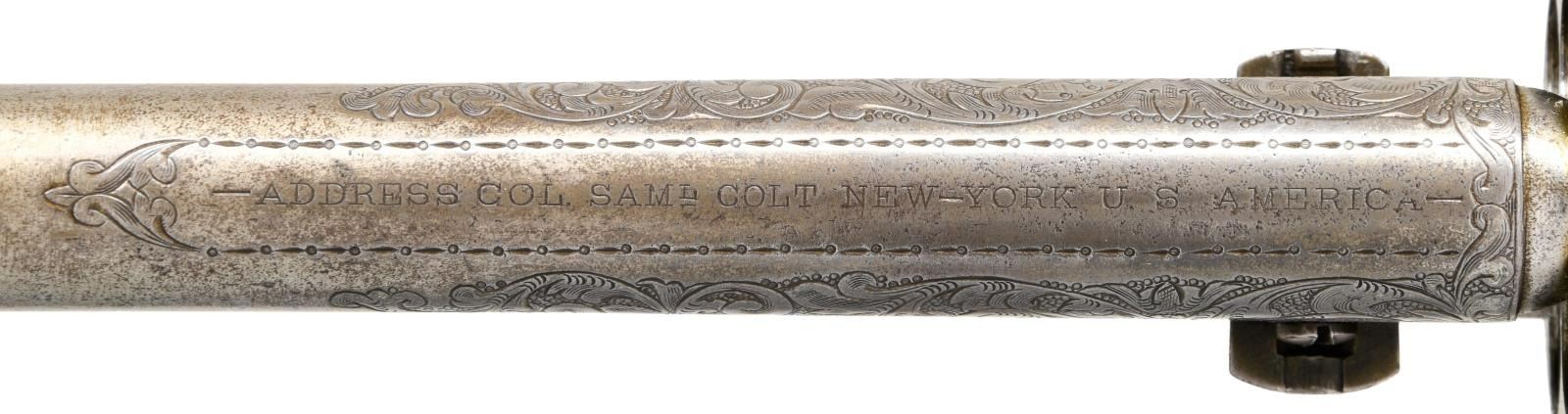 ARMY REVOLVER, "TIFFANY" CIVIL WAR BATTLE SCENE METAL GRIPS. Cal. 44, S# 180417. The rarest of "Tiffany" all metal grips have Civil War battle scene panels. Most of these grips are found on cartridge conversions and no more than a handful survive on percussion revolvers, especially the large frame armies. There are a pair of cased army revolvers given to the president of Peru in 1870 with identical grips, this revolver is also shown in L. D. Nimschke record book. Another engraved pair with identical grips are found in the Smithsonian Institution collection (photos of both accompany this lot). There has been much written about these grips and their manufacture by Larry Wilson in his early texts attributed these to Tiffany manufacture. Later published research by Marlin Polhemus shows these are most likely the product of Wexell and Degress of Mexico City. Wexel & Degress sold these grips to Colt; Schuyler, Hartley & Graham; and others, based on receipts. These beautiful, raised relief metal grips were mounted on custom Nimschke engraved Schuyler Hartley & Graham marketed revolvers who illustrated these grips in their 1864 catalog. Regardless of the manufacturer, whether it was Ames, or Wexell & Degress; the Nimschke shop, SH&G, and Tiffany all utilized these grips on their most special revolvers. There are several different fancy relief grips, these are by far the rarest with Civil War battle scenes. Revolver is in standard configuration, 8" barrel with one line New York address, scroll engraving a very similar form can be found in the accompanying pages from Wilson's engraving books attributed to Nimschke shop. This revolver based on serial number was manufactured in 1869, many of these revolvers stayed in factory and were converted to cartridge. This example has survived in fine original percussion configuration. UNATTACHED ACCESSORIES: copy of pages of similar engraved guns from Larry Wilson's "Colt Engraving Book" & auction receipt. CONDITION: fine overall, retaining much of its original silver wash, crisp markings including engraving. Revolver is original, complete and matching. Mechanically fine, crisp rifled bore. PROVENANCE: James D Julia Auctions March 13, 2006, Lot 177. (01-25217/JS). ANTIQUE. $20,000-25,000.